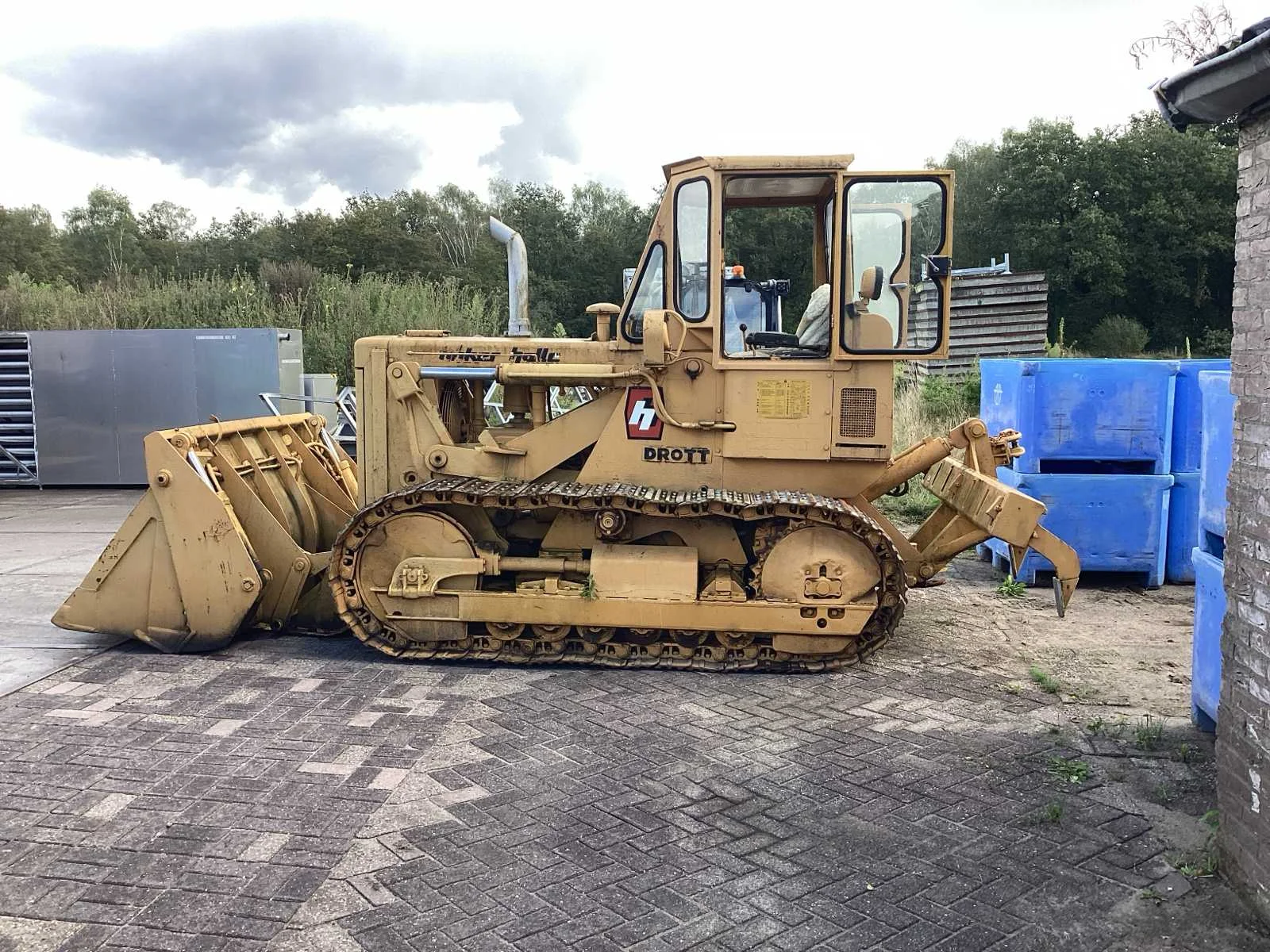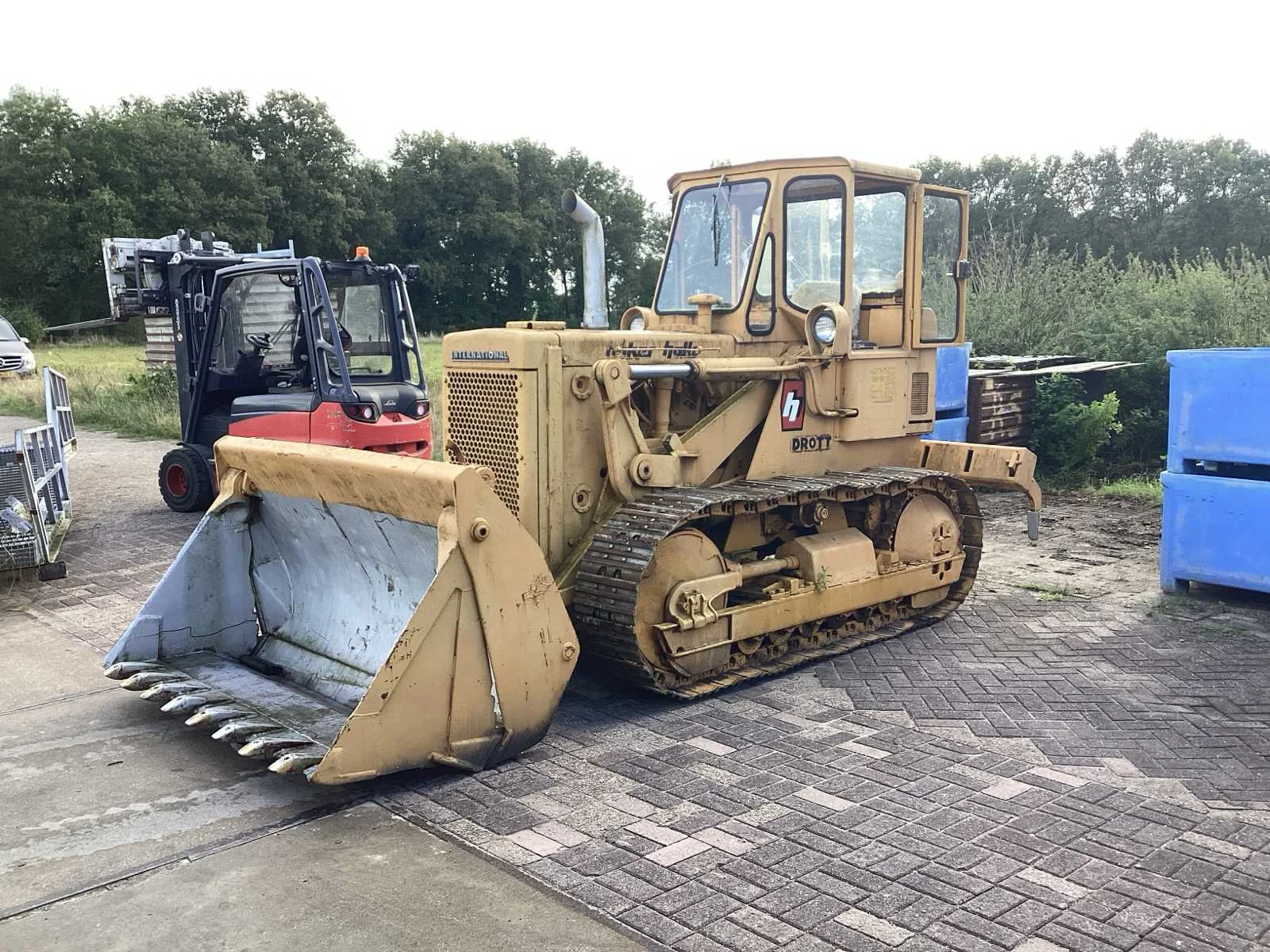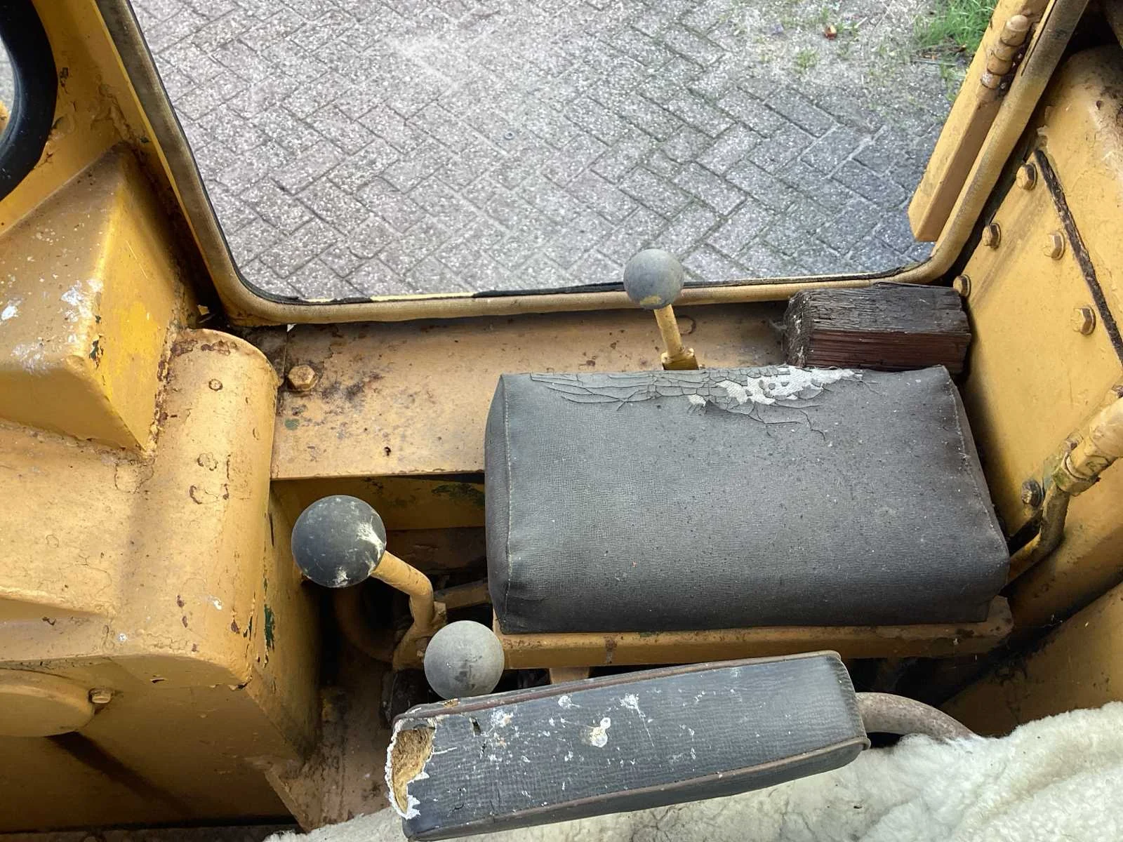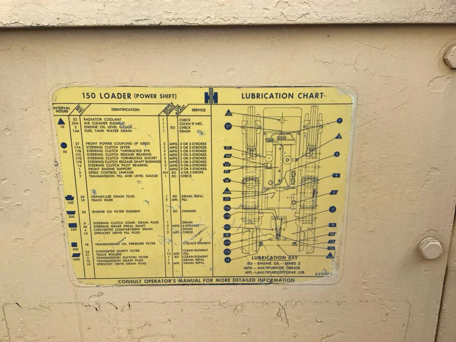 V.v. woeler; 3 standen bak; motor loopt; machine rij niet voor of achteruit Merk: International Type: 150 loader Aantal cilinders: 6 Totale afmeting L: 5200mm Totale afmeting Breedte: 2000mm Graafbak afm. b: 2000mm Totale afmeting Hoogte: 2650mm Eigen gewicht: 9000kg Cabine: true Bandenmaat: Rupsen Brandstof: Diesel