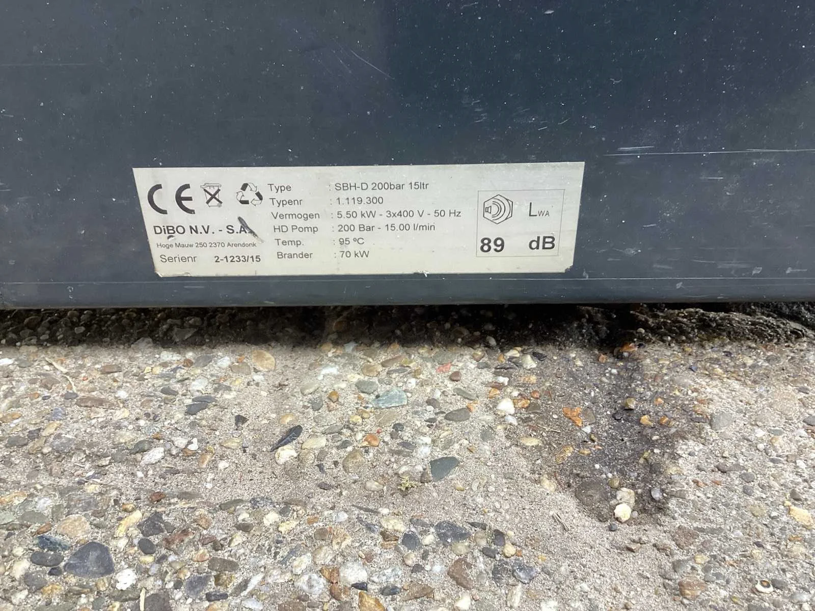 Voorzien van; schakelaar; werking onbekend Merk: Dibo Type: SBHD Serienummer: 2-1233/15 Maximale werkdruk: 200bar Dieselgestookt: true Vaste installatie: true Totale afmeting L: 820mm Totale afmeting Breedte: 920mm Totale afmeting Hoogte: 1000mm