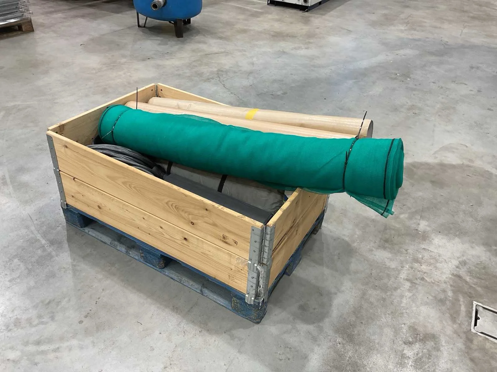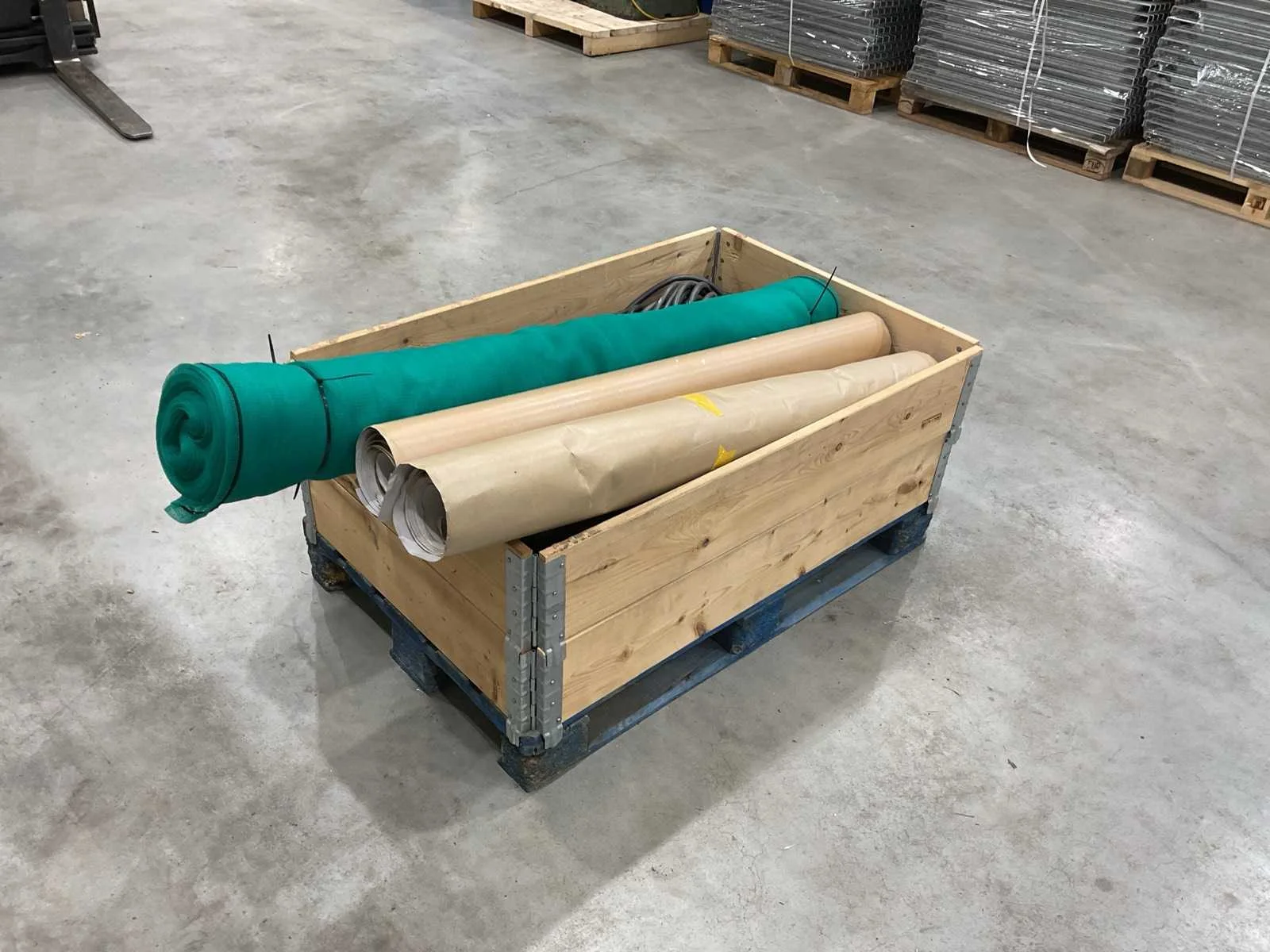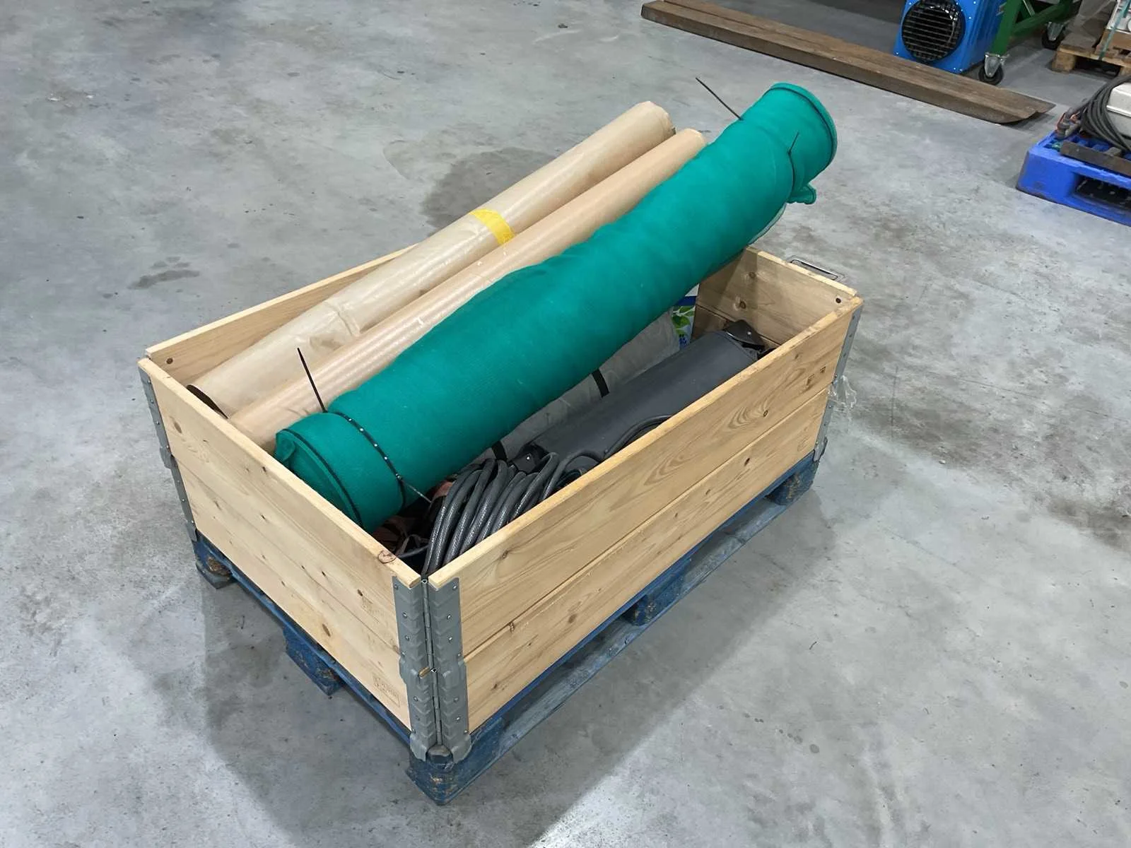 Voorzien van. 2 rollen Stucloper; 1 rol winddoek; tent; slang; div. Lengte: 80cm Breedte: 155cm Hoogte: 80cm