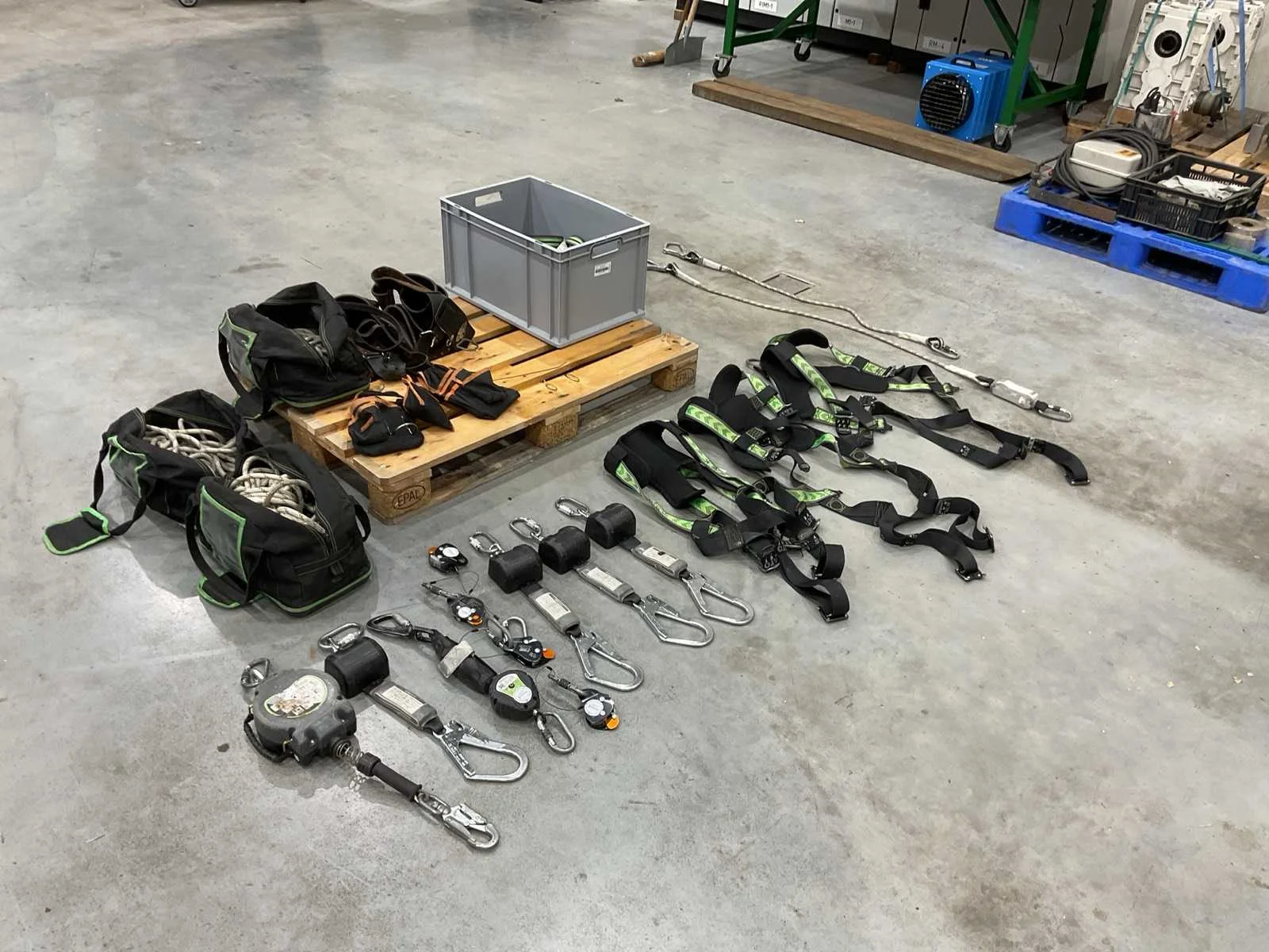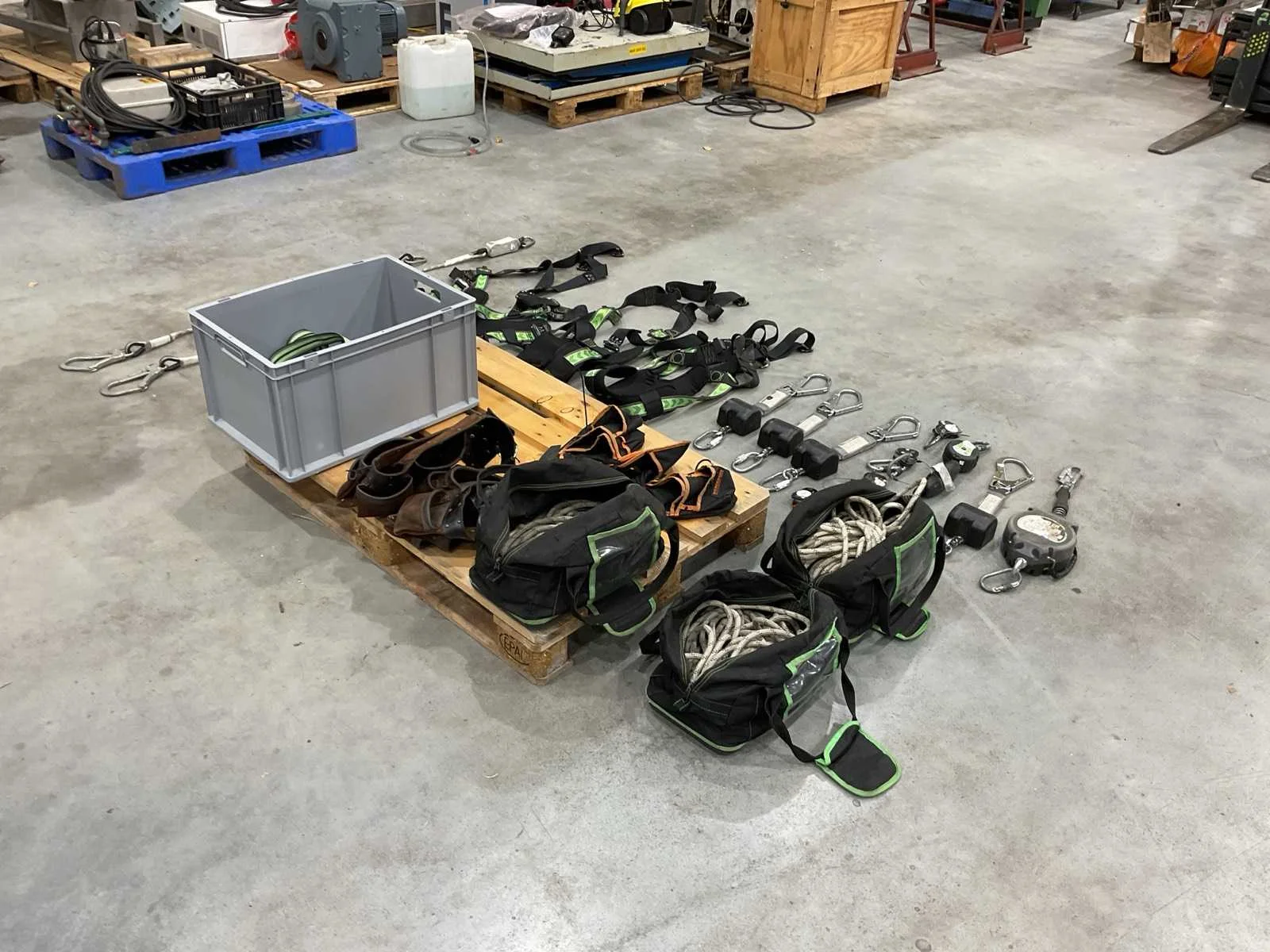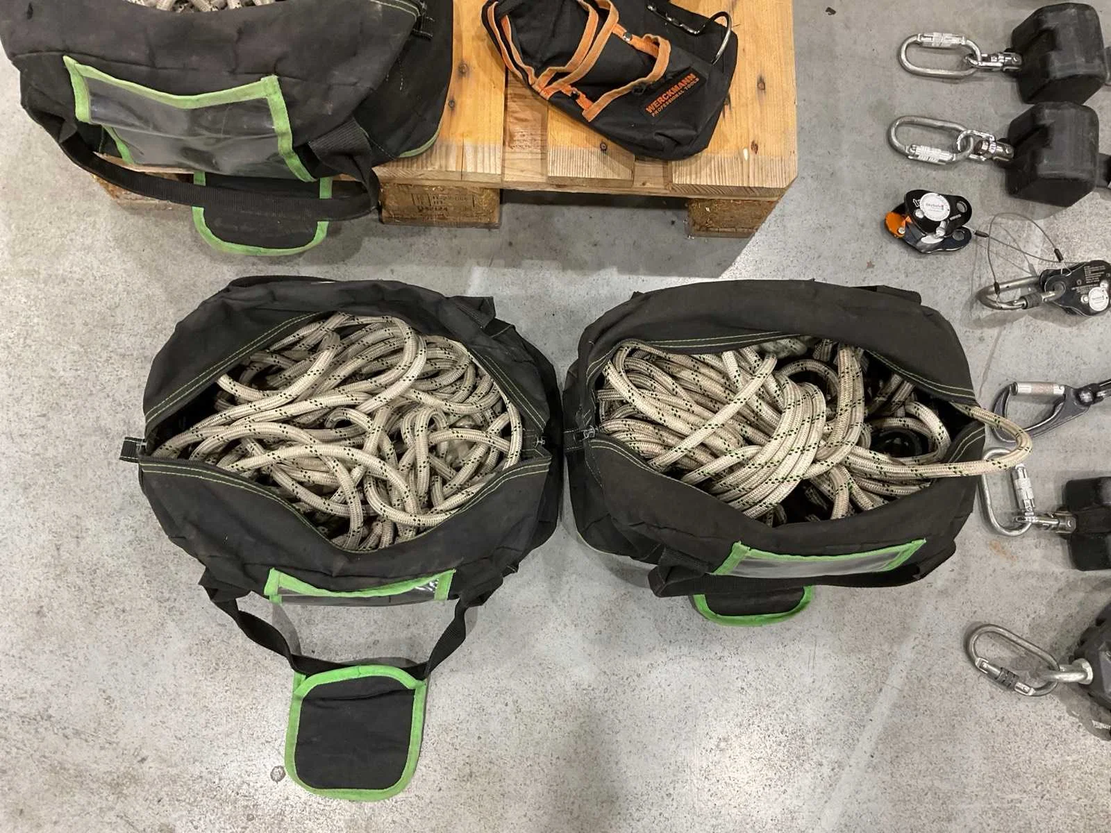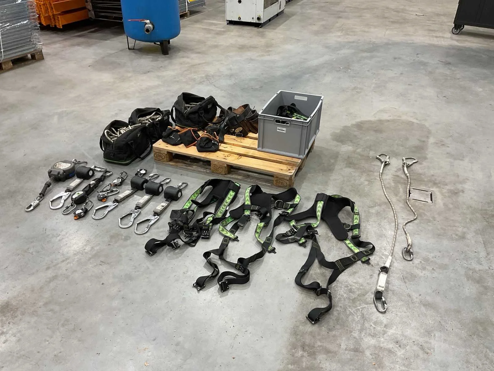 Voorzien van. 3x valbeveiliging harnas; 6x valstopblok; div klimtouw; 1x div