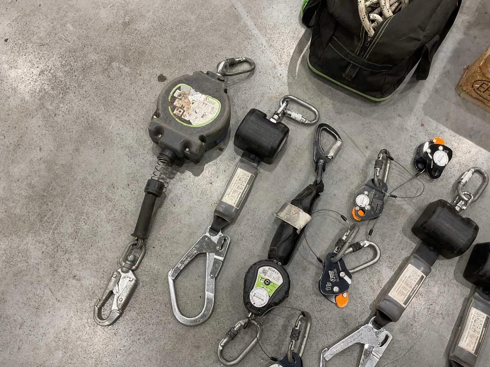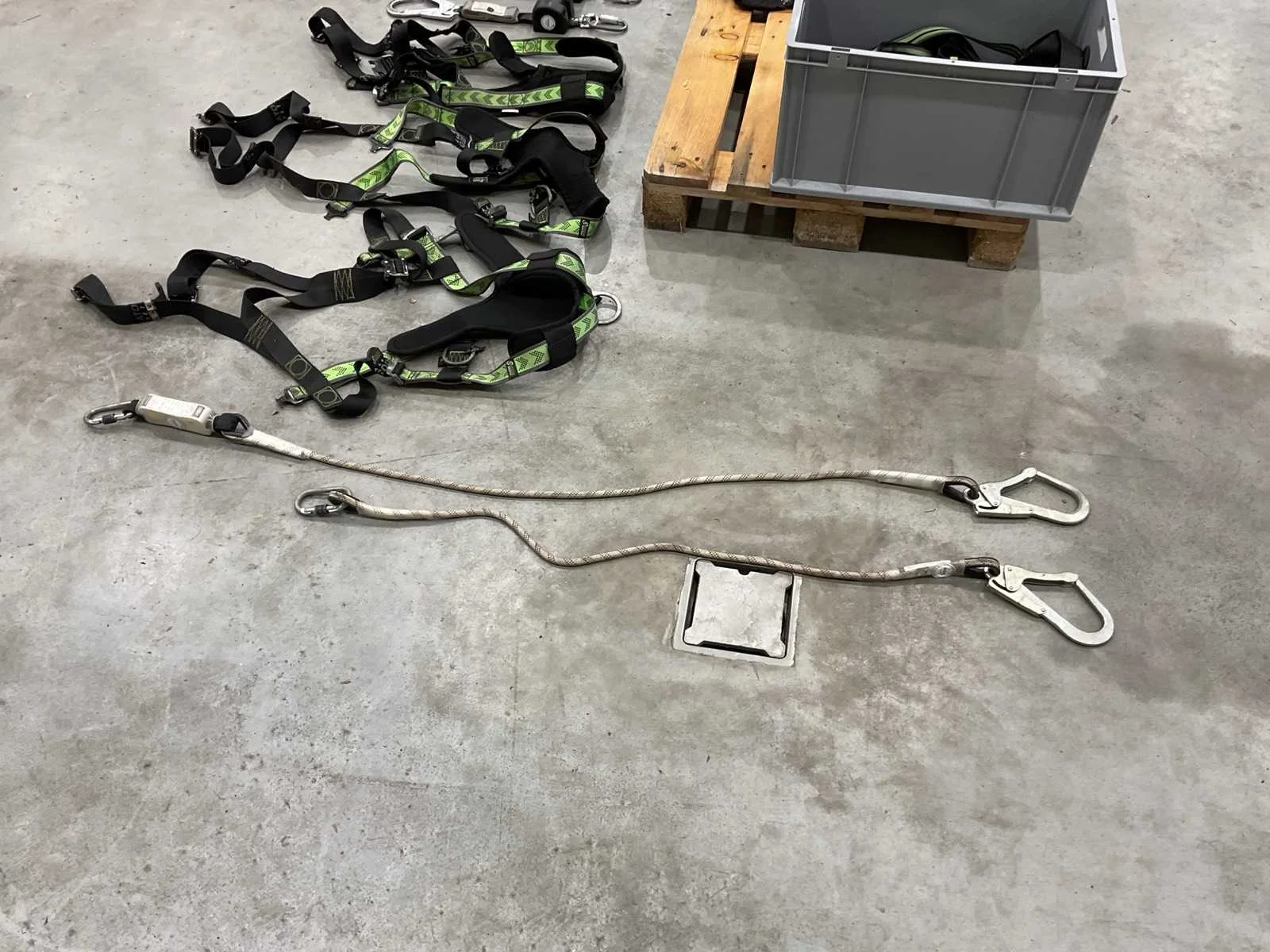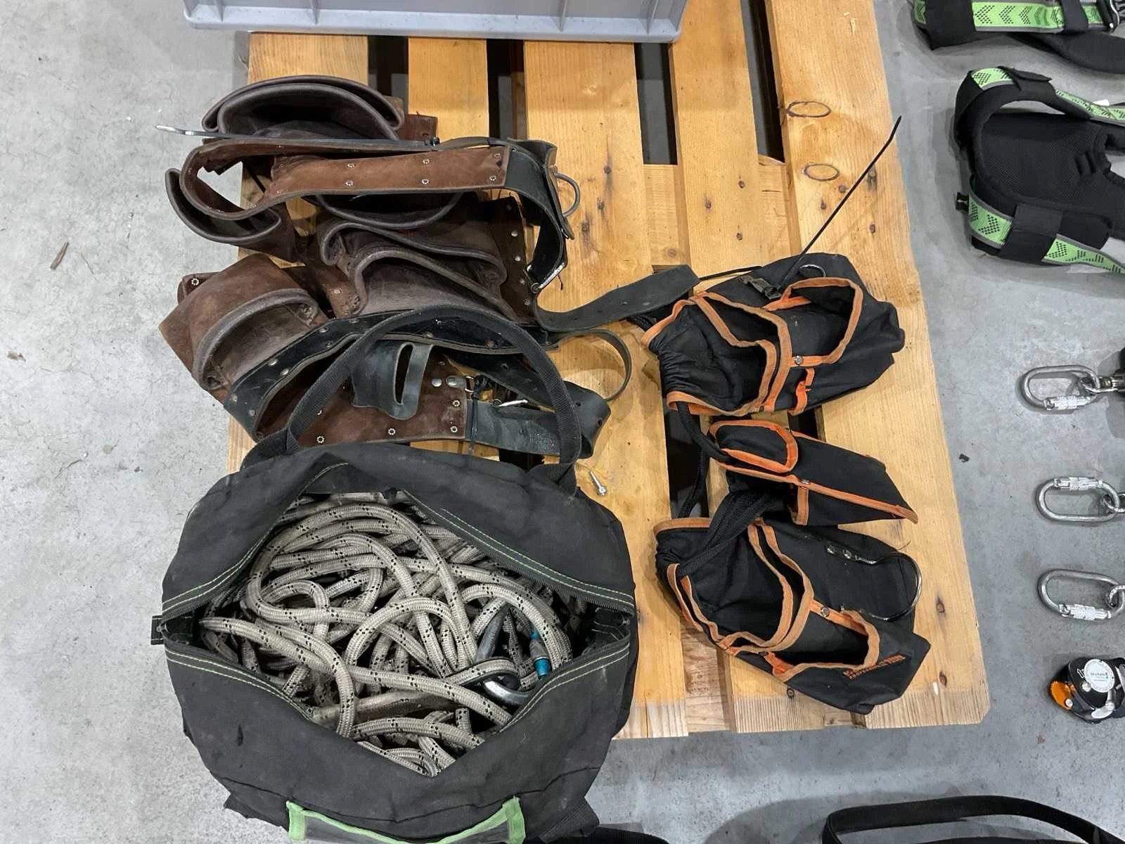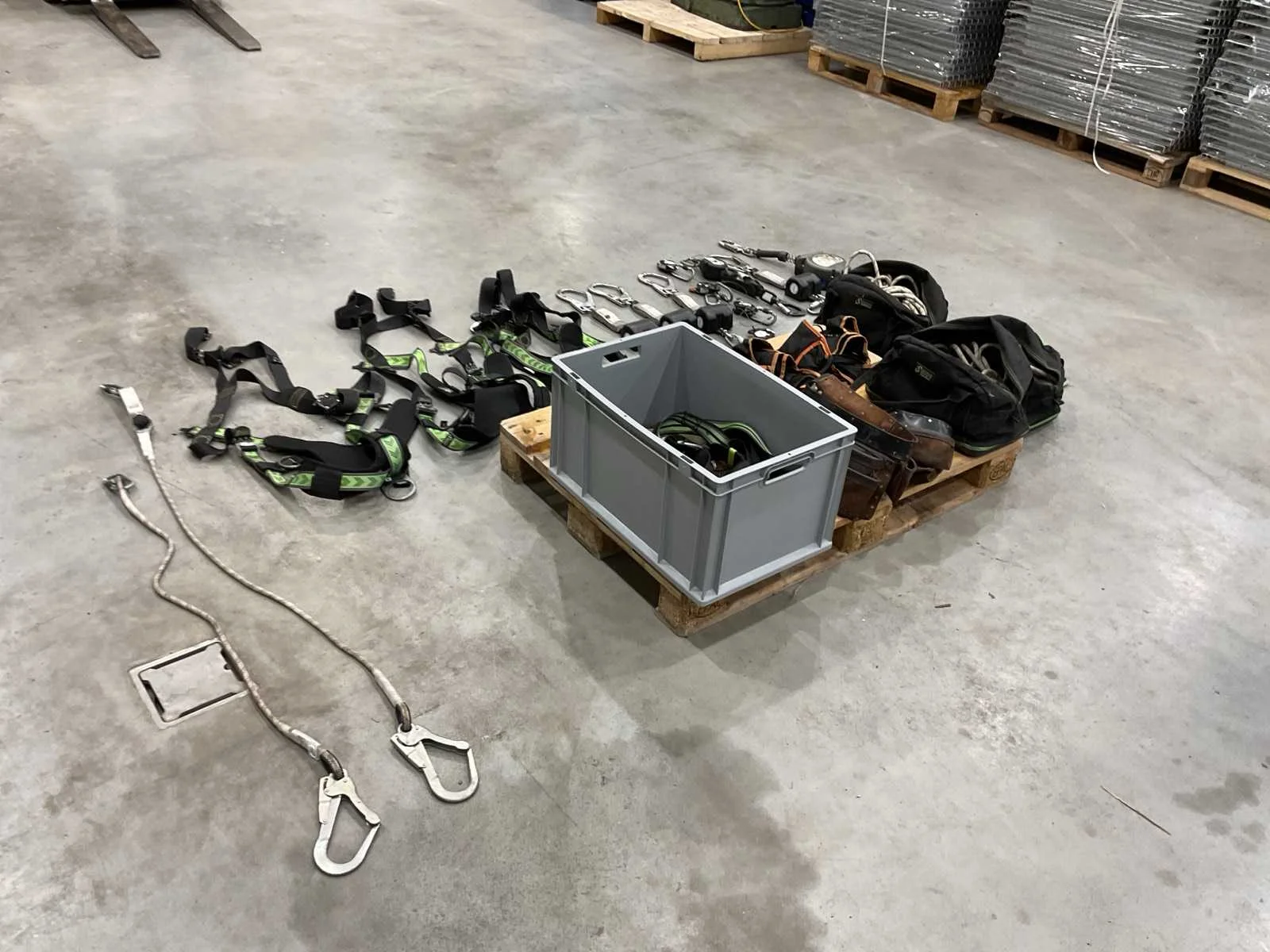 Voorzien van. 3x valbeveiliging harnas; 6x valstopblok; div klimtouw; 1x div