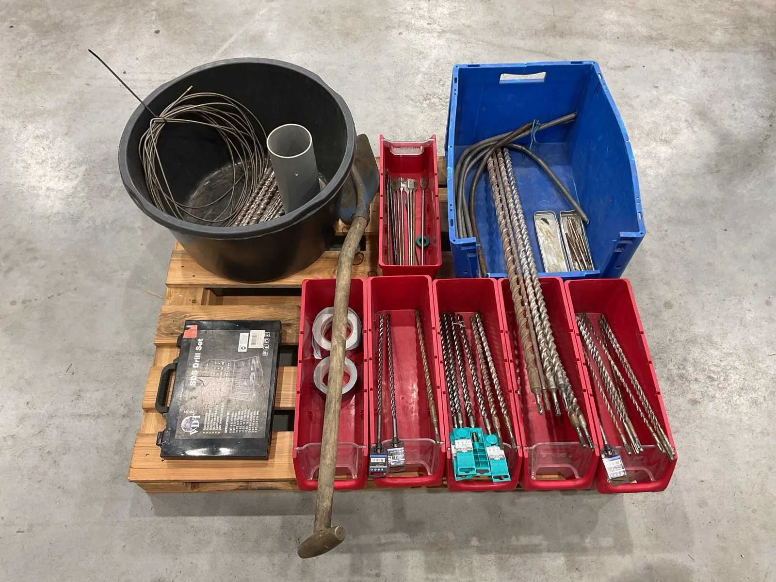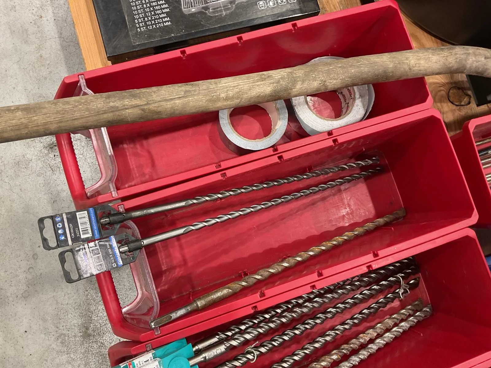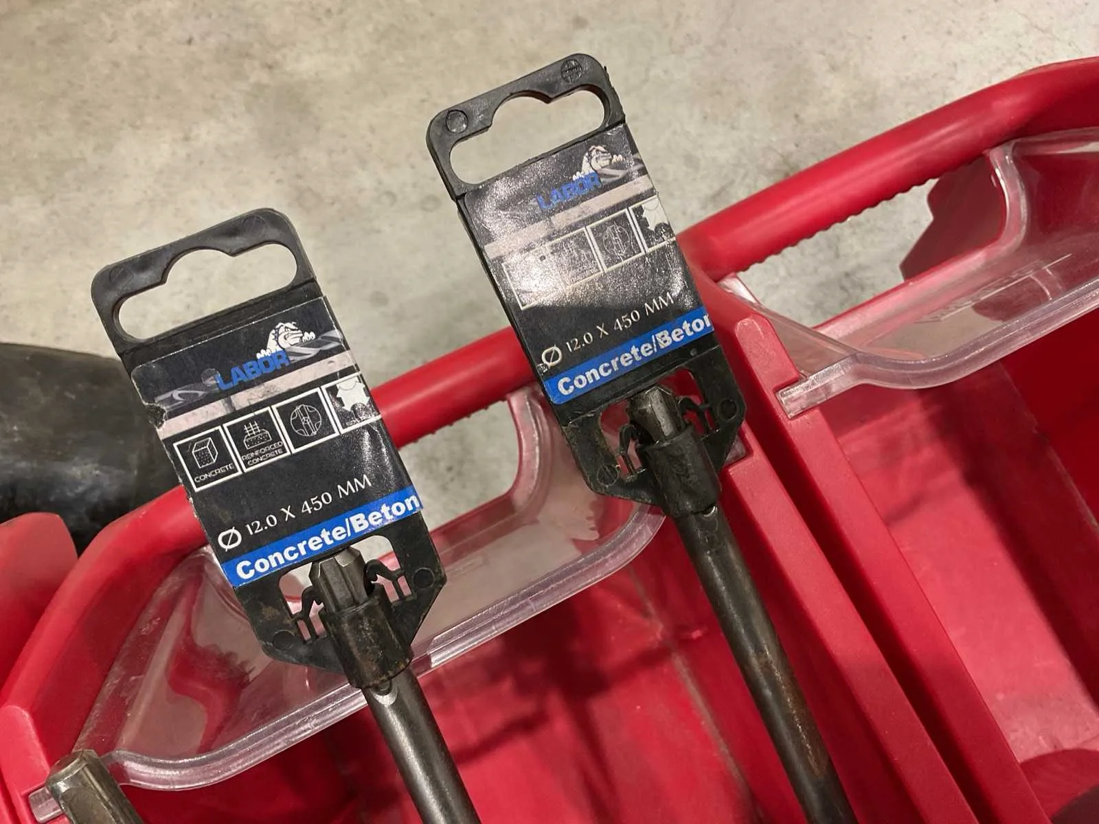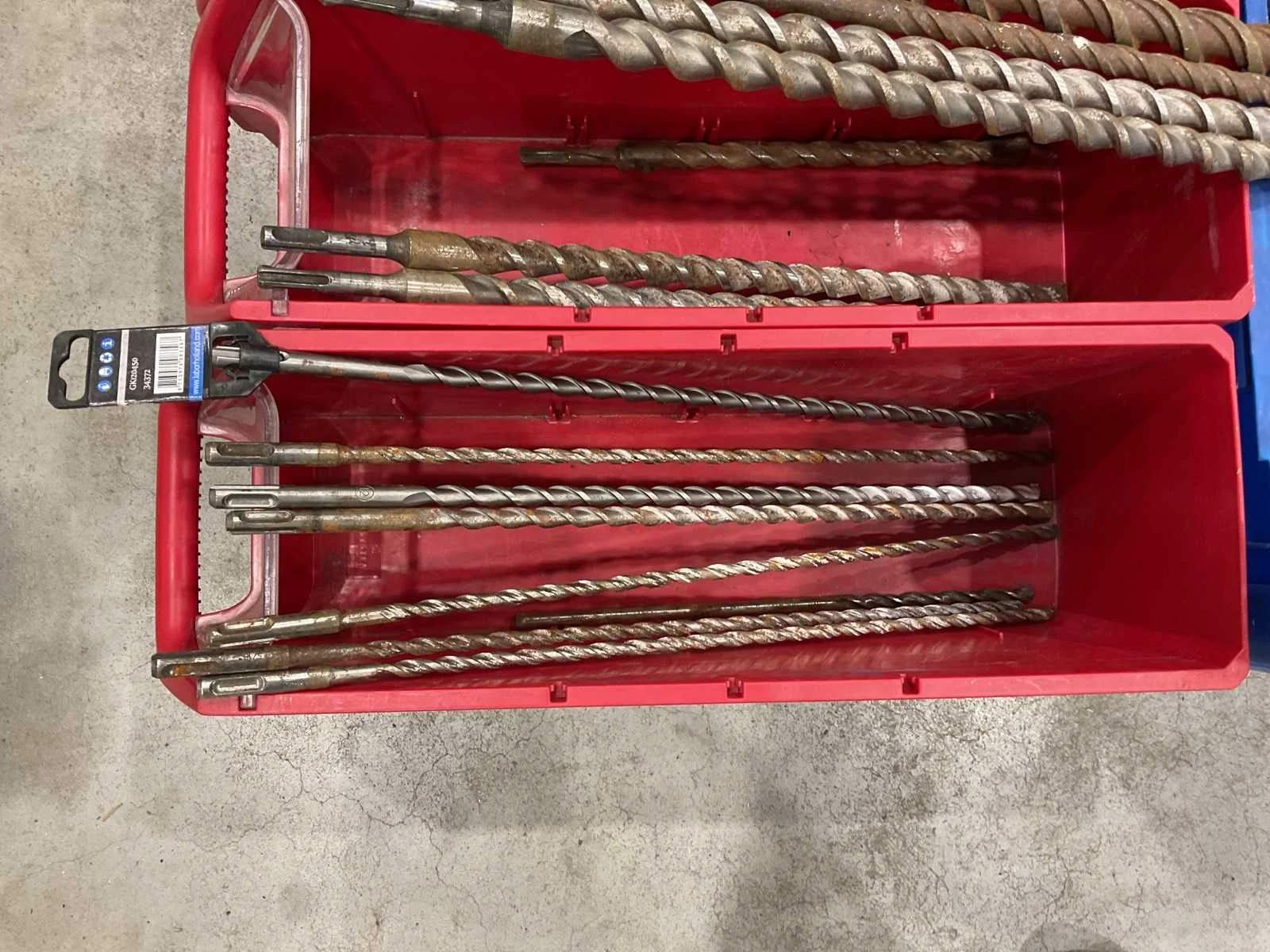 Meerdere steenboren gebruikt en nieuw; div lengtes; incl bakken SDS fitting: true Lengte: 1000mm Breedte: 1200mm