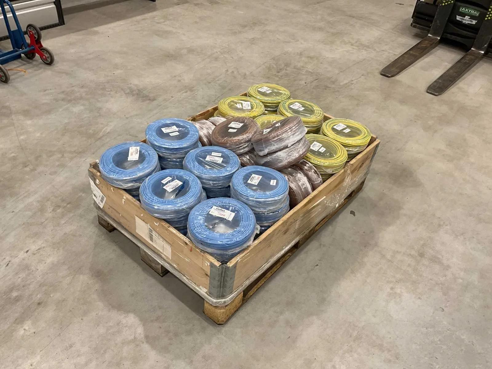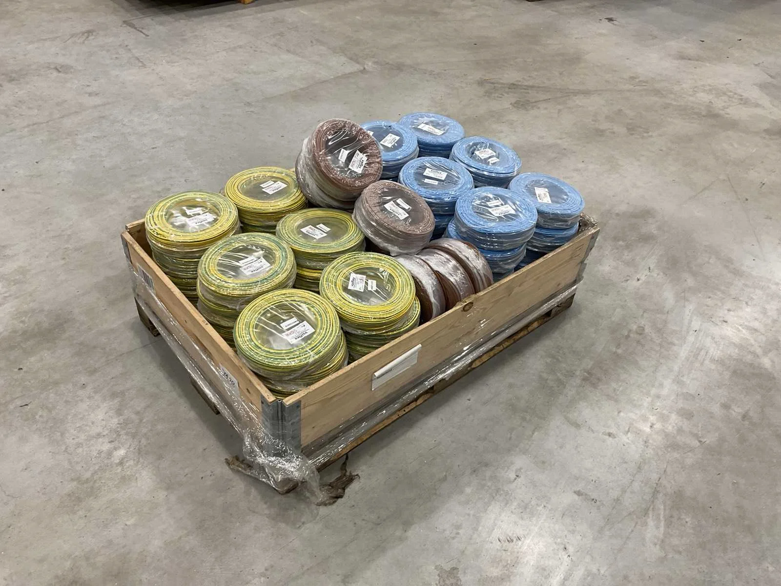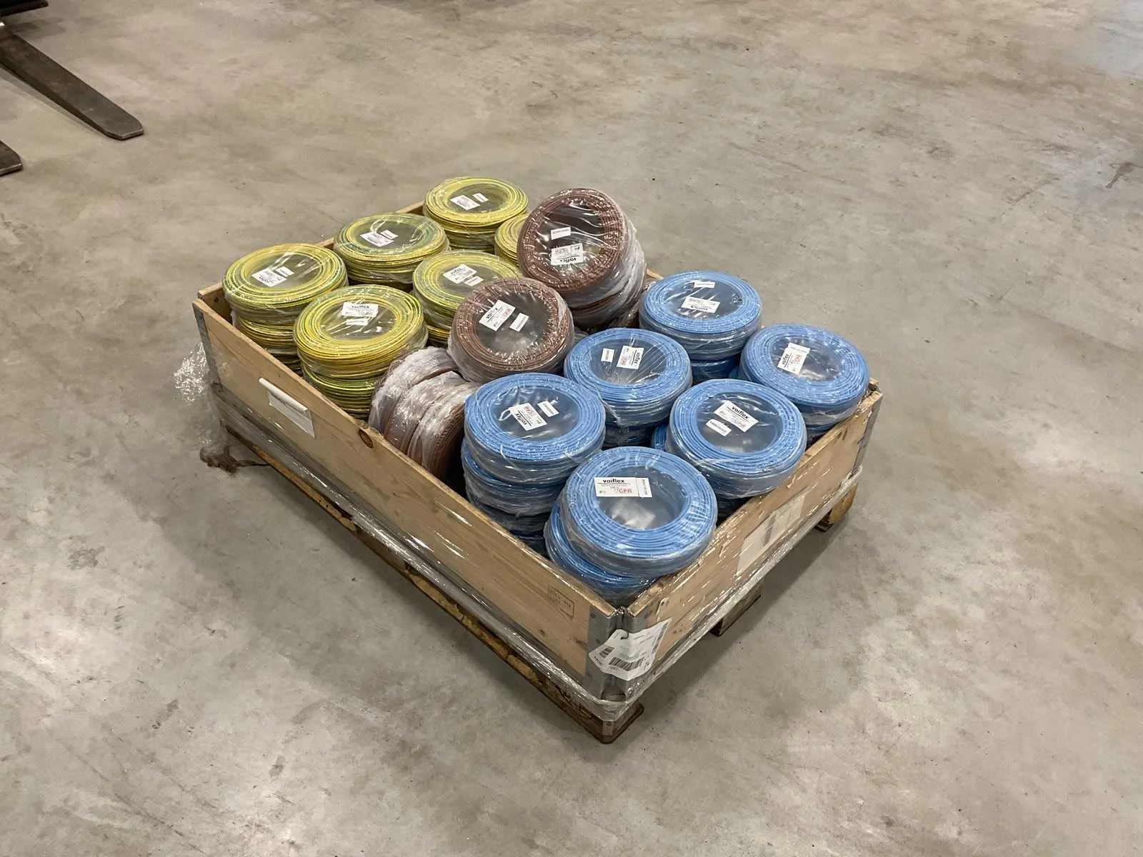 Voorzien van. 24 rollen geel groen 4,0mm2; 11 rollen bruin 4,0mm2; 24 rollen blauw 4,0mm2 Merk: Voiflex Product type: Draad Gewicht: 270kg Lengte: 120cm Breedte: 80cm Hoogte: 55cm Materiaal: Koper kabel