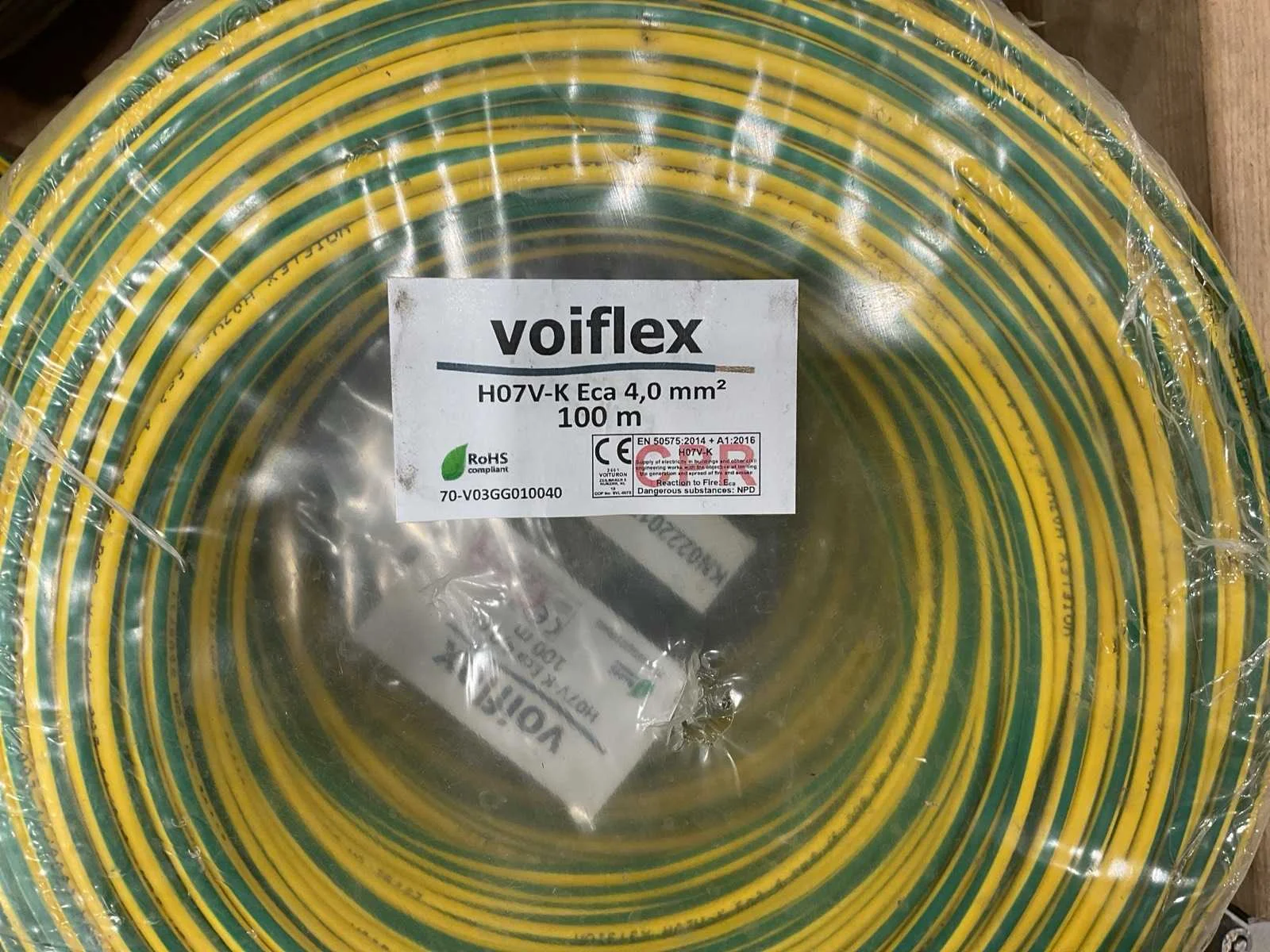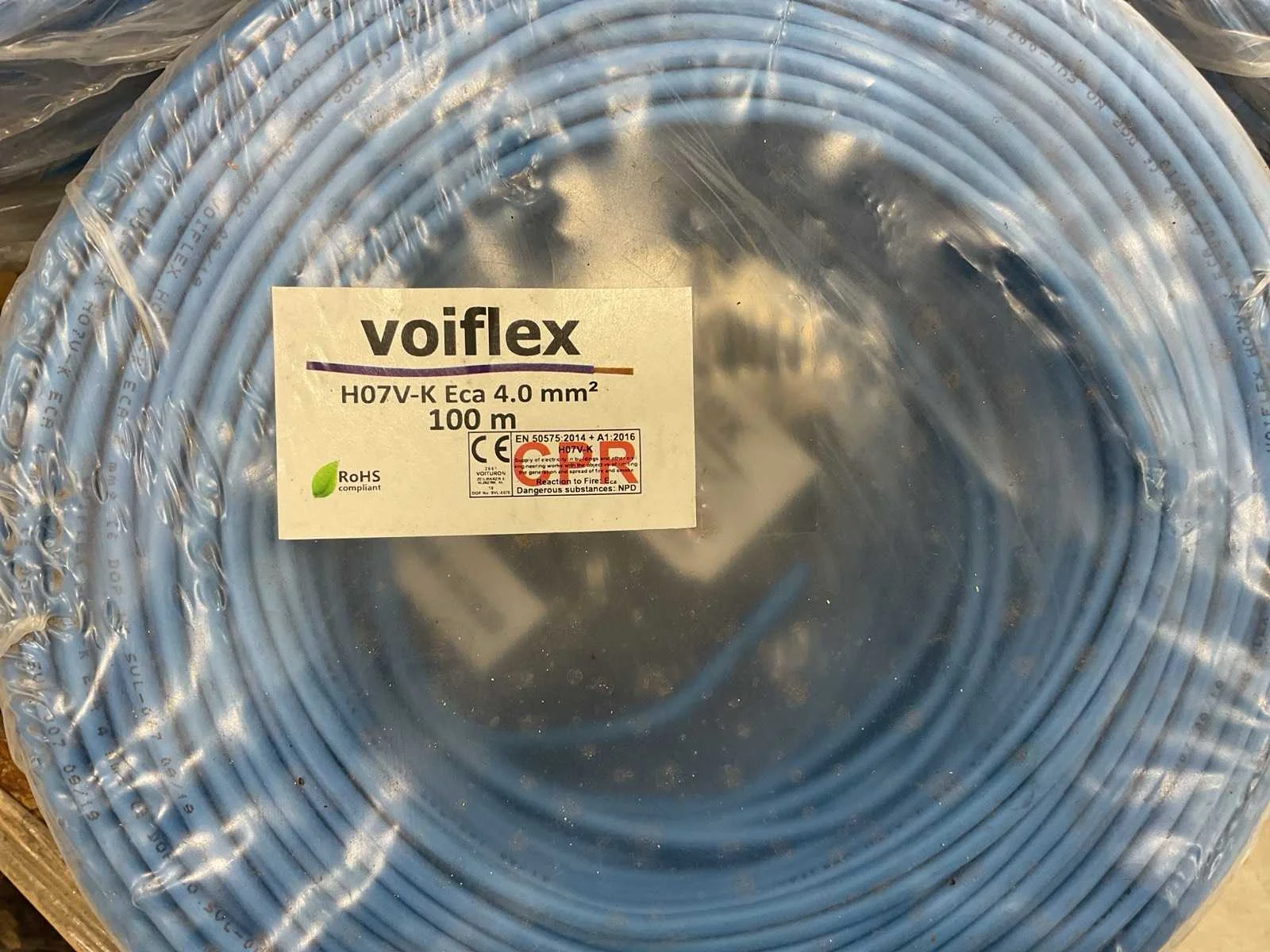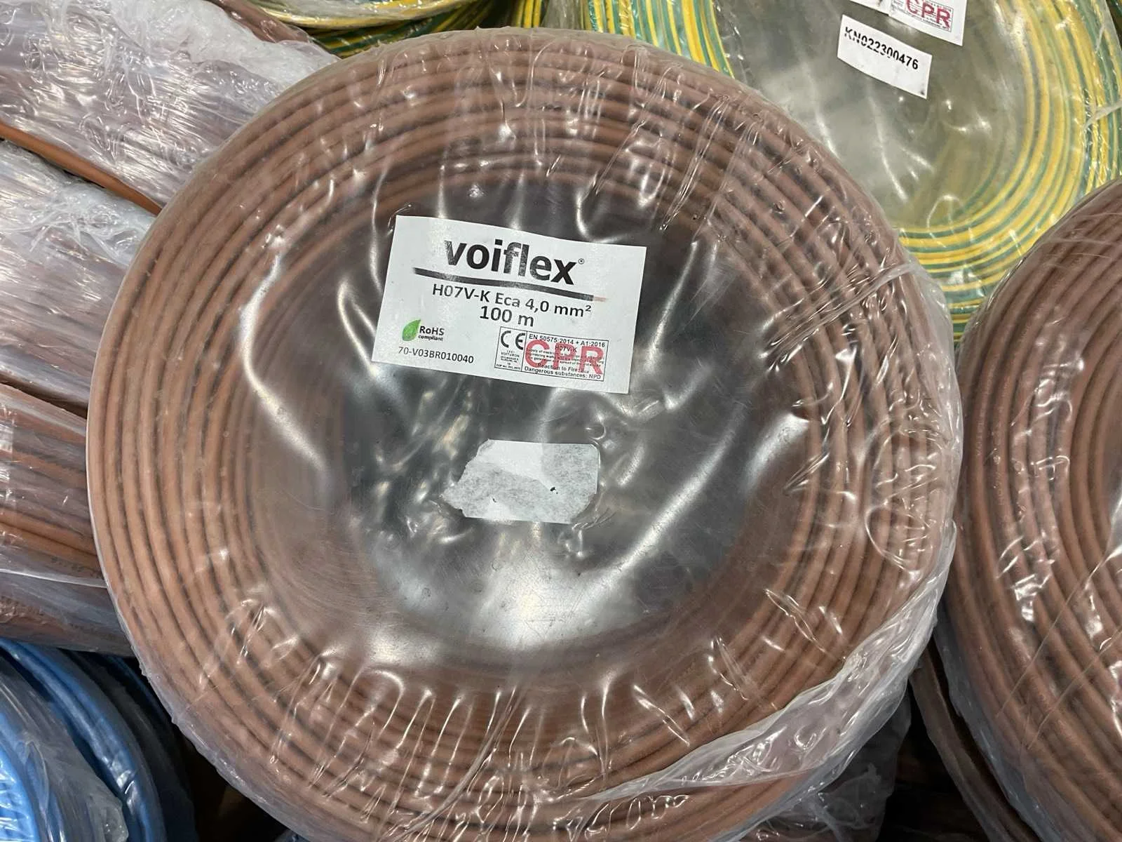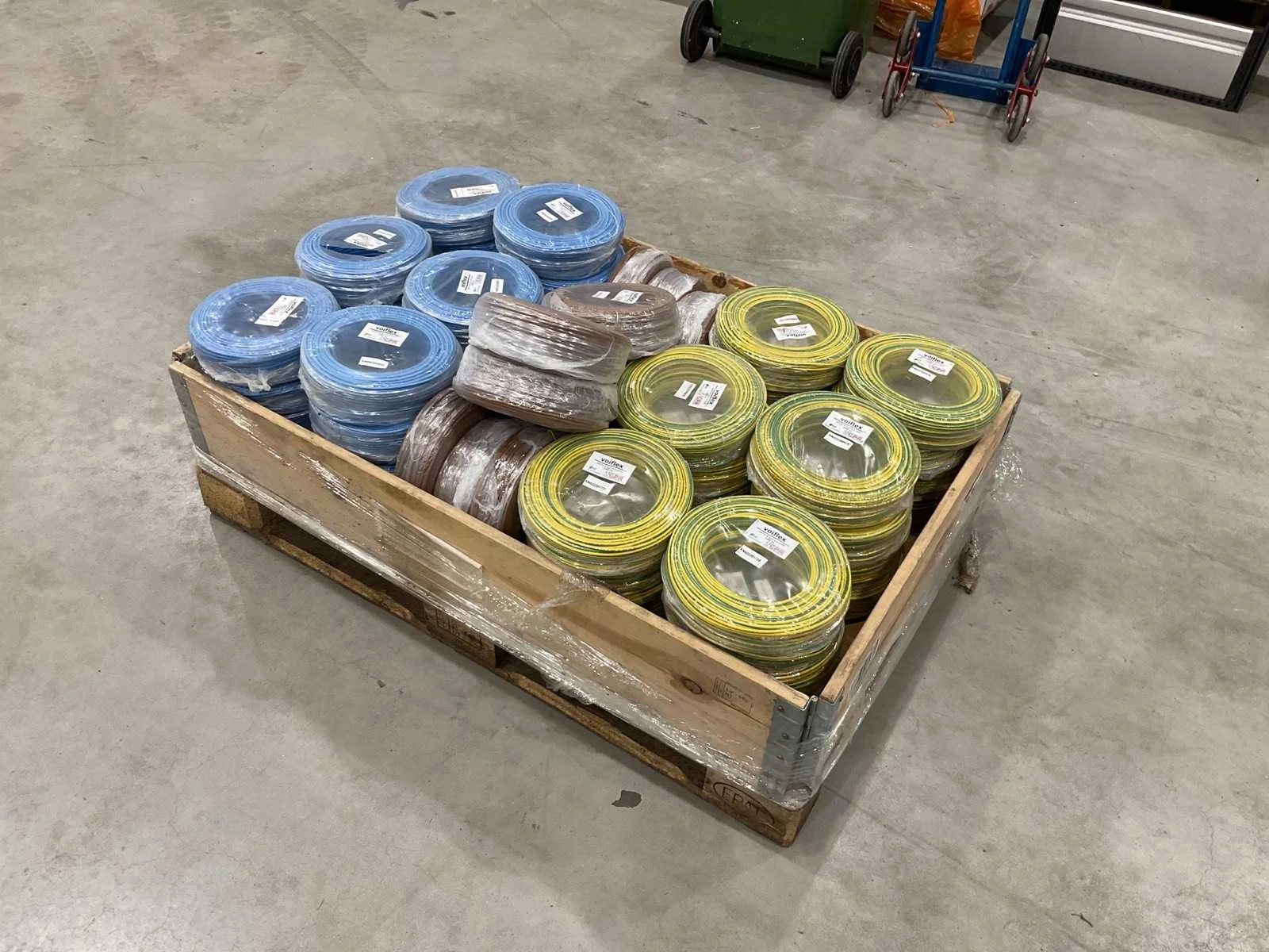 Voorzien van. 24 rollen geel groen 4,0mm2; 11 rollen bruin 4,0mm2; 24 rollen blauw 4,0mm2 Merk: Voiflex Product type: Draad Gewicht: 270kg Lengte: 120cm Breedte: 80cm Hoogte: 55cm Materiaal: Koper kabel