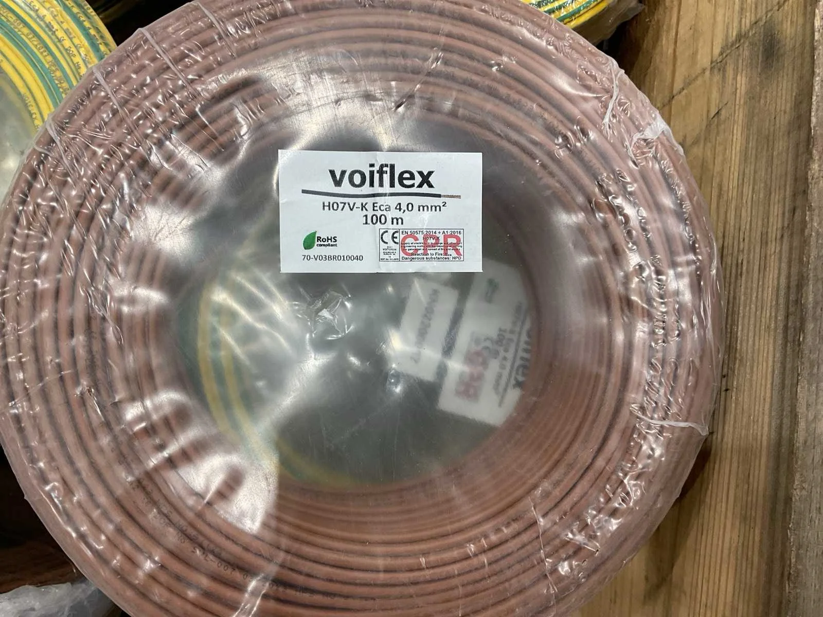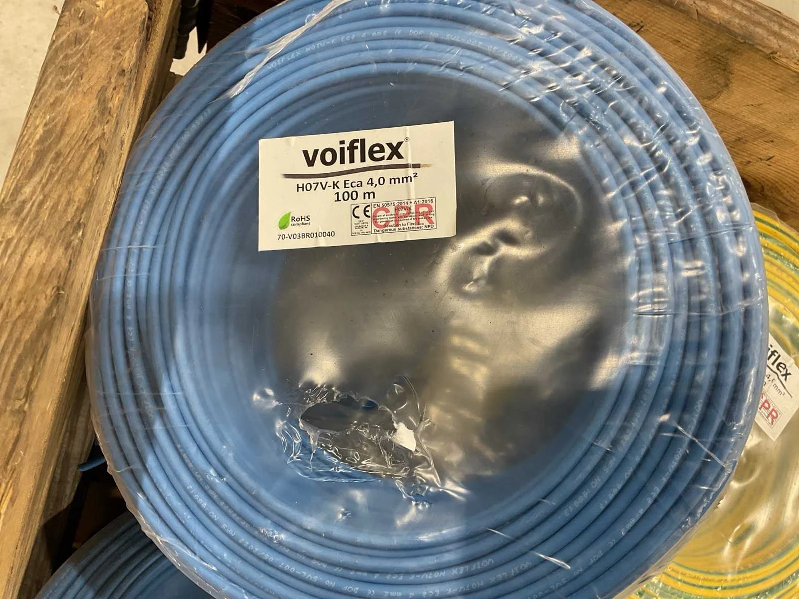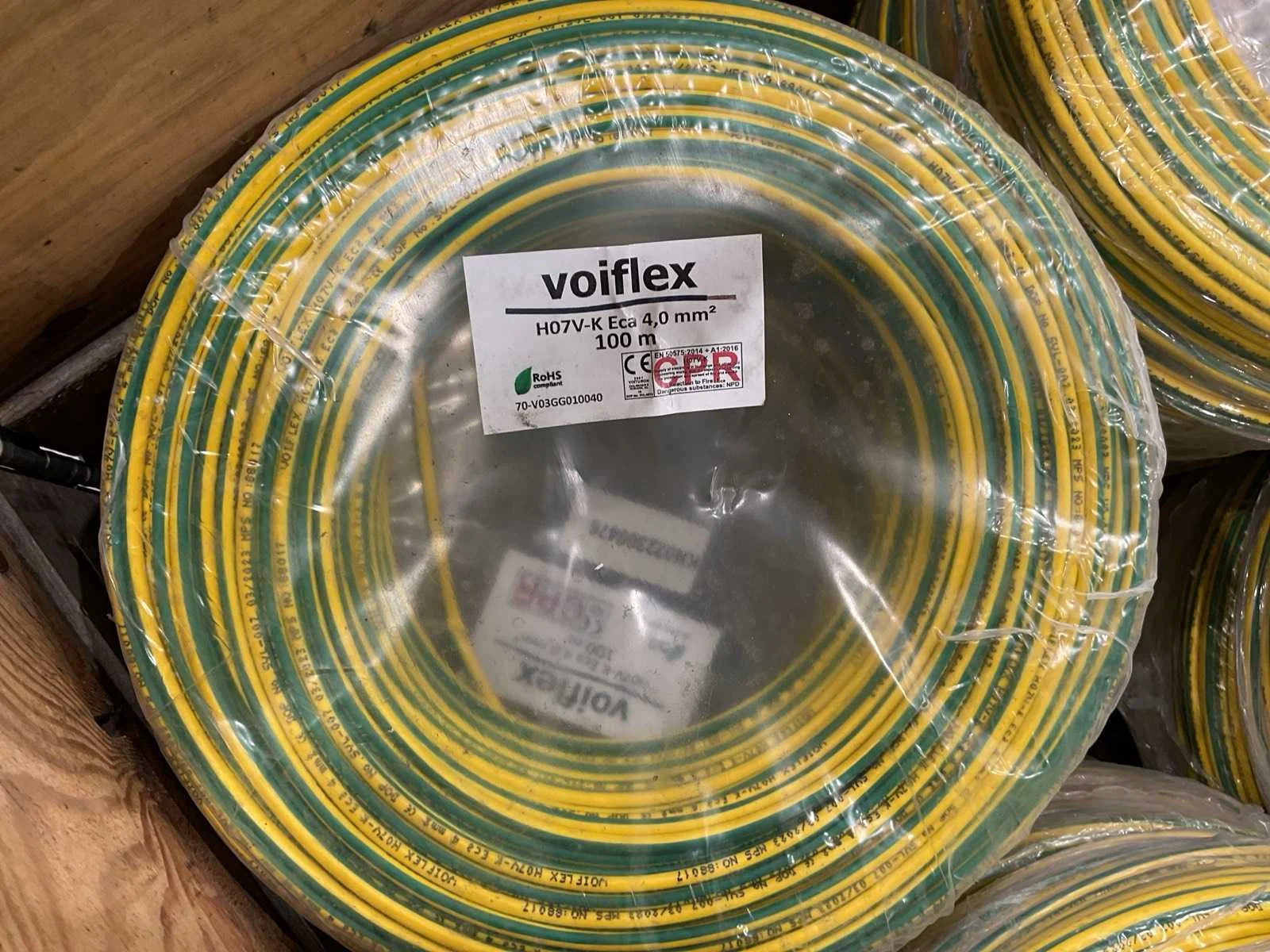 Voorzien van. 57 rollen geel groen 4,0mm2; 3 rollen bruin 4,0mm2; 4 rollen blauw 4,0mm2 Merk: Voiflex Product type: Draad Gewicht: 295kg Lengte: 120cm Breedte: 80cm Hoogte: 55cm Materiaal: Koper kabel