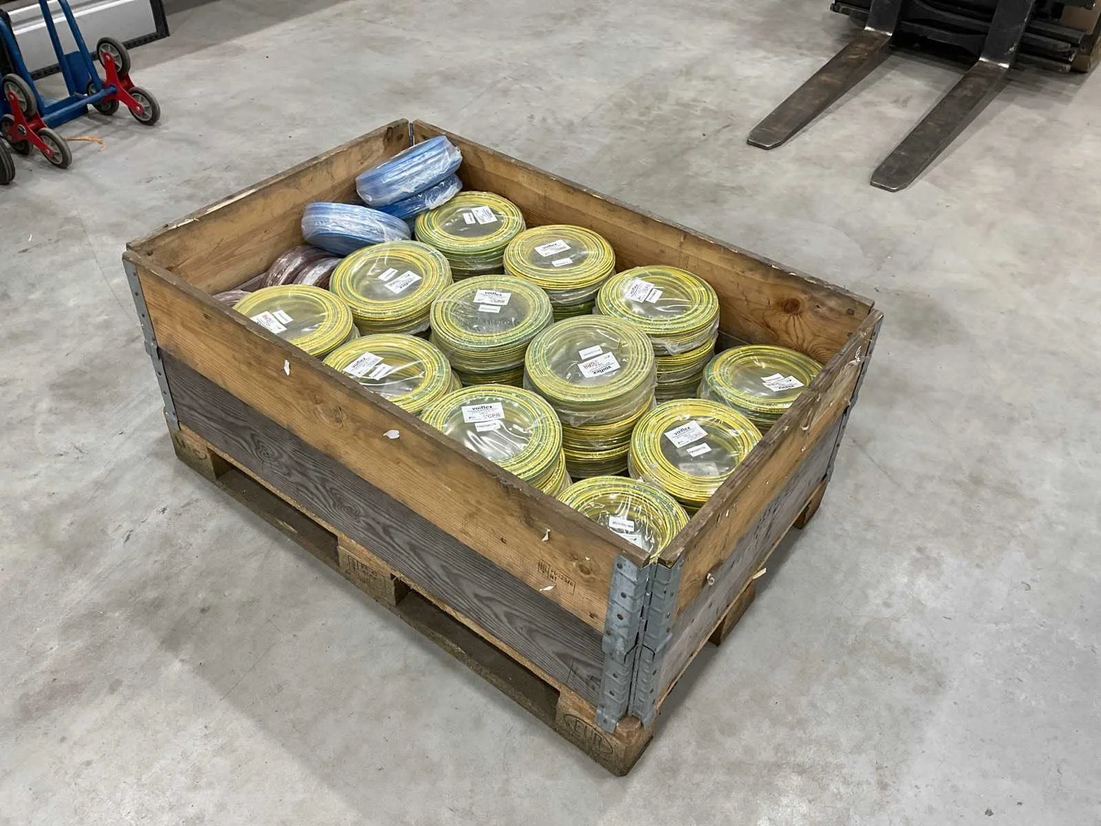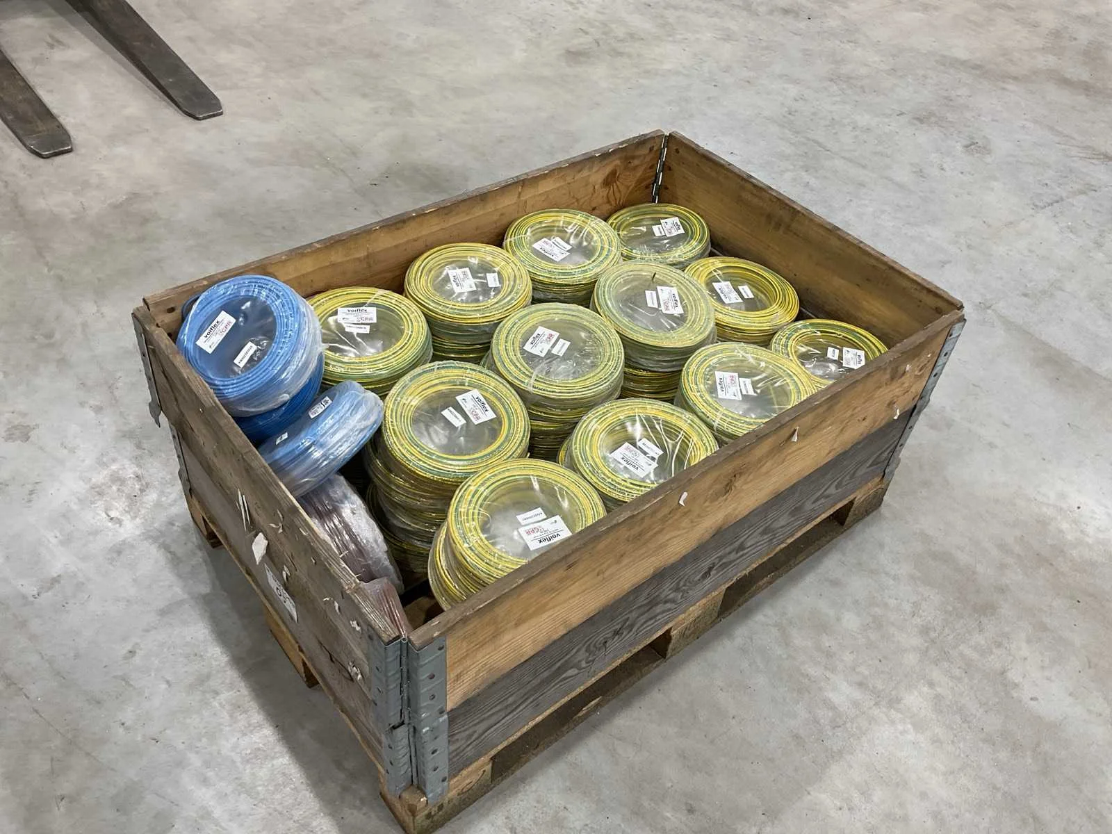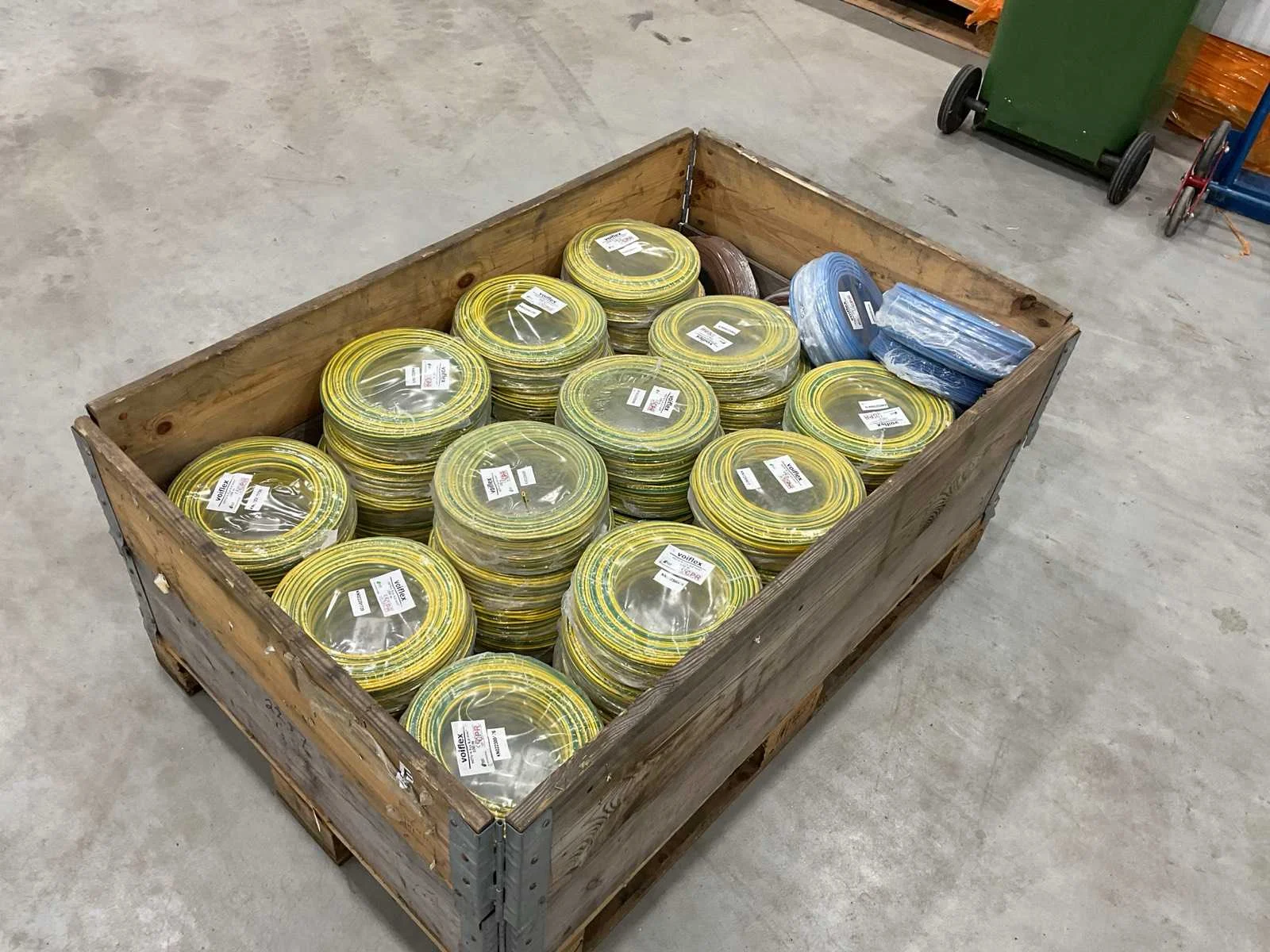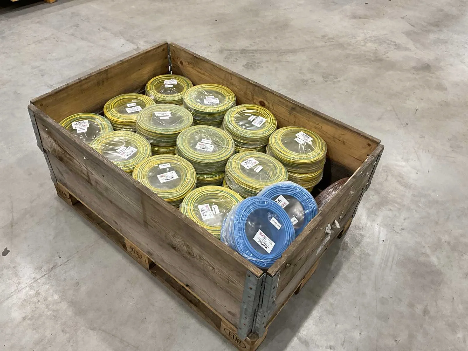 Voorzien van. 57 rollen geel groen 4,0mm2; 3 rollen bruin 4,0mm2; 4 rollen blauw 4,0mm2 Merk: Voiflex Product type: Draad Gewicht: 295kg Lengte: 120cm Breedte: 80cm Hoogte: 55cm Materiaal: Koper kabel
