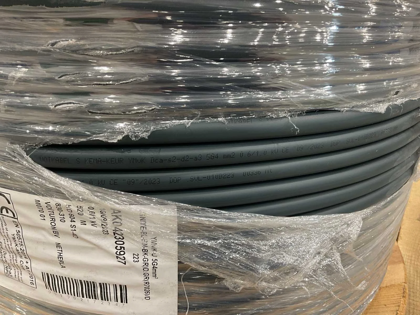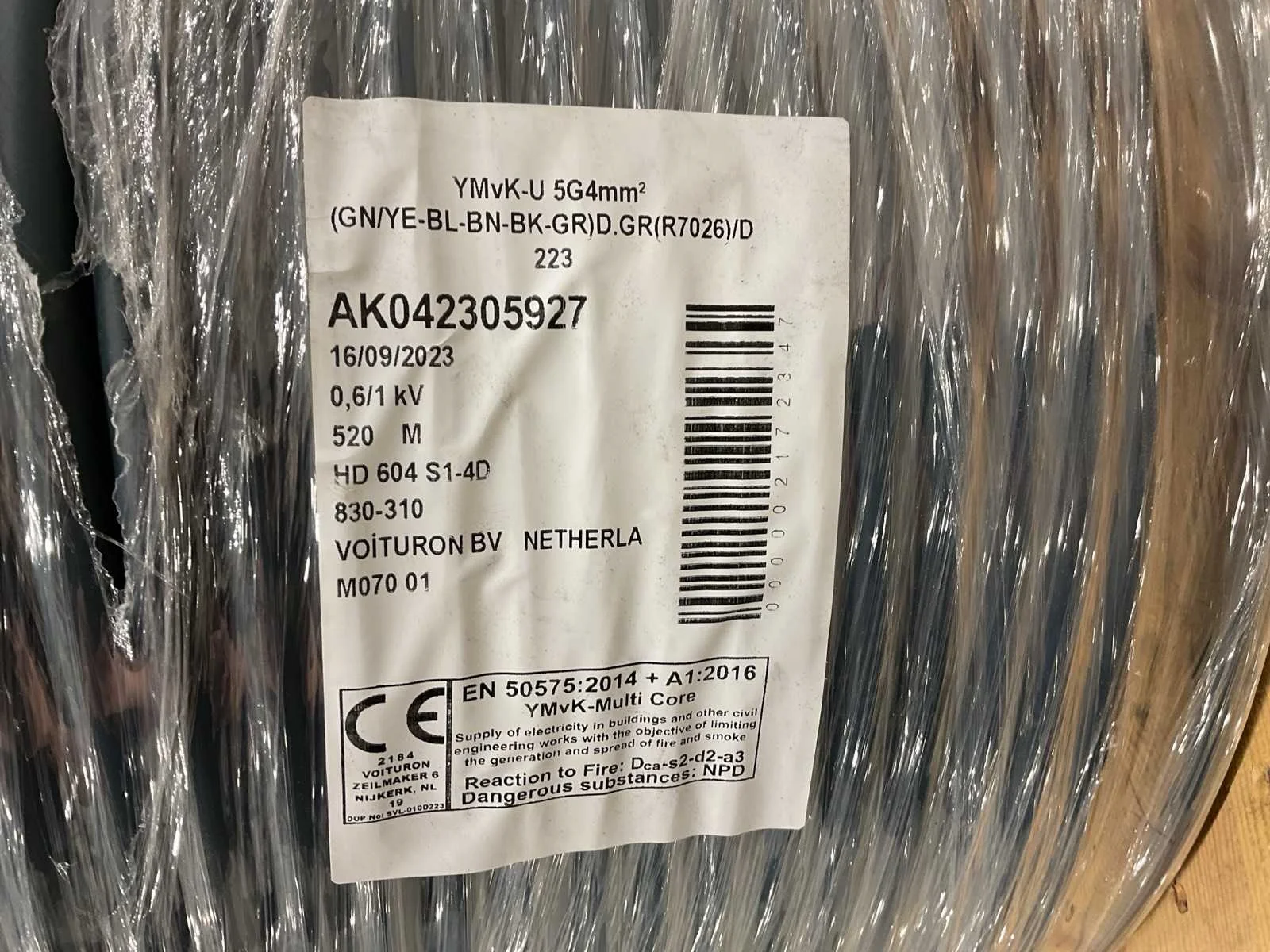 Voorzien van. Kabel 5x4mm2; 520 meter Merk: Voikabel Gewicht: 207kg Breedte: 70cm Hoogte: 50cm Materiaal: Kabel koper