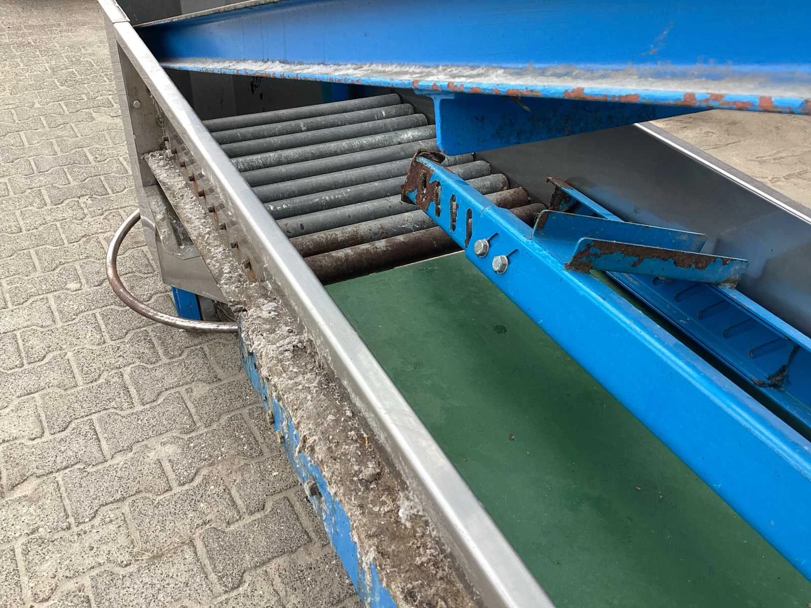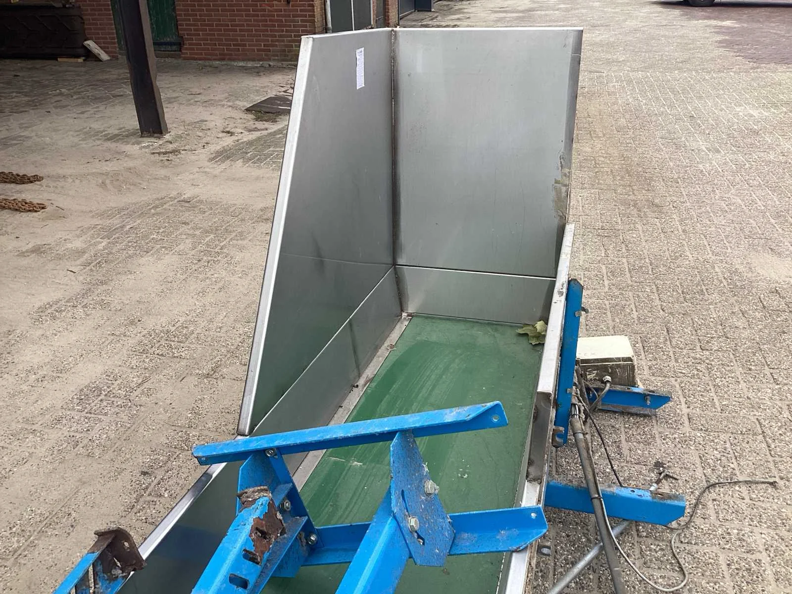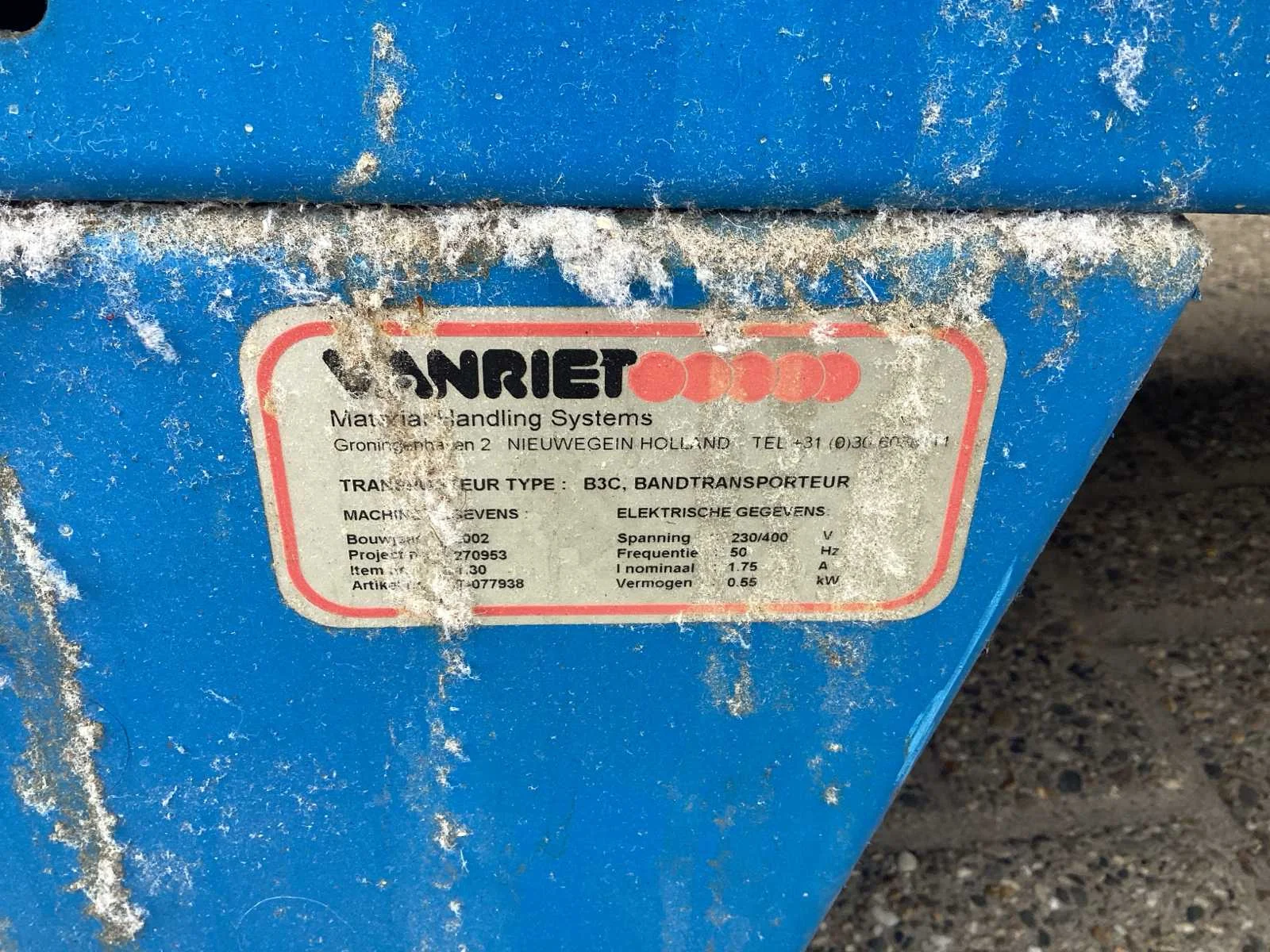 Voorzien van: spanrol; band loopt over in rollenbaan; 3 montage frames; 1 borders Merk: Van Riet Type: B3C Band afm. b: 500mm Band afm. l: 6800mm Elektrisch aangedreven: true Aansluiting: 400V Totale afmeting L: 8100mm Totale afmeting Breedte: 750mm Totale afmeting Hoogte: 1000mm