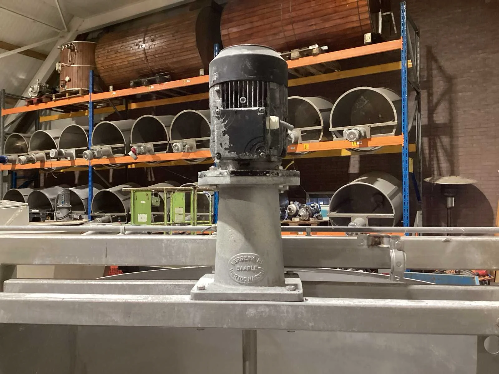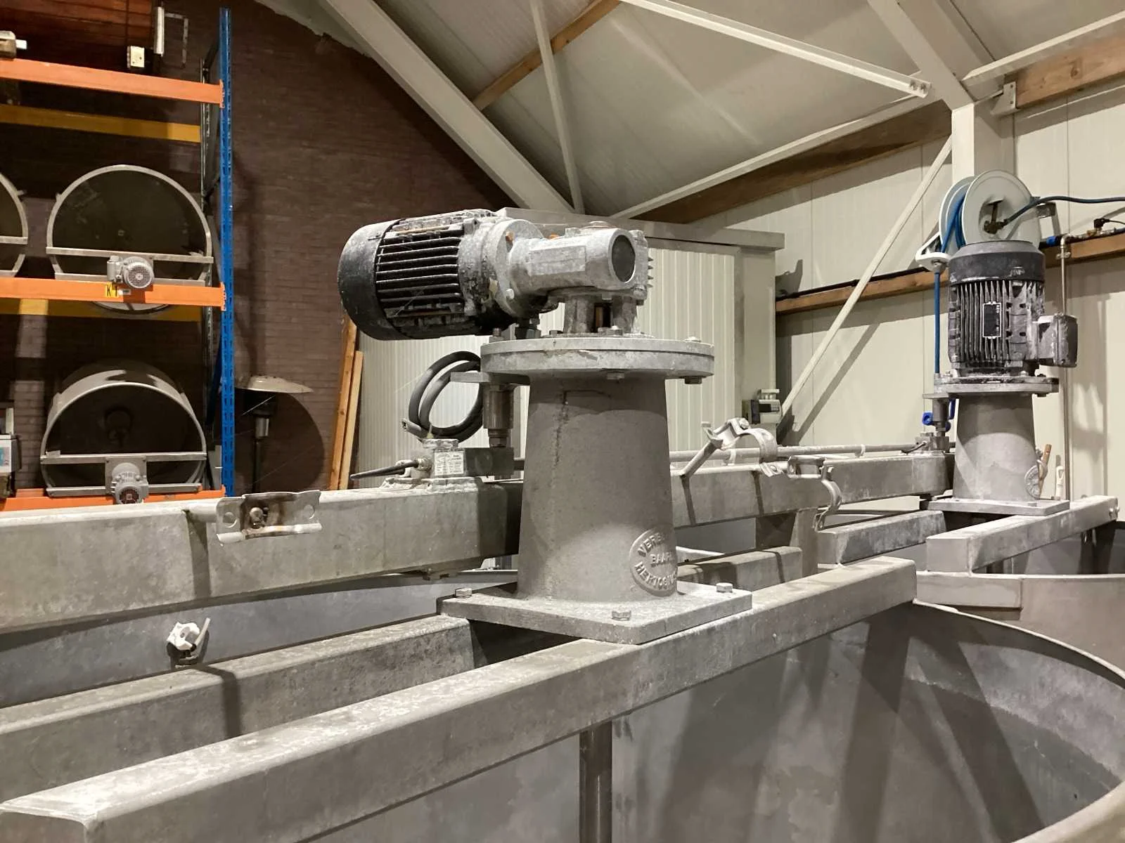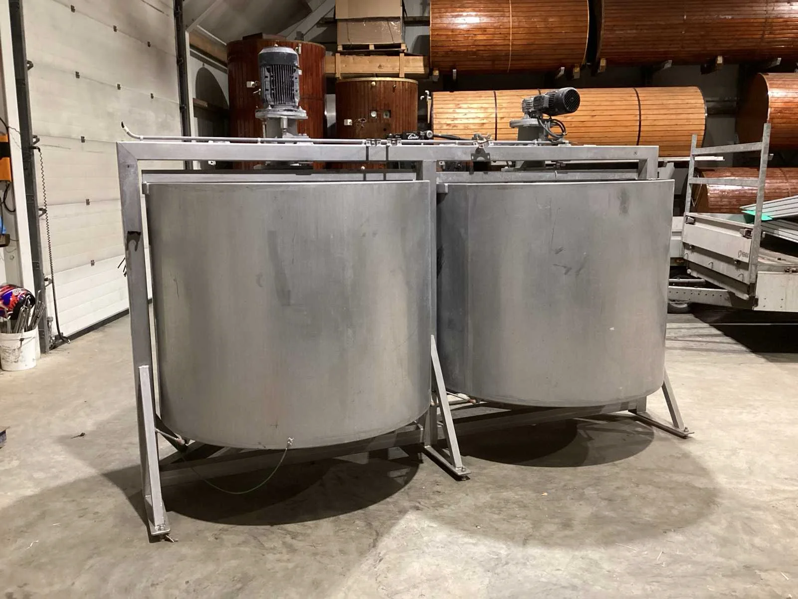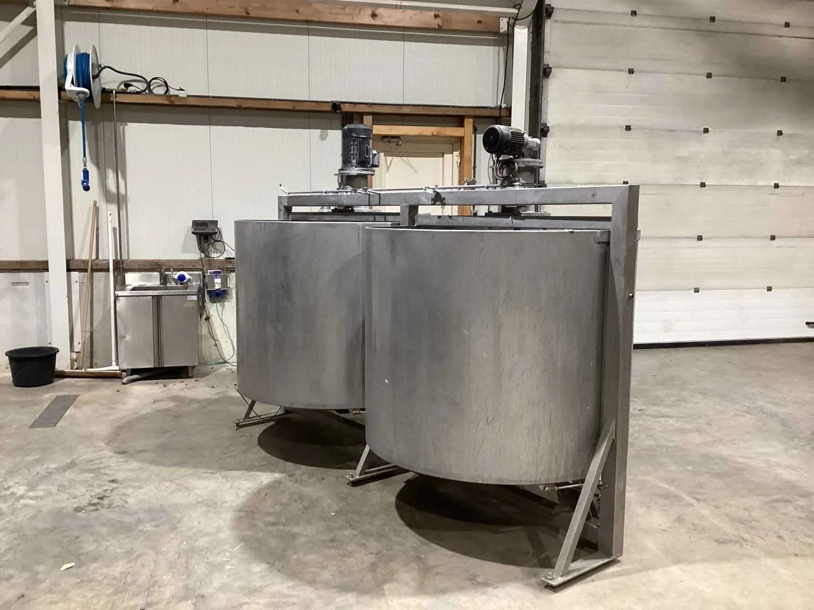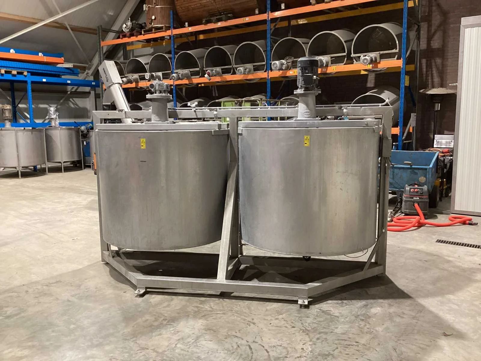 Voorzien van. 2X 1600 liter; beide hebben een weeg cel; 1 menger met hoog toeren mixer; 1 menger met laag toeren mixer; kegel bodem; 2” uitloop Merk: Verberk Type: Rvs vloeistof mixer Capaciteit.: 3200kg Aansluiting: 400V Totale afmeting L: 3000mm Totale afmeting Breedte: 1400mm Totale afmeting Hoogte: 2300mm
