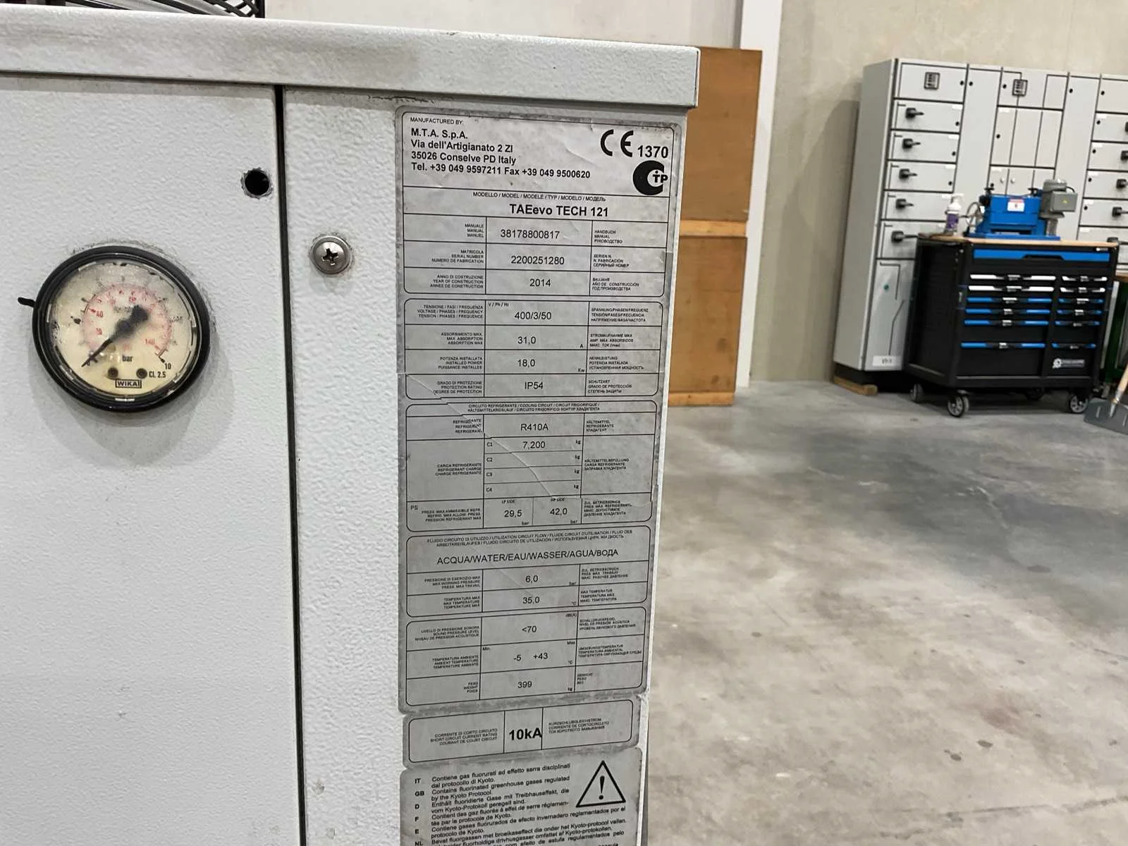 Merk: MTA Aansluiting: 380V Eigen gewicht: 399kg Type koudemiddel: R410A Totale afmeting Breedte: 770mm Totale afmeting Hoogte: 1450mm Totale afmeting L: 2000mm Type: TAE EVO TECH 121 Bouwjaar: 2014