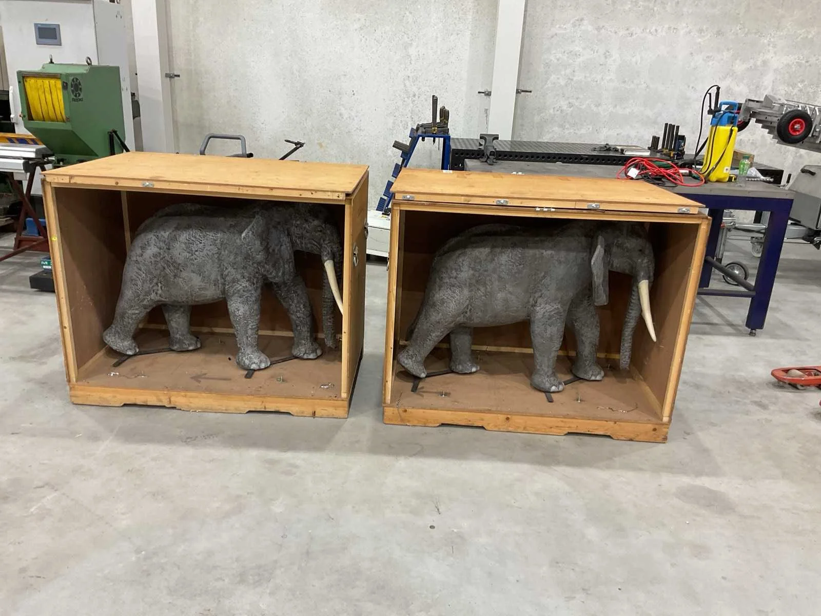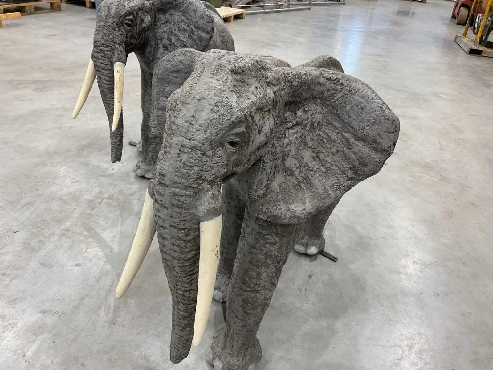 Voorzien van. 2x olifant in houten kist; afmeting per olifant L 125cm B 72cm H 90cm. Kleur: Grijs Lengte: 132cm Breedte: 160cm Hoogte: 110cm Materiaal: Kunststof