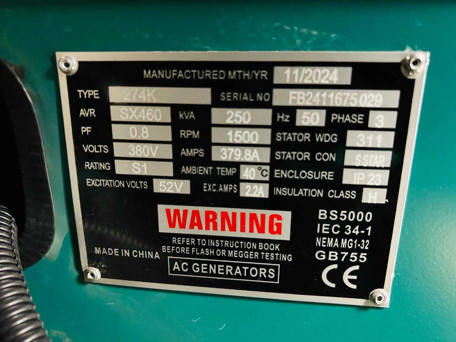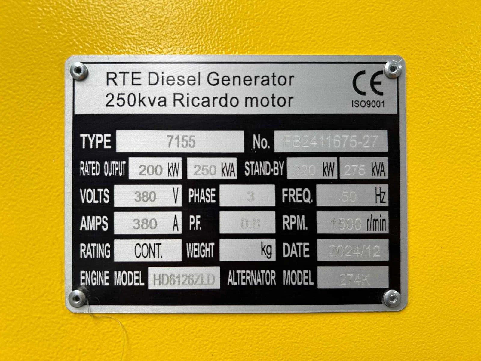 Ongebruikt; ATS; Rated output 200kW/250Kva; stand-by 220kW/275Kva; P.F. 0.8; RPM 1500; 3 PHASE; altenator 274K; ATS 380a; GENSET controller met LCD; 2 accu’s; v.v. CE en QC; sledes verwerkt in frame; 7155 Merk: RTE Type: 7155 Bouwjaar: 12-2024 Capaciteit.: 250kVA Aansluiting: 380V Motor merk: Ricardo Motorcapaciteit: 200kW Generator type: HD6126ZLD Generator capaciteit: 380A Afgelezen urenstand: 1 Machinegewicht: 3800kg Totale afmeting L: 3600mm Totale afmeting Breedte: 1180mm Totale afmeting Hoogte: 1950mm