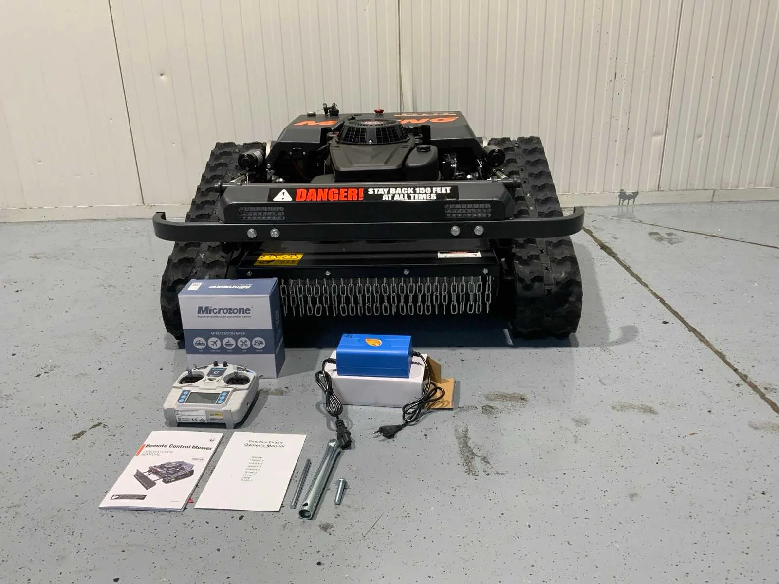 224cc Grasmaaier op rupsbanden, maaien op afstand. Ongebruikt. Merk: Mateng Bouwjaar: 2025 Eigen gewicht: 152kg Totale afmeting L: 100cm Totale afmeting Breedte: 100cm Totale afmeting Hoogte: 48cm