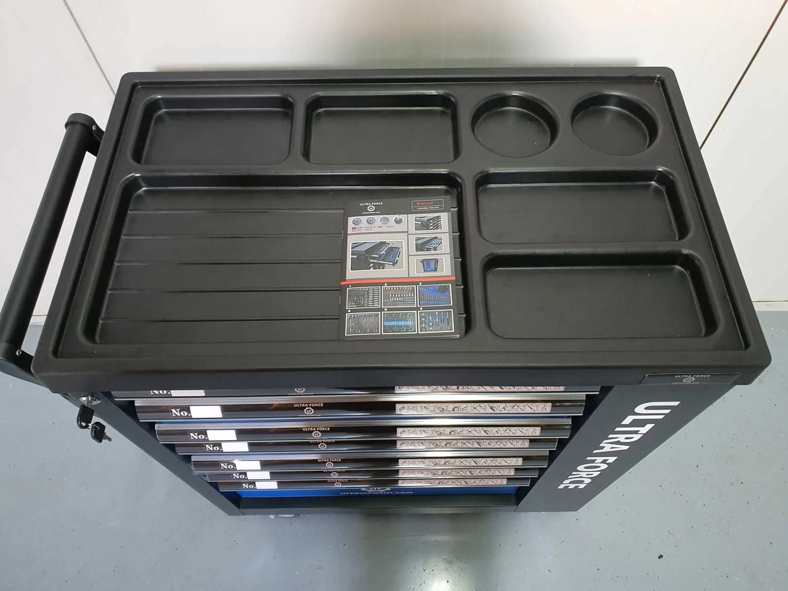 Nieuw bij ons in het assortiment, deze mooie goed gevulde gereedschapswagen. Mooi voor elke garage, werkplaats of natuurlijk uw schuur. Merk: Ultra Force Equipment Type: 260-Delig Bouwjaar: 2025 Aantal laden: 7 Met inhoud: true Eigen gewicht: 75kg Totale afmeting L: 470mm Totale afmeting Breedte: 790mm Totale afmeting Hoogte: 970mm
