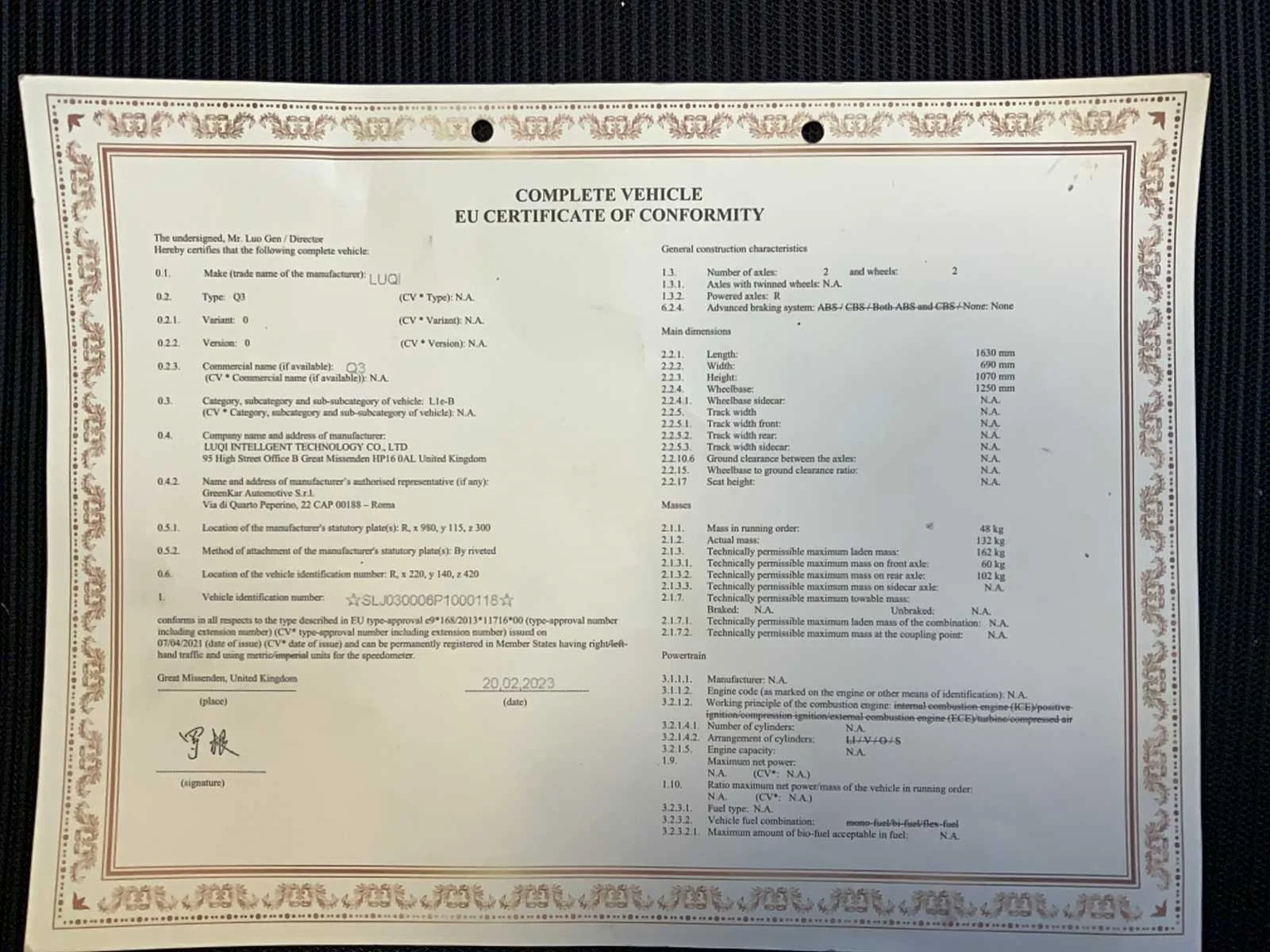 COC aanwezig. Met lader U dient na aankoop zelf nog een kenteken aan te vragen. Merk: Q3 Lengte: 1630 Breedte: 690 Hoogte: 1070