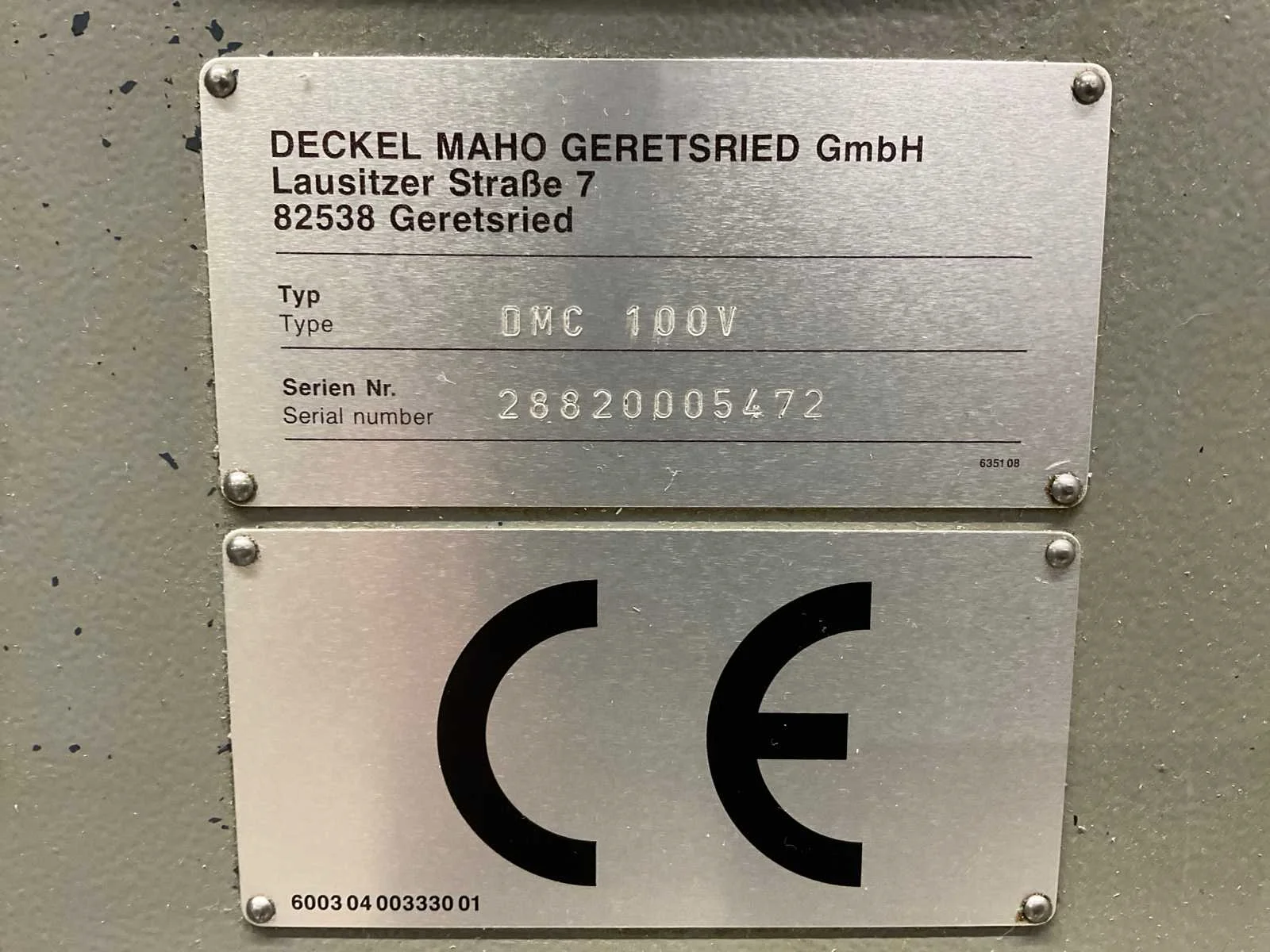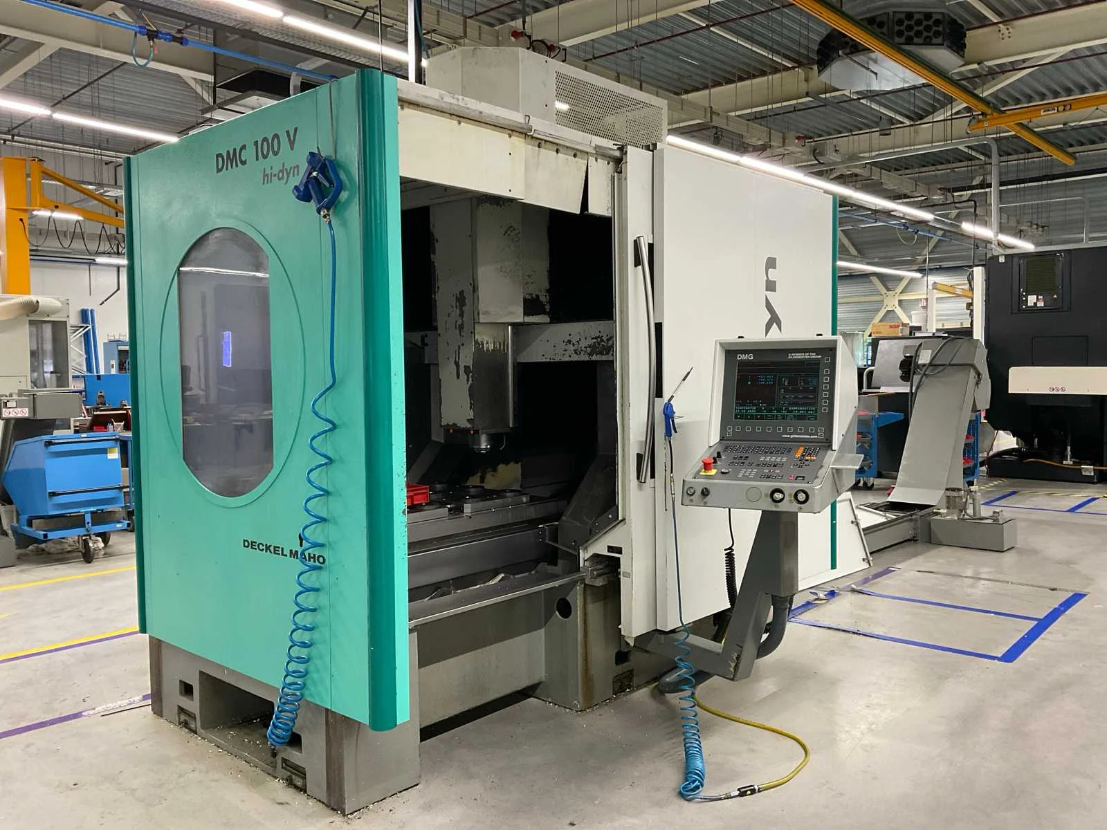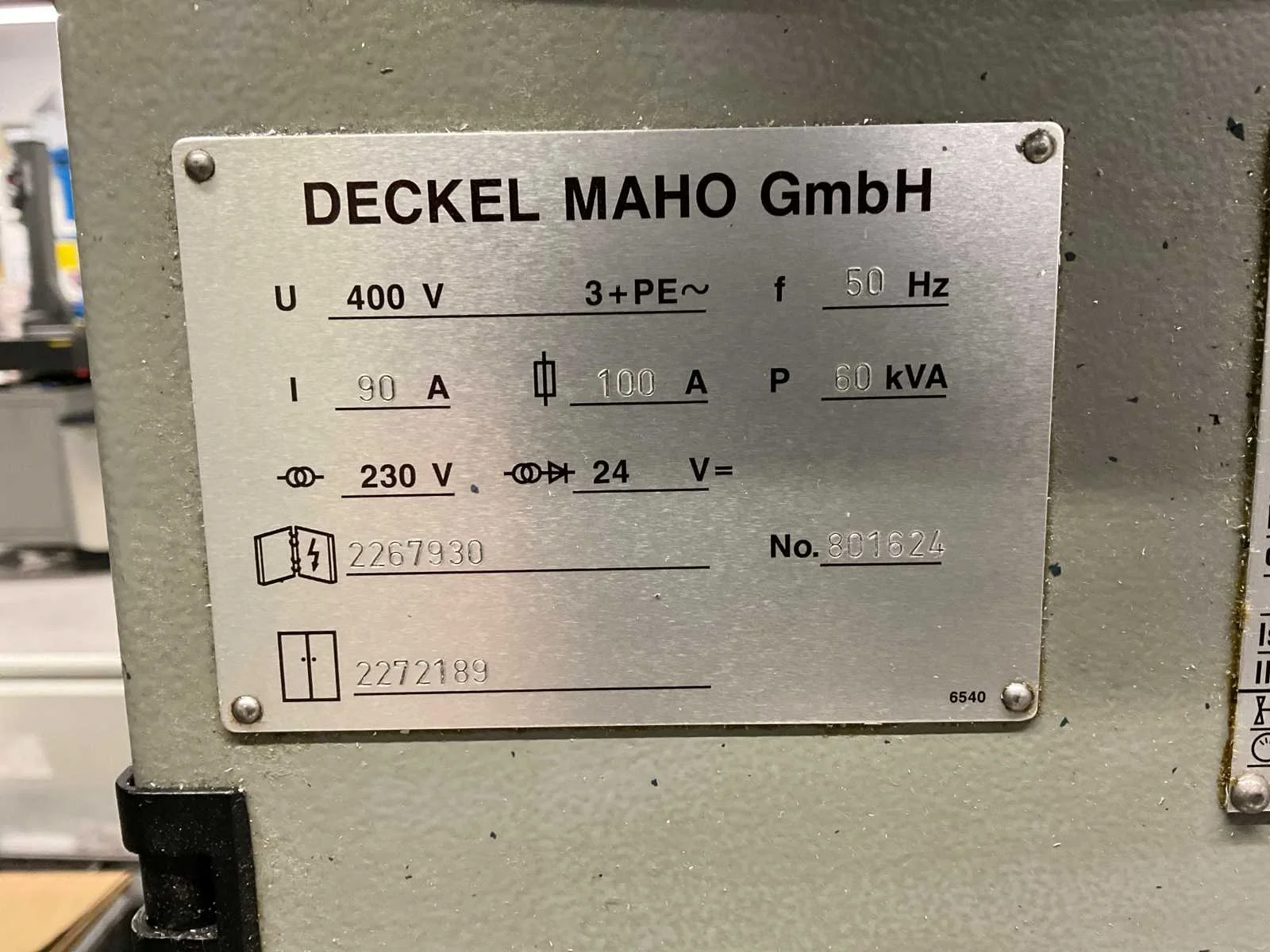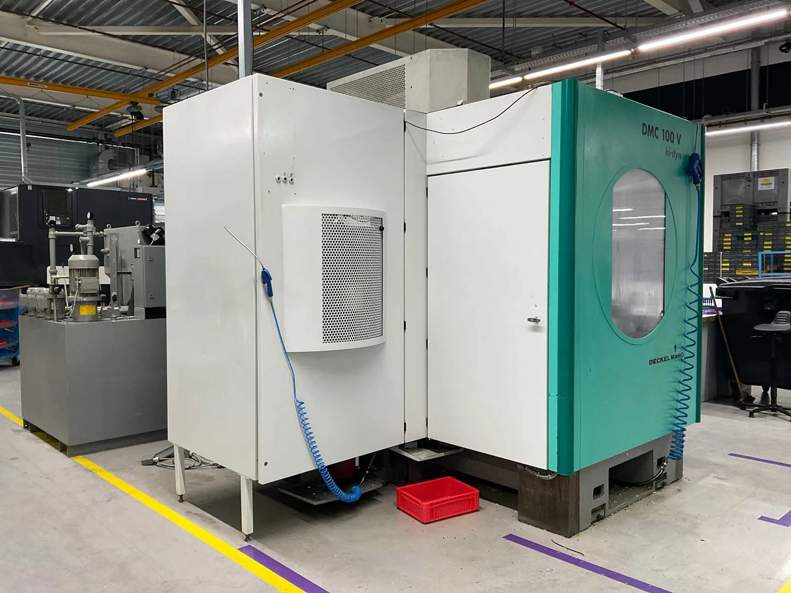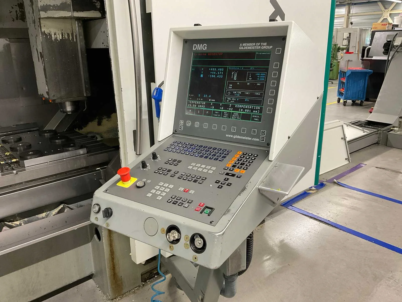 Voorzien van: spanentransporteur (4500mm), Knoll RF 200/1100 koelsysteem, DMG bedieningspaneel, documentatie, (zonder T-gleuf materiaalklem), gereedschapswisselstation (30 plaatsen), Merk: Deckel Type: DMC 100V Hi-Dyn Bouwjaar: 1999 Serienummer: 28820005472 Verplaatsing x-as: 1000mm Verplaatsing y-as: 800mm Verplaatsing z-as: 500mm Opname: SK40 Snelheid tot n =: 30000rpm T-gleuf opspantafelafmeting L: 800mm T-gleuf opspantafelafmeting B: 1250mm Werkstuk gewicht max.: 1200kg Spanentransporteur: true CNC-besturing, merk, type: DMG Machinegewicht: 9000kg Afmeting l: 3100mm Afmeting b: 2400mm Afmeting h: 2600mm