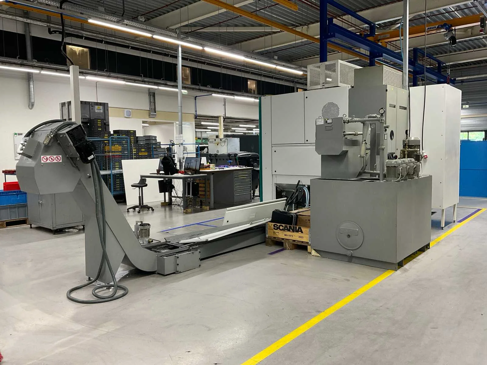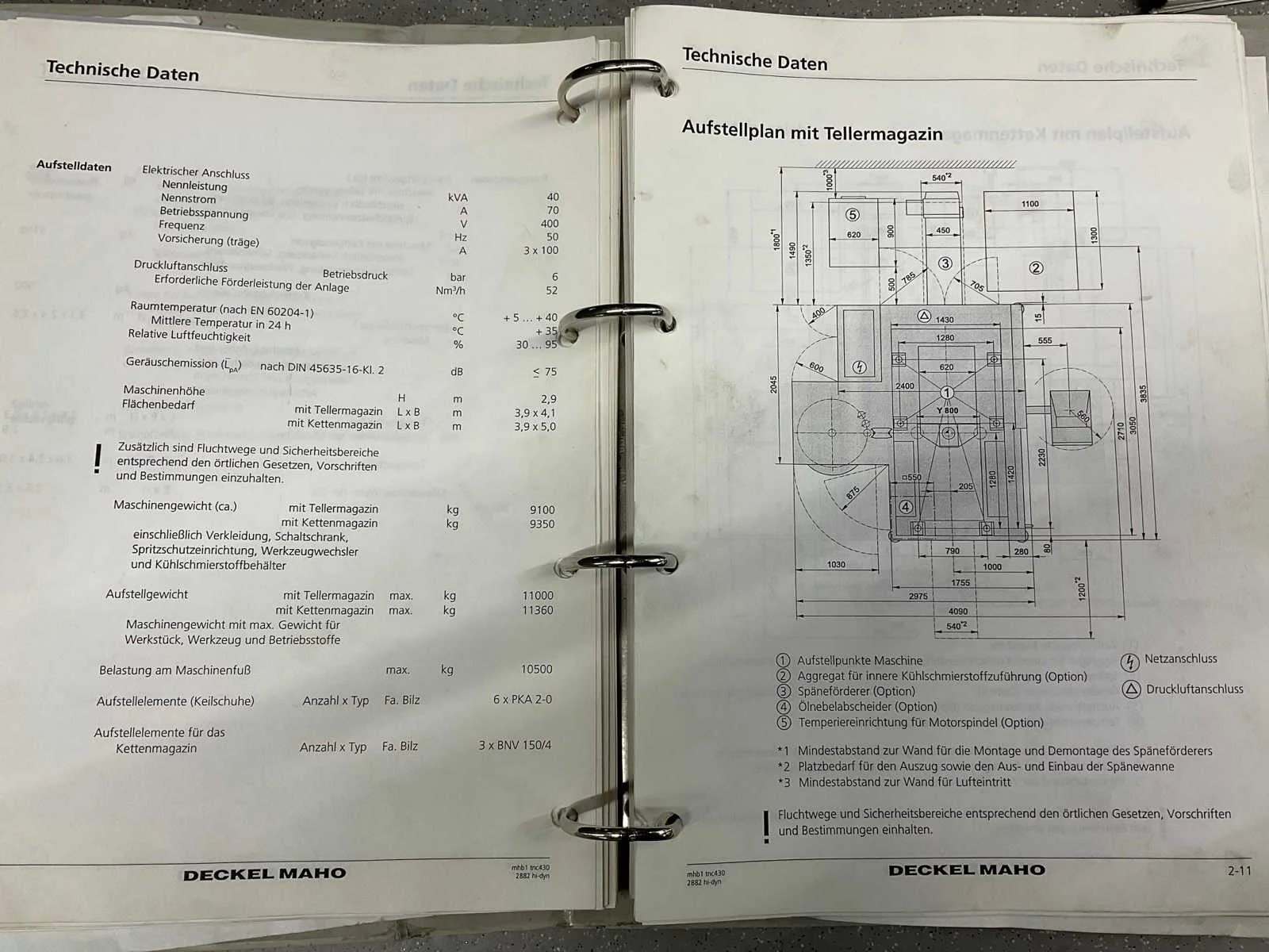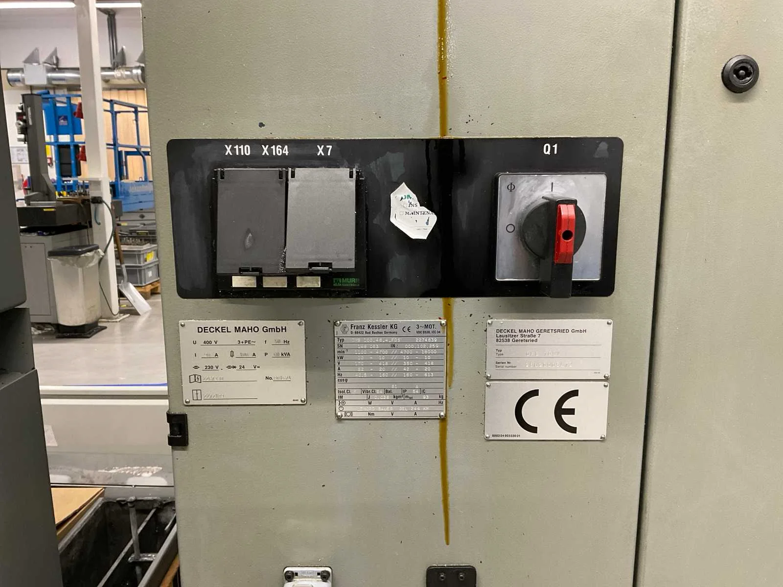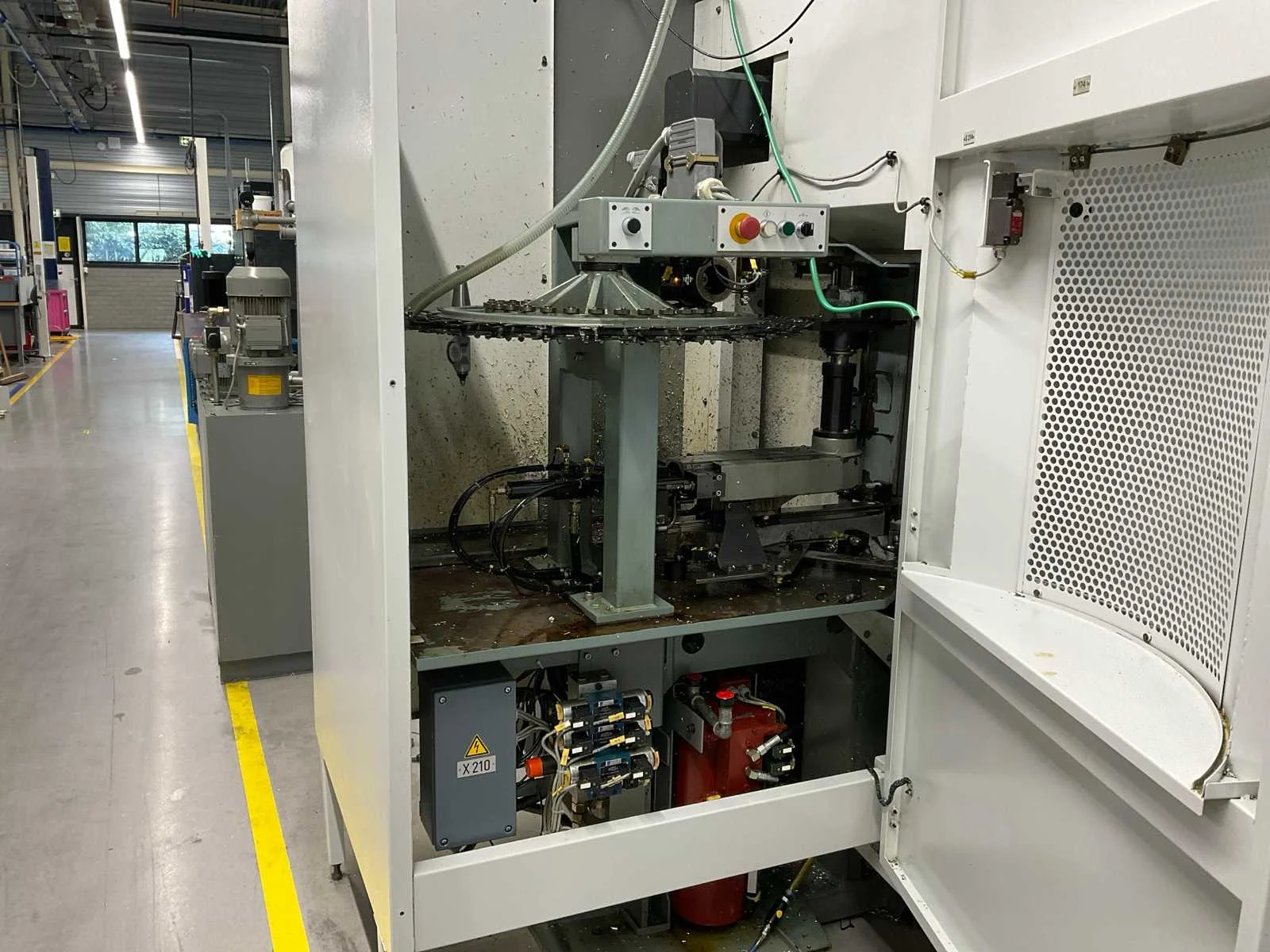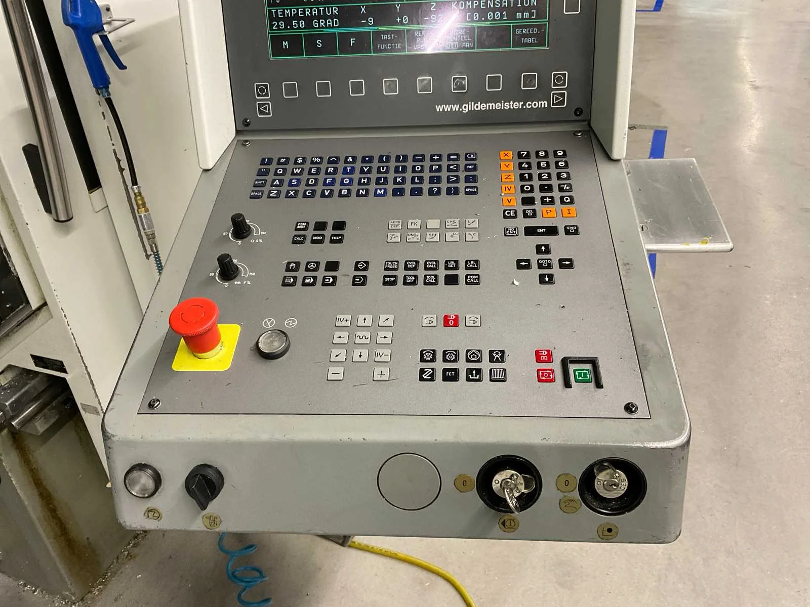 Voorzien van: spanentransporteur (4500mm), Knoll RF 200/1100 koelsysteem, DMG bedieningspaneel, documentatie, (zonder T-gleuf materiaalklem), gereedschapswisselstation (30 plaatsen), Merk: Deckel Type: DMC 100V Hi-Dyn Bouwjaar: 1999 Serienummer: 28820005472 Verplaatsing x-as: 1000mm Verplaatsing y-as: 800mm Verplaatsing z-as: 500mm Opname: SK40 Snelheid tot n =: 30000rpm T-gleuf opspantafelafmeting L: 800mm T-gleuf opspantafelafmeting B: 1250mm Werkstuk gewicht max.: 1200kg Spanentransporteur: true CNC-besturing, merk, type: DMG Machinegewicht: 9000kg Afmeting l: 3100mm Afmeting b: 2400mm Afmeting h: 2600mm