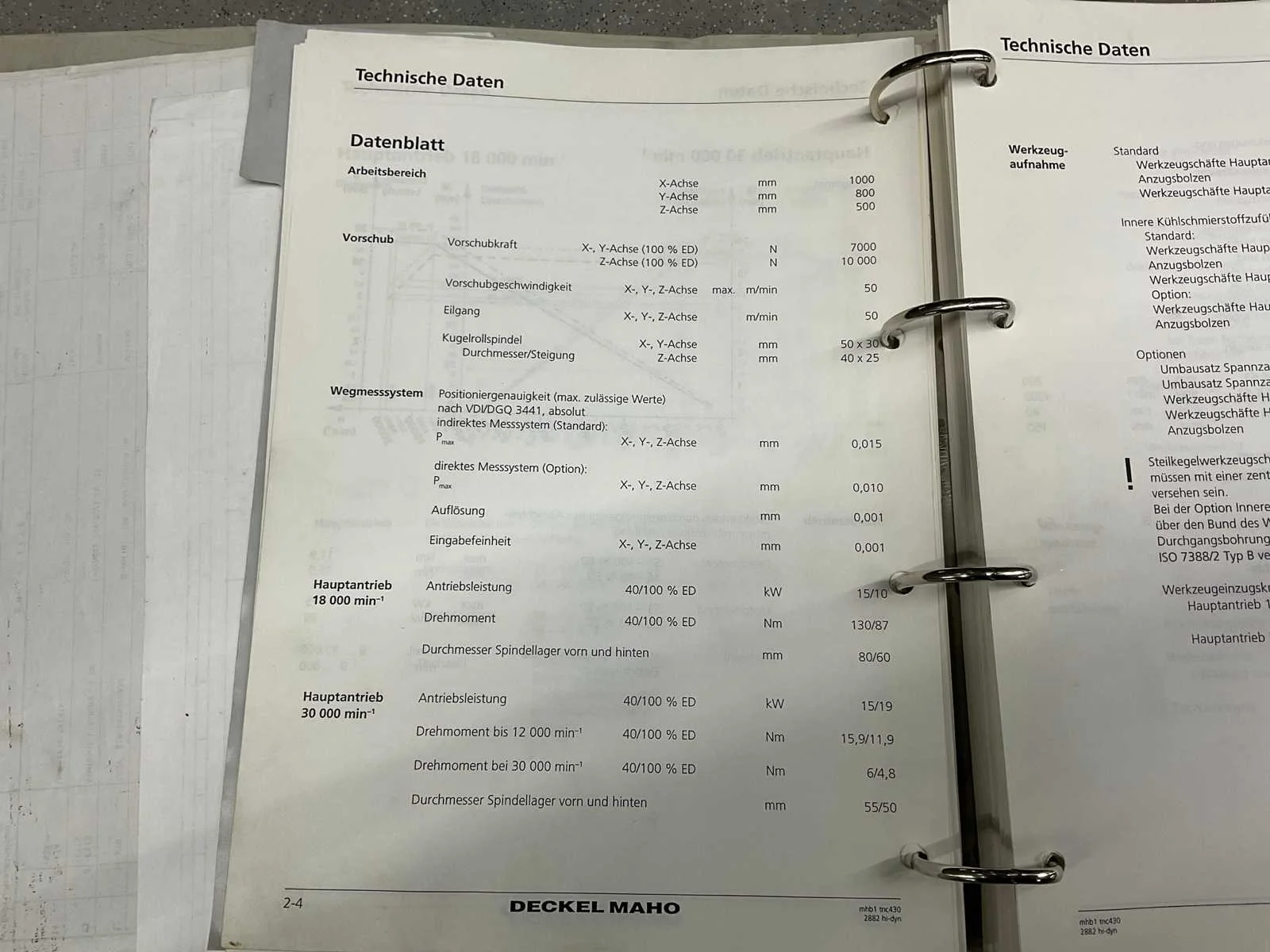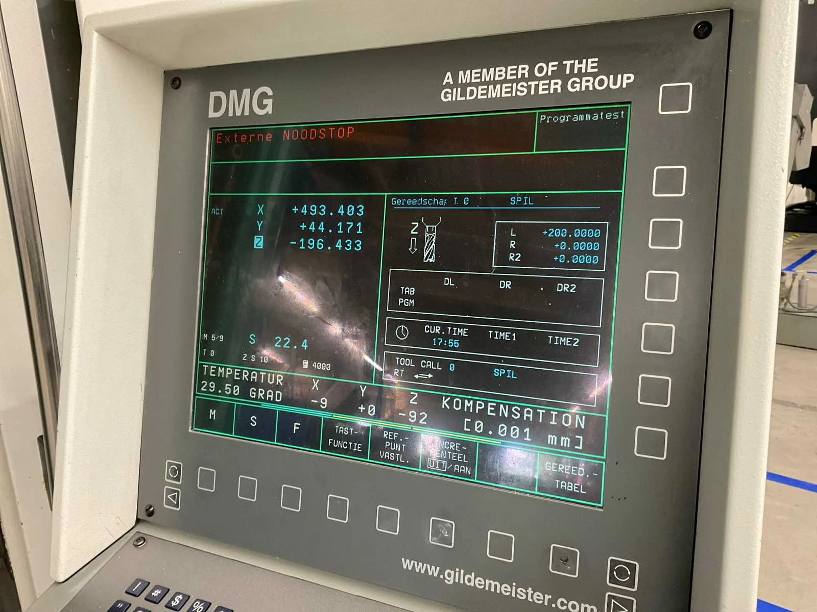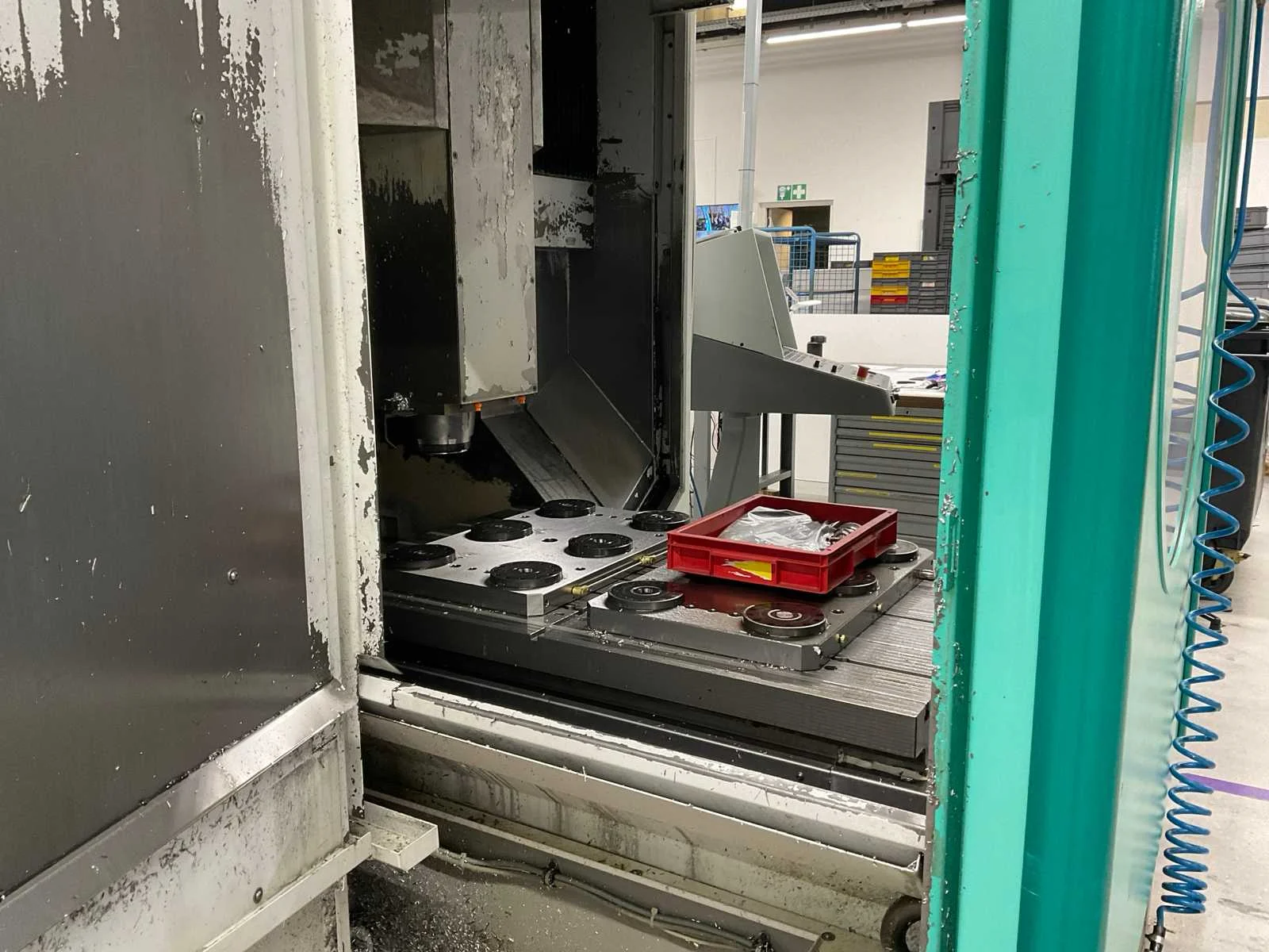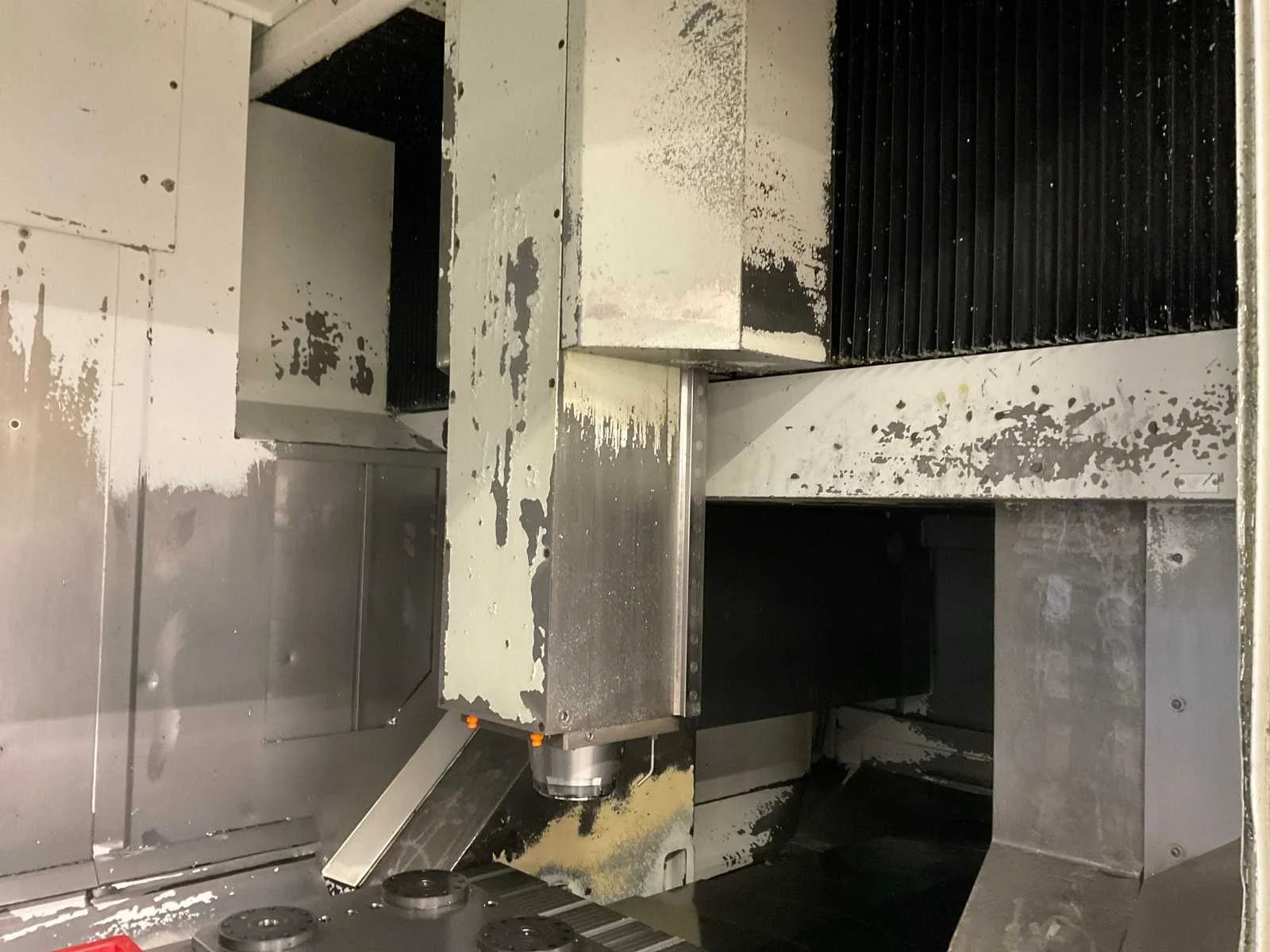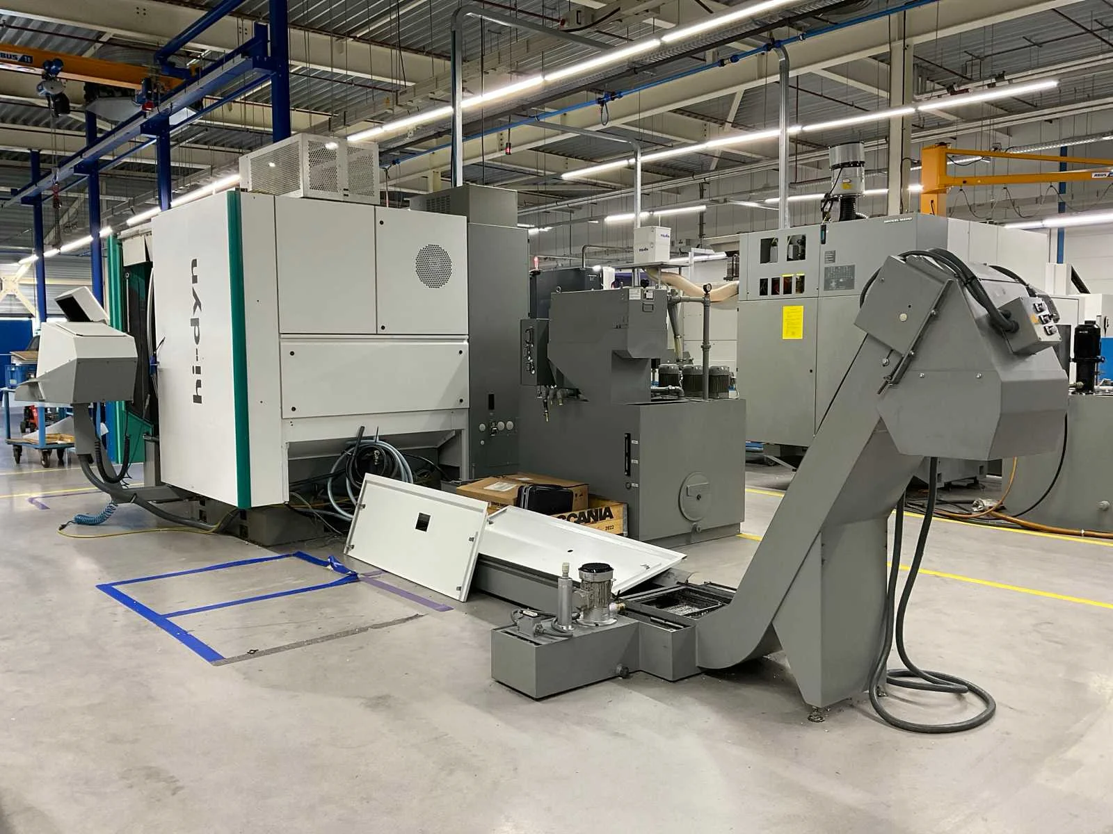 Voorzien van: spanentransporteur (4500mm), Knoll RF 200/1100 koelsysteem, DMG bedieningspaneel, documentatie, (zonder T-gleuf materiaalklem), gereedschapswisselstation (30 plaatsen), Merk: Deckel Type: DMC 100V Hi-Dyn Bouwjaar: 1999 Serienummer: 28820005472 Verplaatsing x-as: 1000mm Verplaatsing y-as: 800mm Verplaatsing z-as: 500mm Opname: SK40 Snelheid tot n =: 30000rpm T-gleuf opspantafelafmeting L: 800mm T-gleuf opspantafelafmeting B: 1250mm Werkstuk gewicht max.: 1200kg Spanentransporteur: true CNC-besturing, merk, type: DMG Machinegewicht: 9000kg Afmeting l: 3100mm Afmeting b: 2400mm Afmeting h: 2600mm