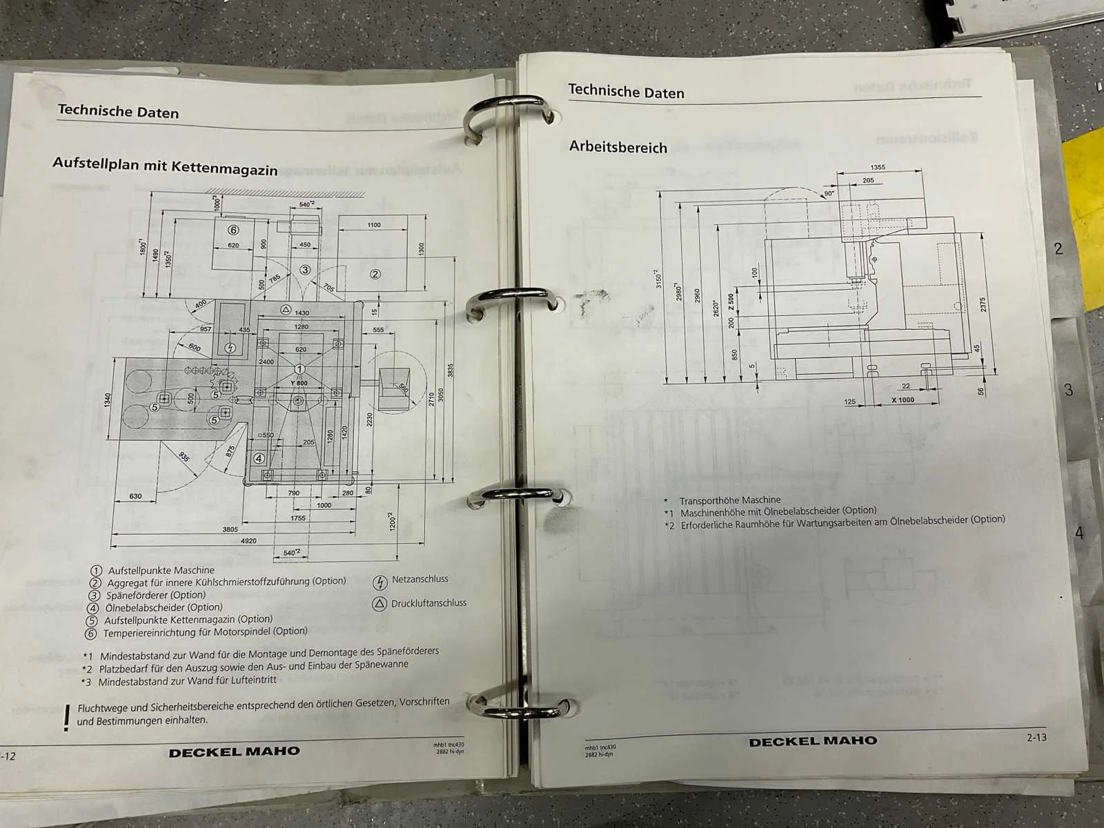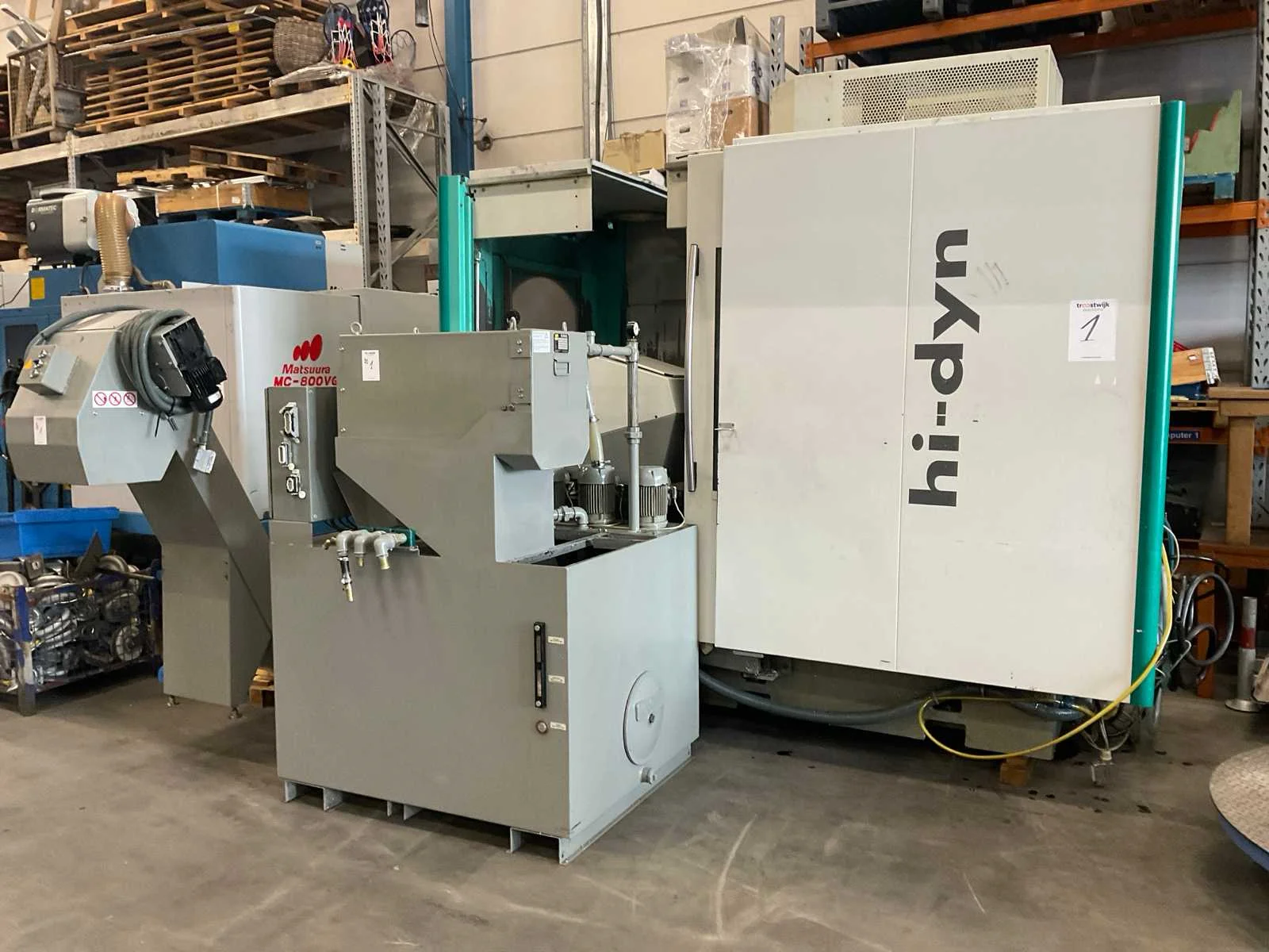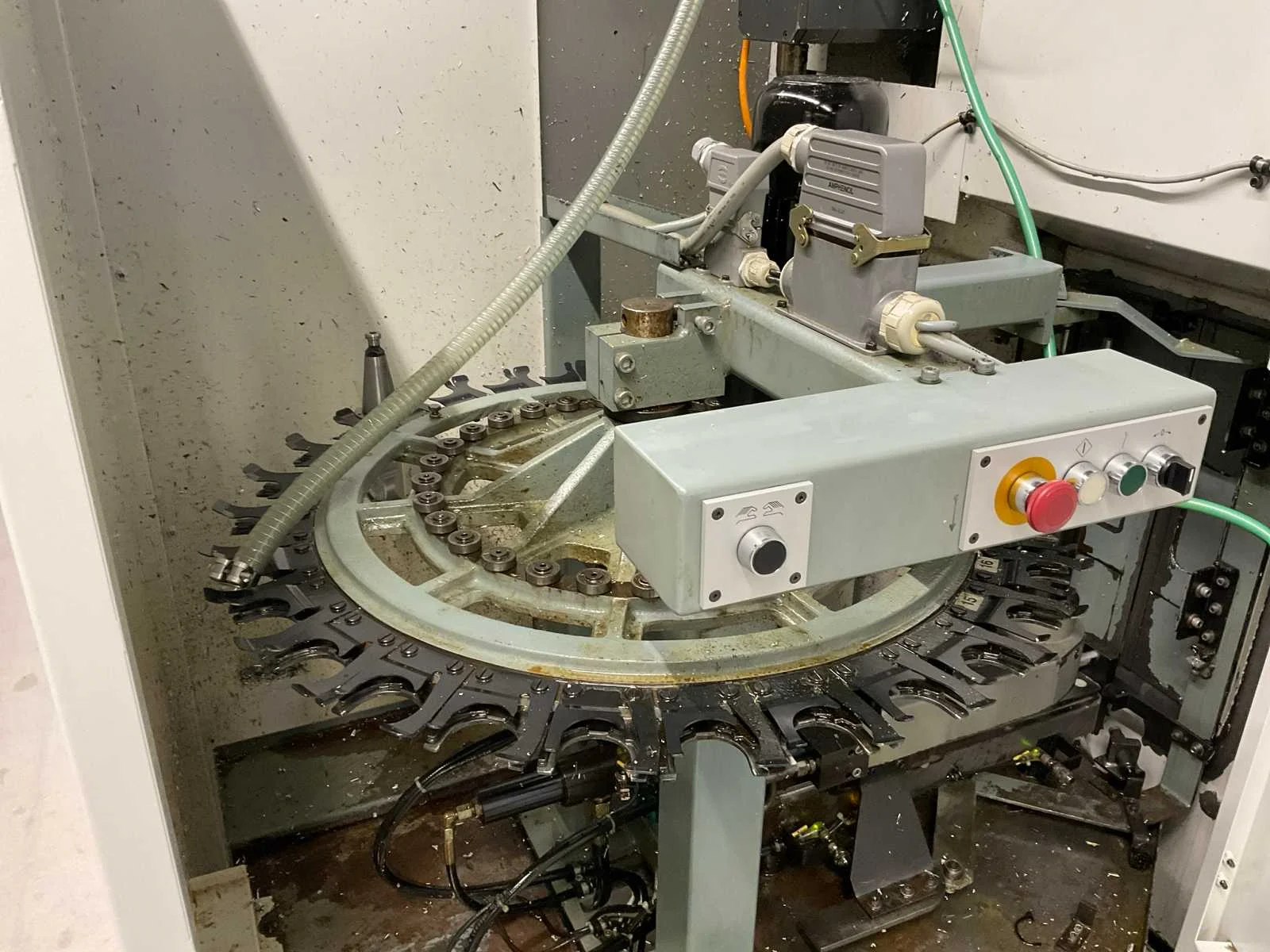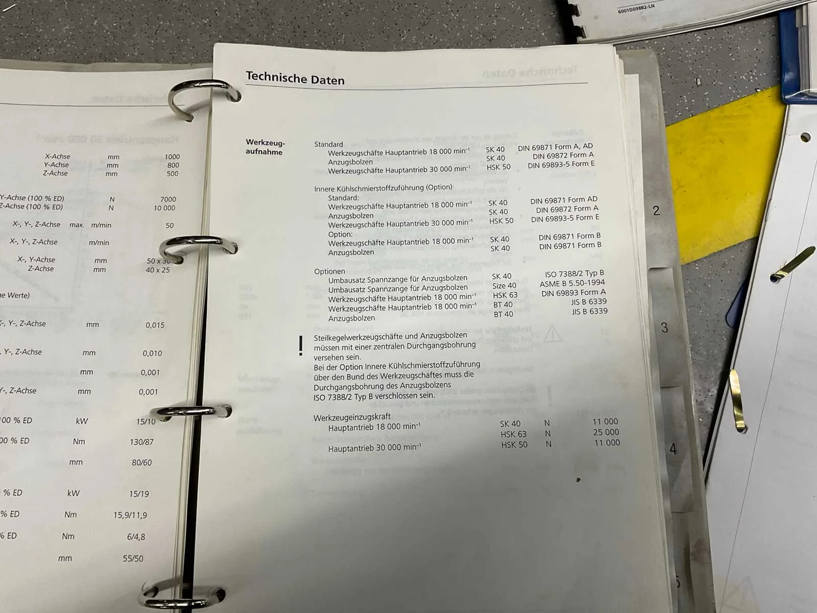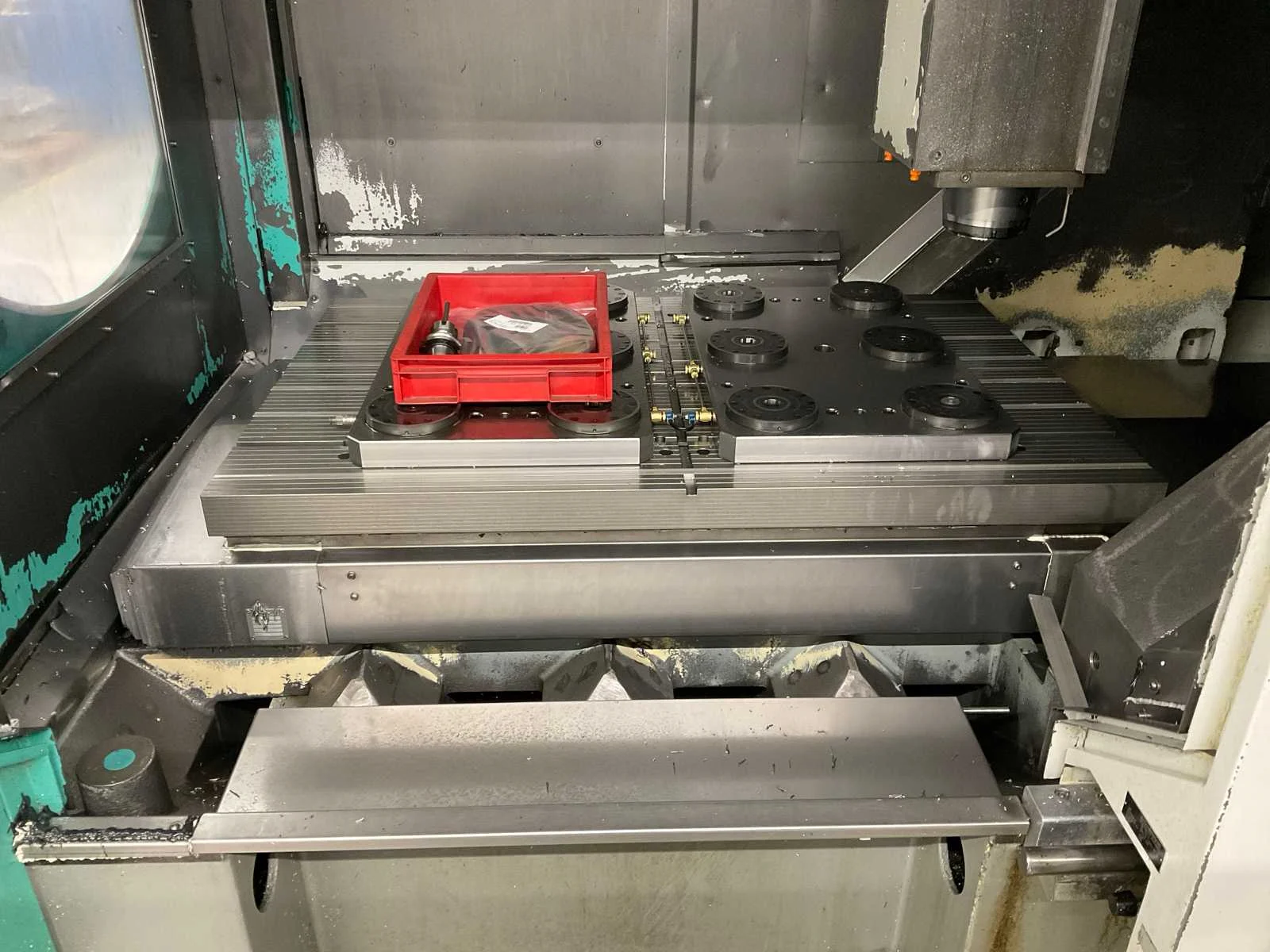 Voorzien van: spanentransporteur (4500mm), Knoll RF 200/1100 koelsysteem, DMG bedieningspaneel, documentatie, (zonder T-gleuf materiaalklem), gereedschapswisselstation (30 plaatsen), Merk: Deckel Type: DMC 100V Hi-Dyn Bouwjaar: 1999 Serienummer: 28820005472 Verplaatsing x-as: 1000mm Verplaatsing y-as: 800mm Verplaatsing z-as: 500mm Opname: SK40 Snelheid tot n =: 30000rpm T-gleuf opspantafelafmeting L: 800mm T-gleuf opspantafelafmeting B: 1250mm Werkstuk gewicht max.: 1200kg Spanentransporteur: true CNC-besturing, merk, type: DMG Machinegewicht: 9000kg Afmeting l: 3100mm Afmeting b: 2400mm Afmeting h: 2600mm