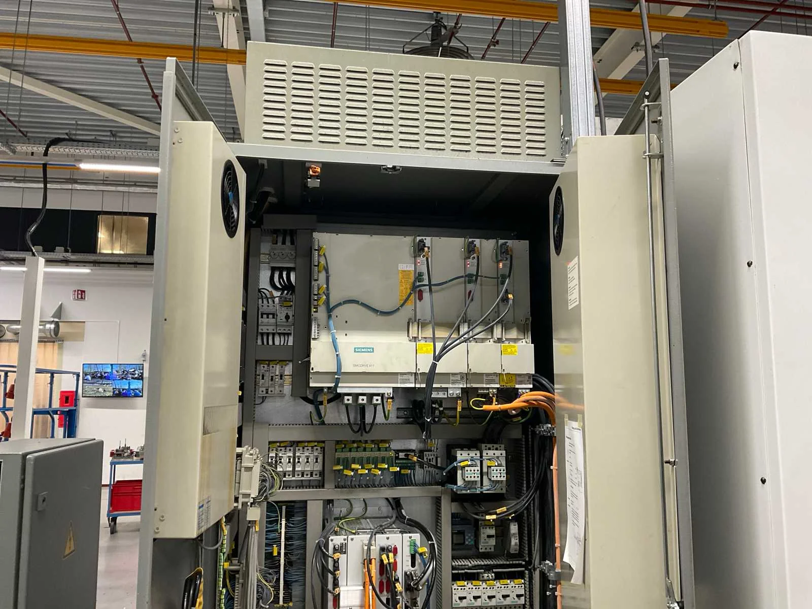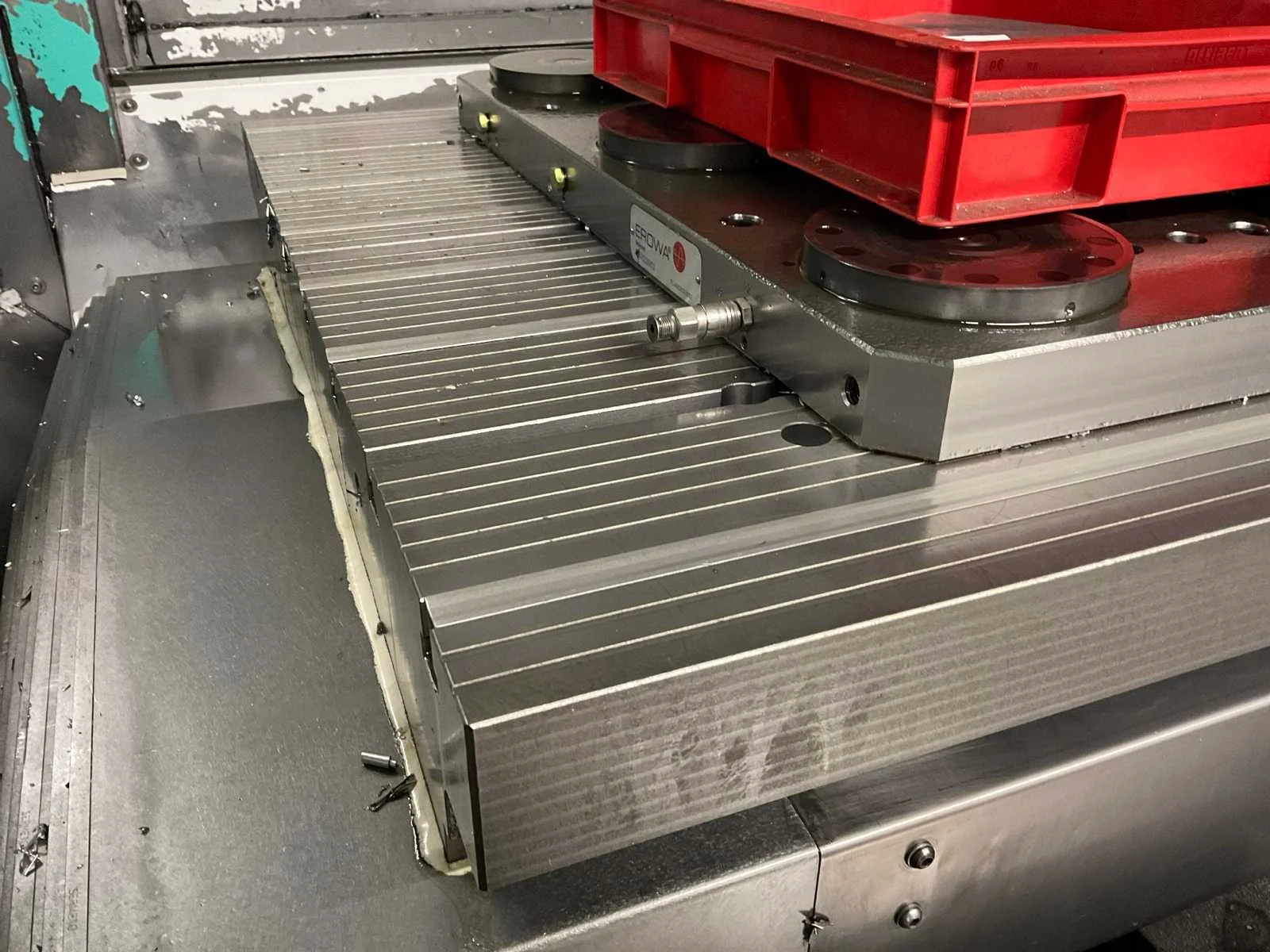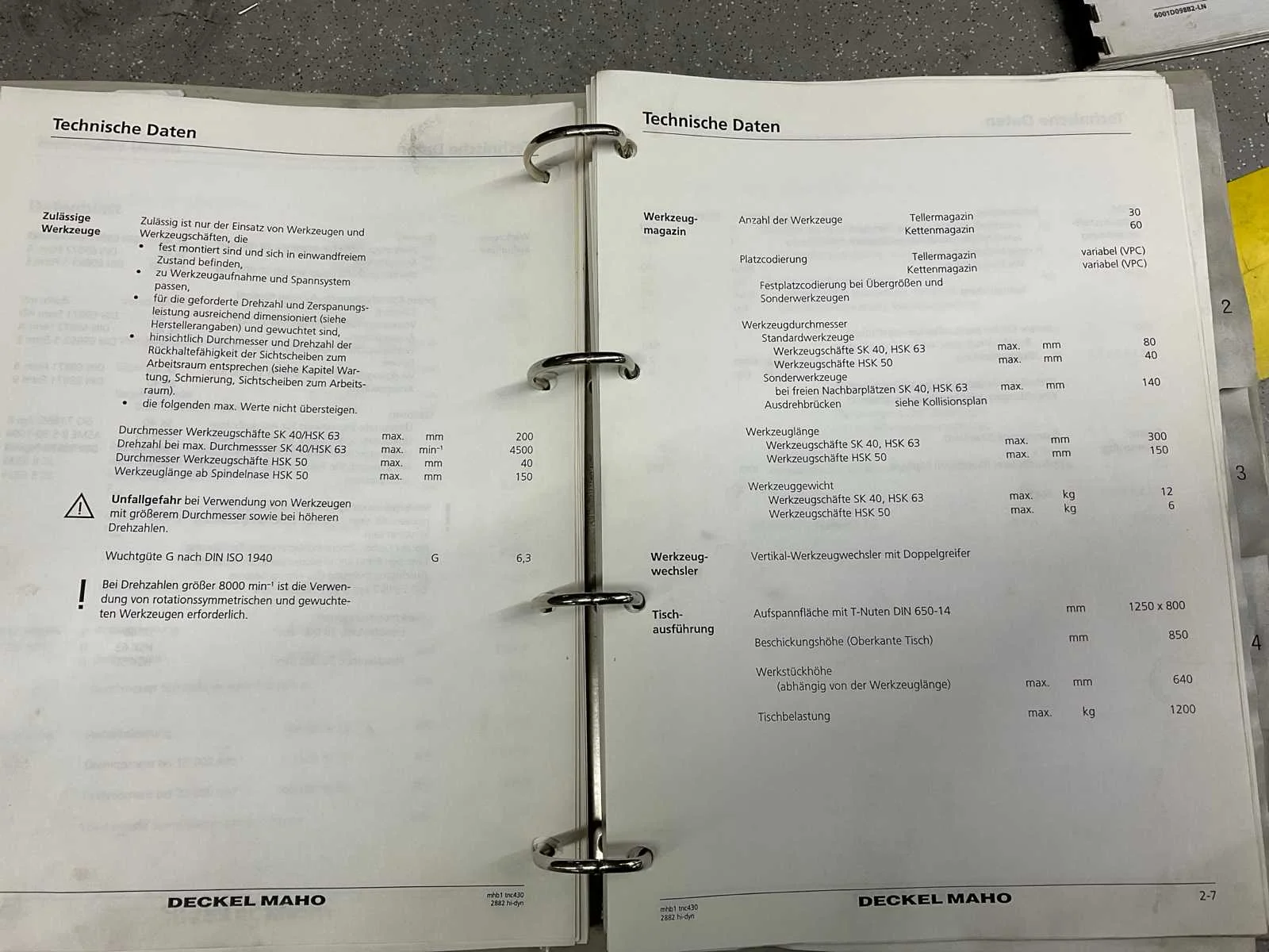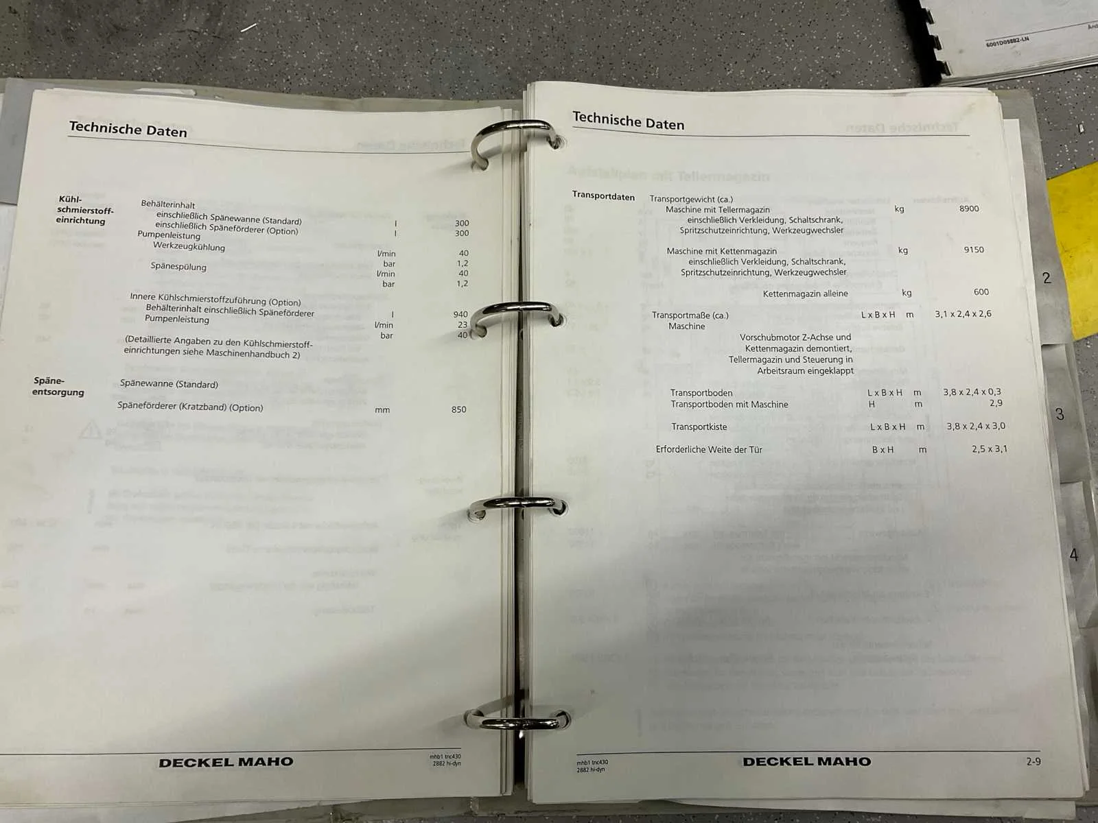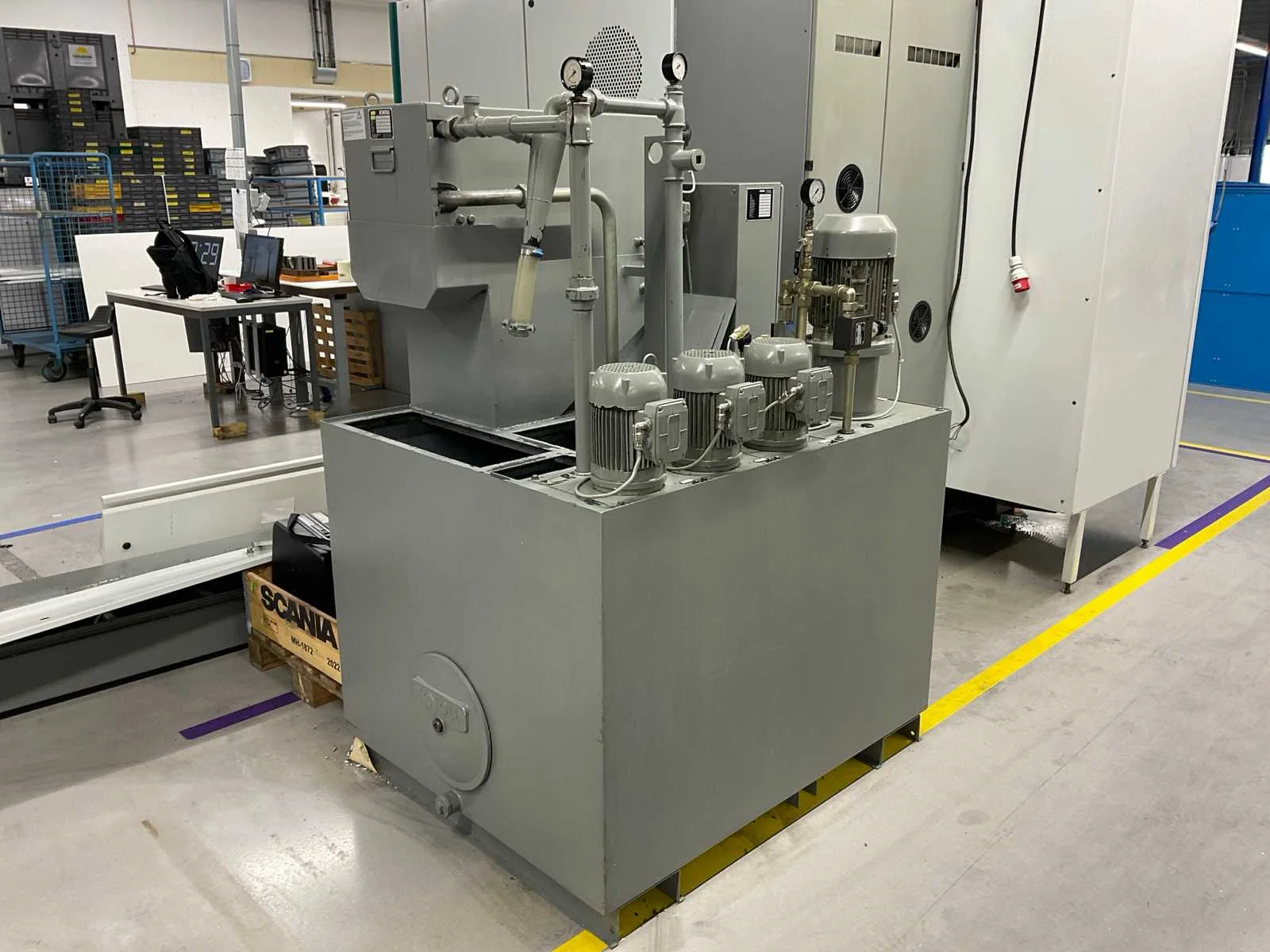 Voorzien van: spanentransporteur (4500mm), Knoll RF 200/1100 koelsysteem, DMG bedieningspaneel, documentatie, (zonder T-gleuf materiaalklem), gereedschapswisselstation (30 plaatsen), Merk: Deckel Type: DMC 100V Hi-Dyn Bouwjaar: 1999 Serienummer: 28820005472 Verplaatsing x-as: 1000mm Verplaatsing y-as: 800mm Verplaatsing z-as: 500mm Opname: SK40 Snelheid tot n =: 30000rpm T-gleuf opspantafelafmeting L: 800mm T-gleuf opspantafelafmeting B: 1250mm Werkstuk gewicht max.: 1200kg Spanentransporteur: true CNC-besturing, merk, type: DMG Machinegewicht: 9000kg Afmeting l: 3100mm Afmeting b: 2400mm Afmeting h: 2600mm