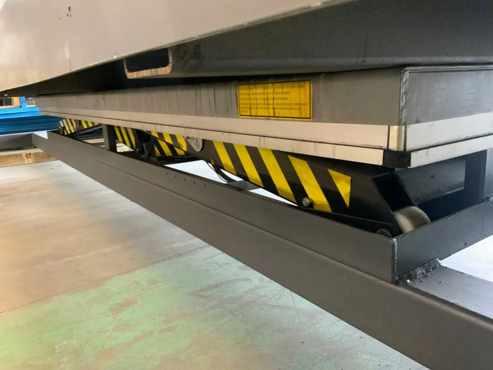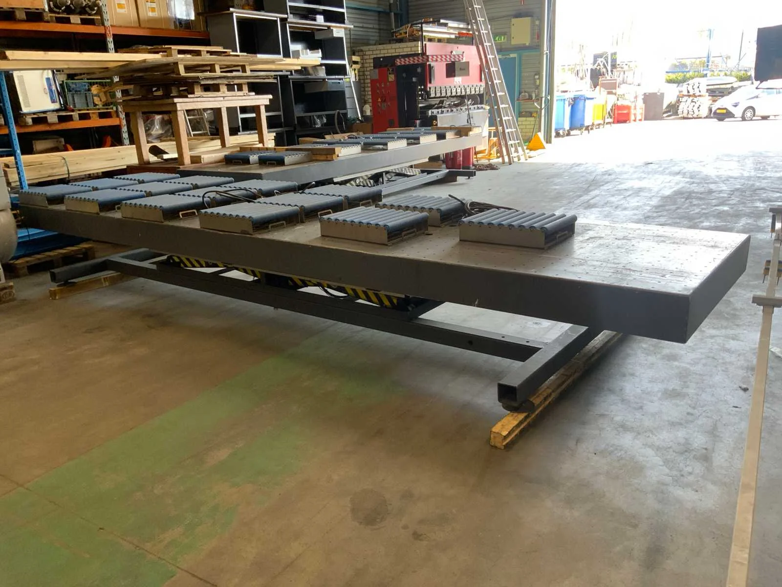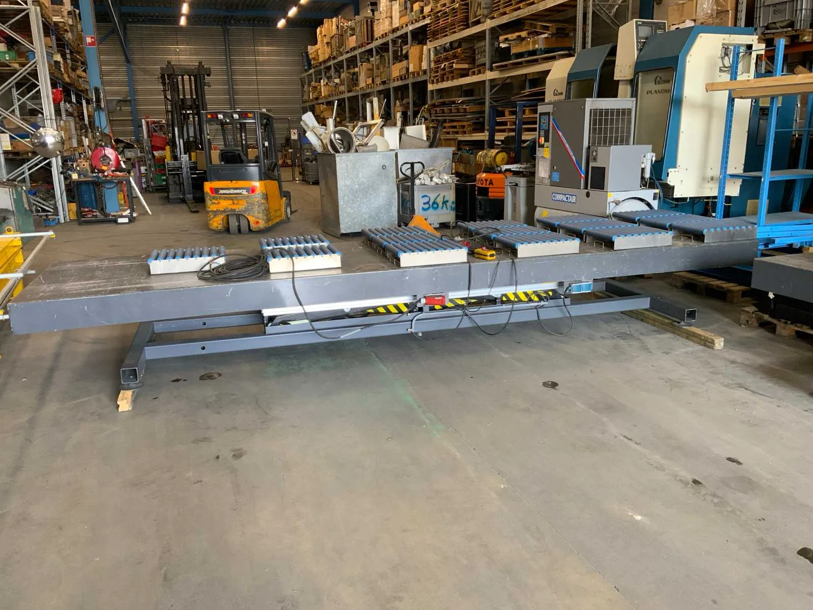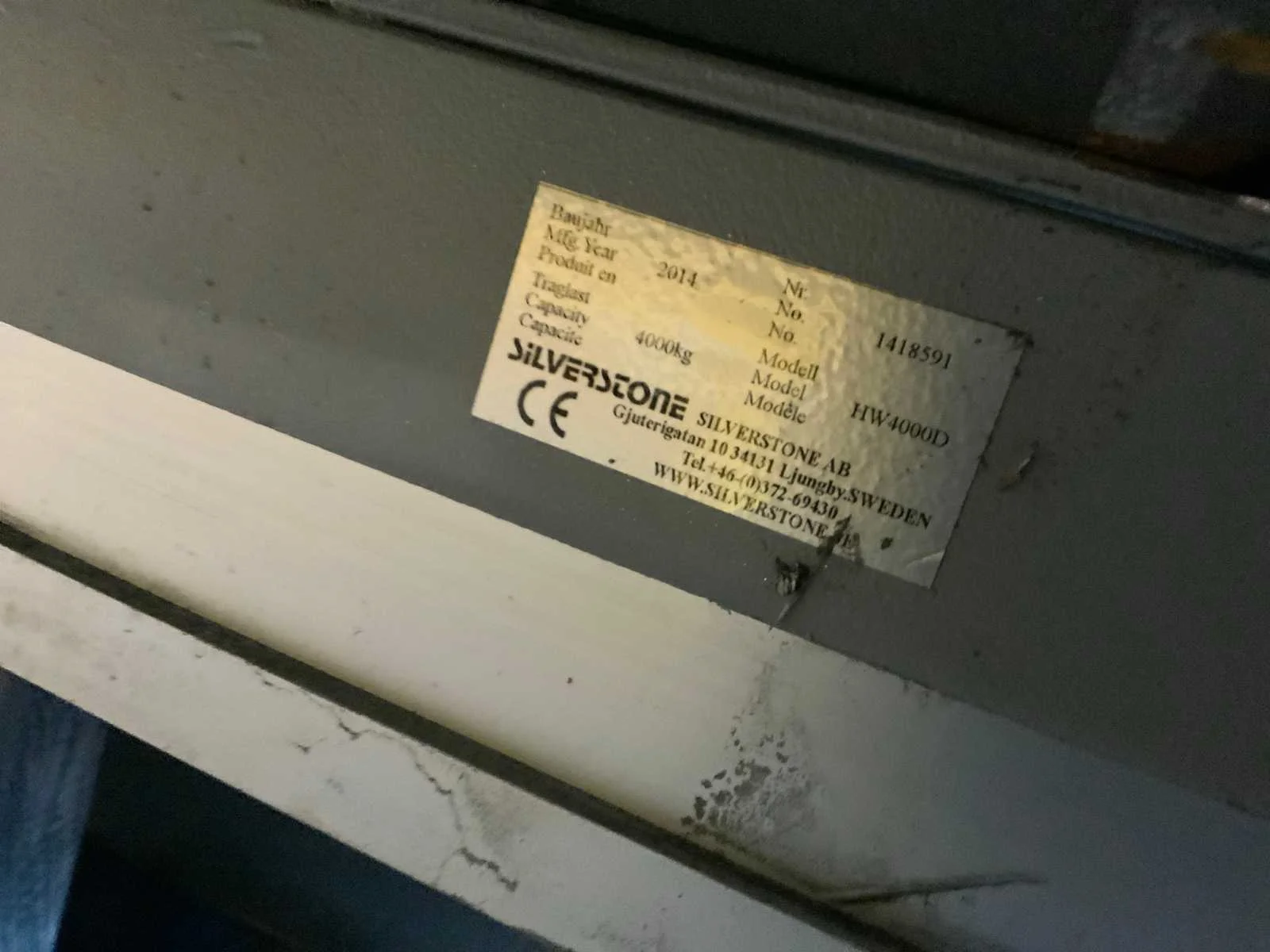 Hefvermogen 4000 kg; voorzien van 15 bovenop gebouwde rollenbanen 400x500 mm; voorzien van onder gebouwde schaarliften; Merk: Silverstone Type: HW4000D Bouwjaar: 2014 Hijsvermogen: 4000kg Afmeting l: 5500mm Afmeting b: 1360mm Afmeting h: 600mm