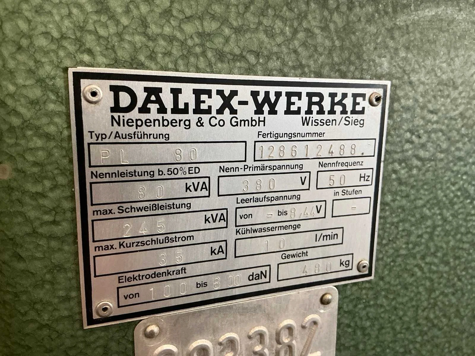Merk: Dalex Type: PL 80 Serienummer: 128612488 Nominale vermogen: 80kVA Max. lasvermogen: 245kVA Uitlading: 550mm Werkslag: 130mm Voetbediening: true Aansluiting: 400V Machinegewicht: 480kg Afmeting l: 1450mm Afmeting b: 620mm Afmeting h: 1500mm