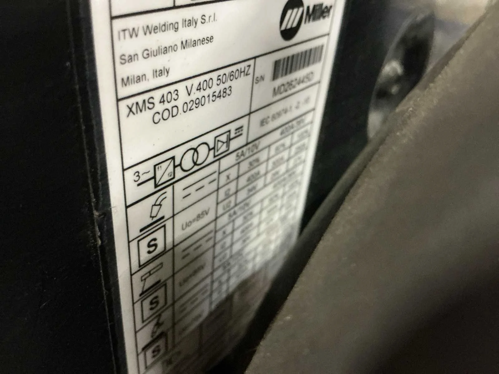 Voorzien van XMS 44 draadaanvoer unit, 1-20 m/min, Merk: Miller Type: XMS 403 Max. lasvermogen: 400A Aansluiting: 380V Machinegewicht: 100kg Afmeting l: 1000mm Afmeting b: 400mm Afmeting h: 1200mm