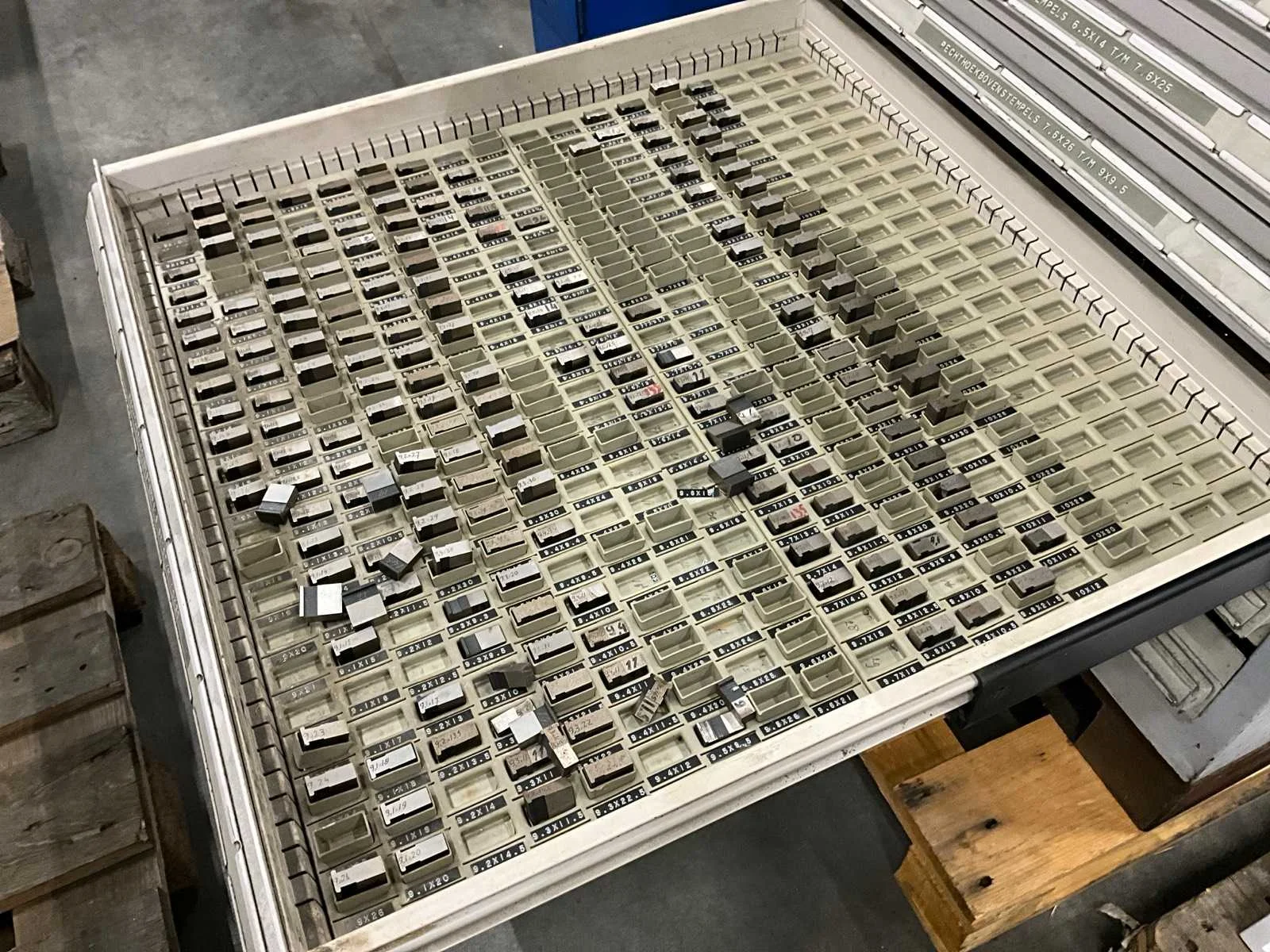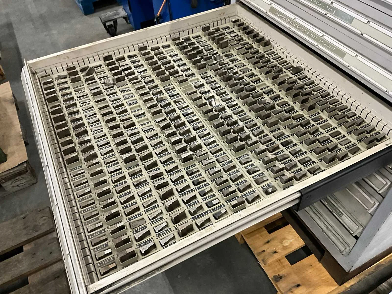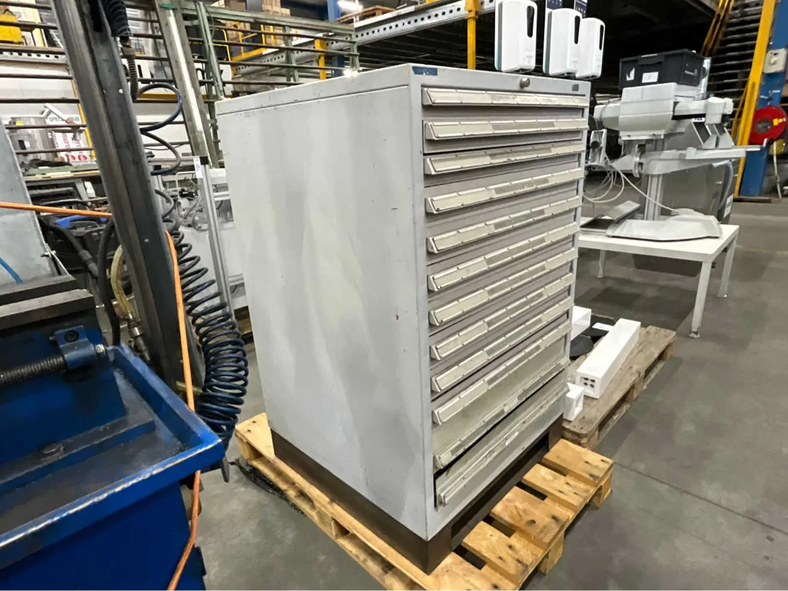 Staal; voorzien van 12 laden; inclusief grote partij stempels diverse afmetingen (rechthoekig / ovaal); Lengte: 76cm Breedte: 80cm Hoogte: 120cm
