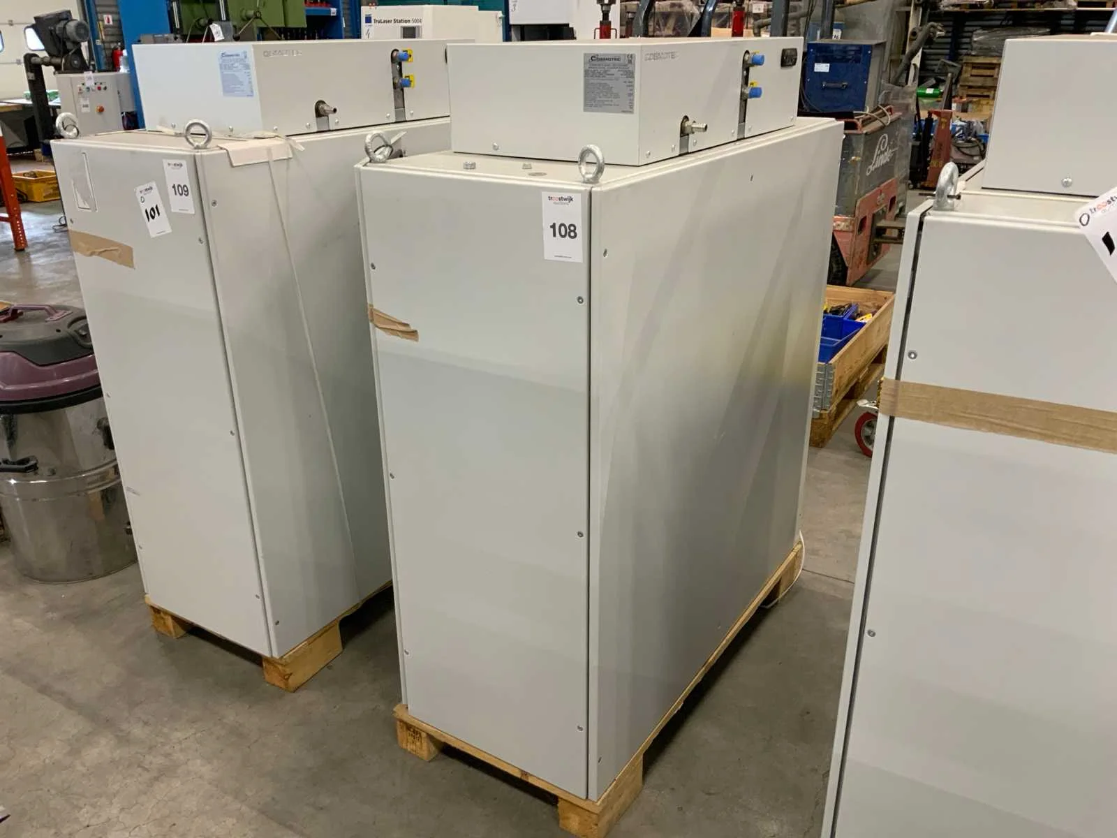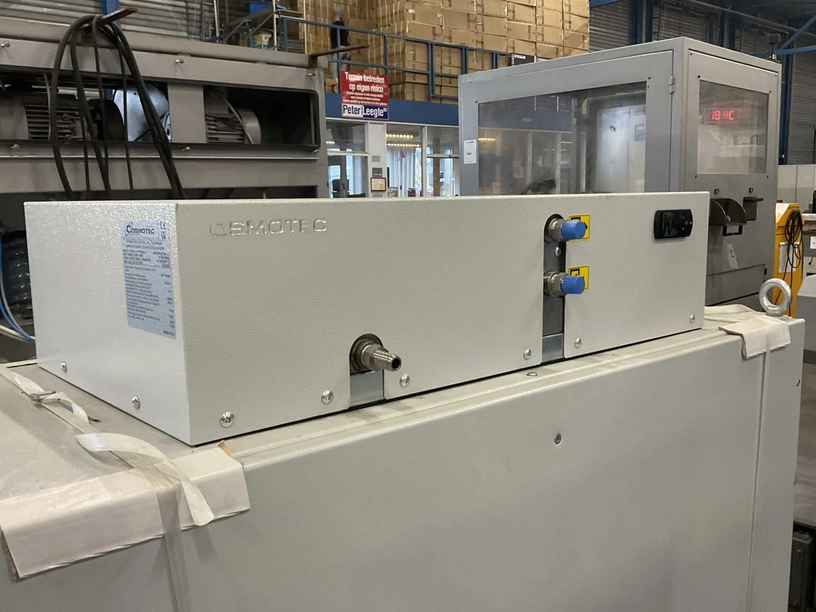 Koel cap. 2,2 kW; volumestroom 150 liter/uur; v.v. schakelkast Merk: Cosmotec Type: EXW15H02207000 1Z Bouwjaar: 2018 Serienummer: 0000789562 Max. temperatuur: 55°c Max. druk: 10bar Aansluiting: 230V Totale afmeting L: 1200mm Totale afmeting Breedte: 500mm Totale afmeting Hoogte: 1450mm