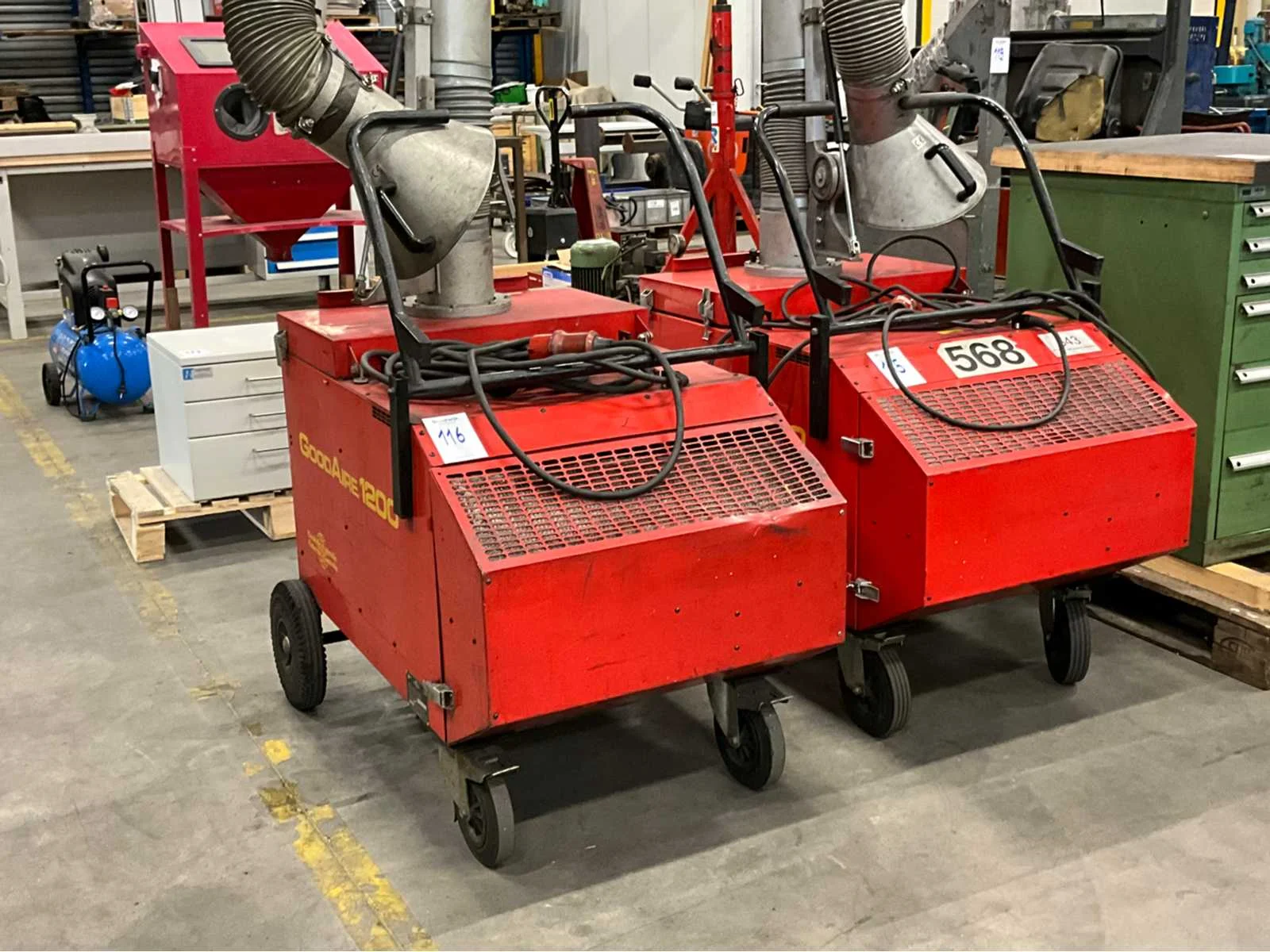 Verrijdbaar; voorzien van knikbare / flexibele lasdamparm; Merk: GoodAire Type: 1200 Aansluiting: 400V Afmeting l: 1200mm Afmeting b: 700mm Afmeting h: 2800mm