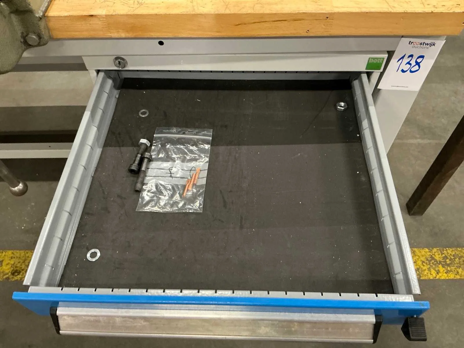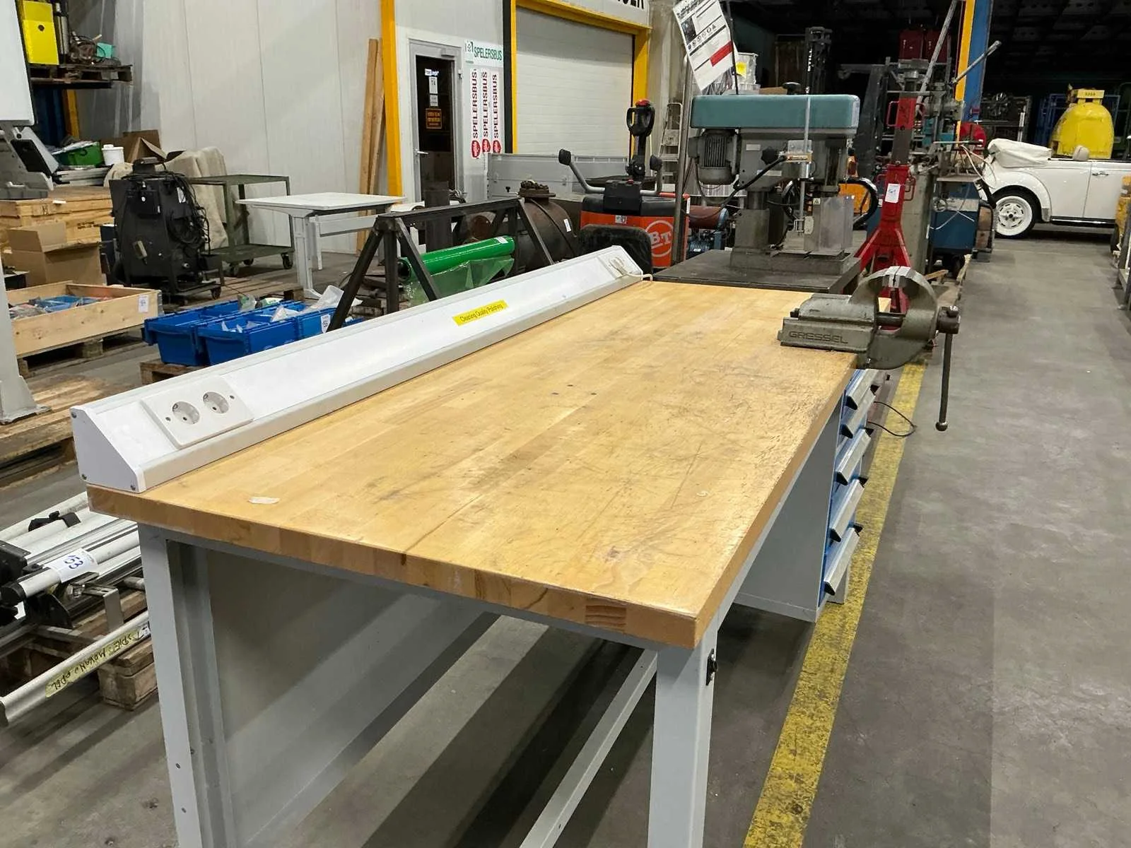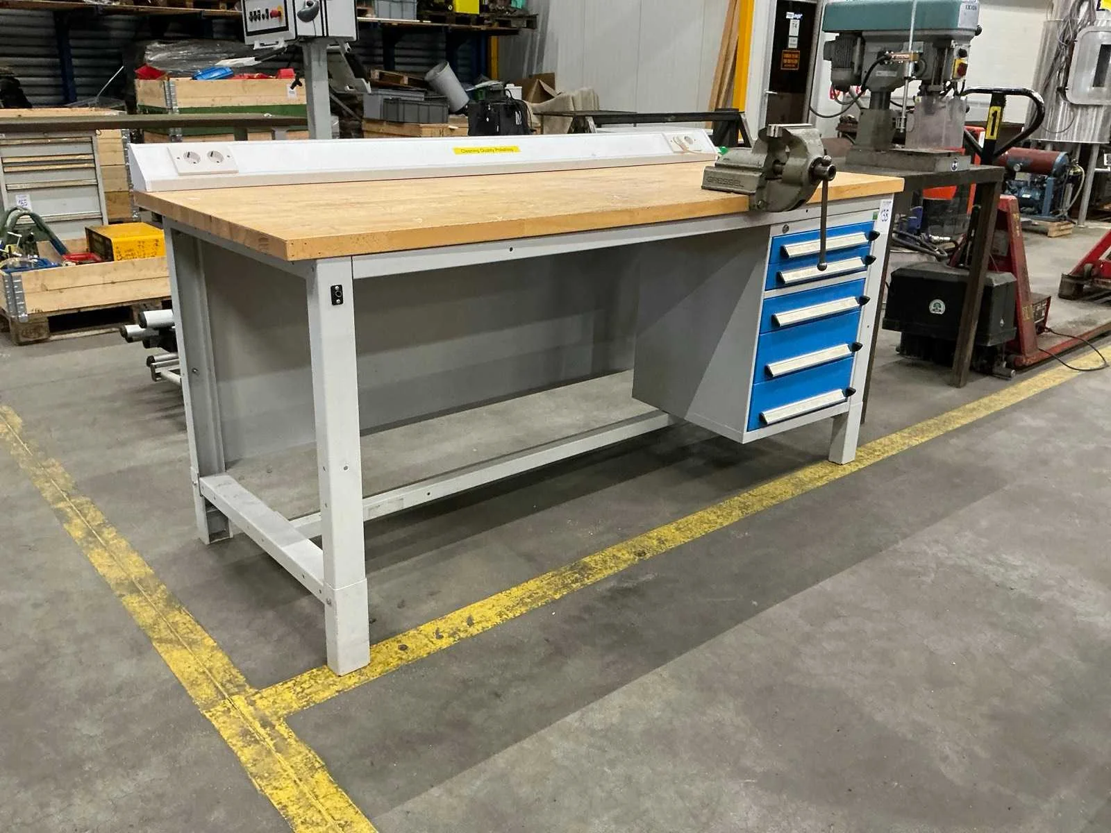 Stalen onderstel voorzien van ladenkast; houtenblad; opbouw met 4x stopcontact 230 Volt; met bankschroef Merk: Bott Breedte: 830mm Lengte: 2000mm Hoogte: 930mm