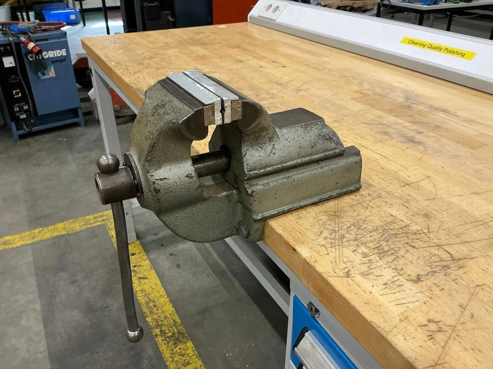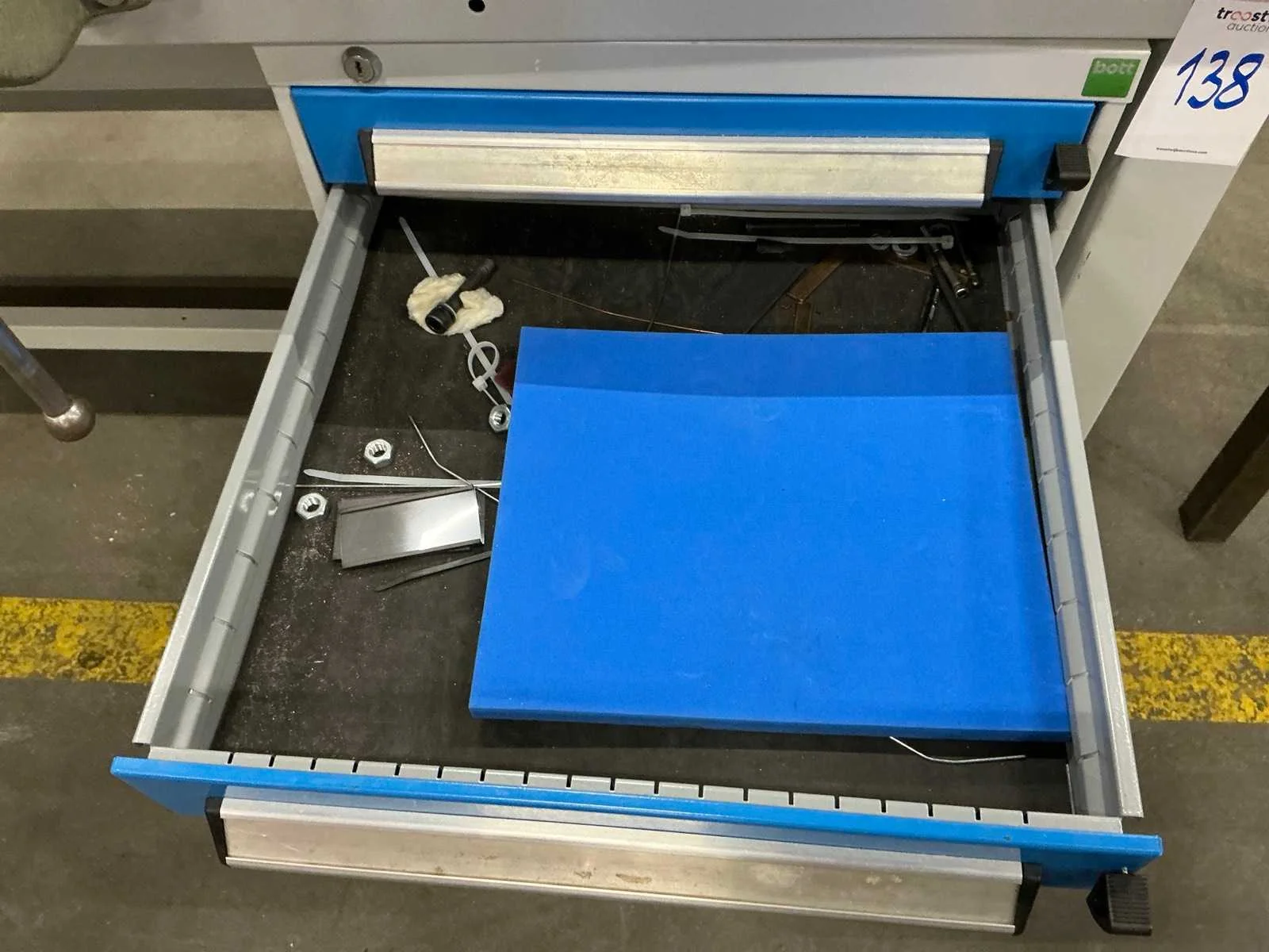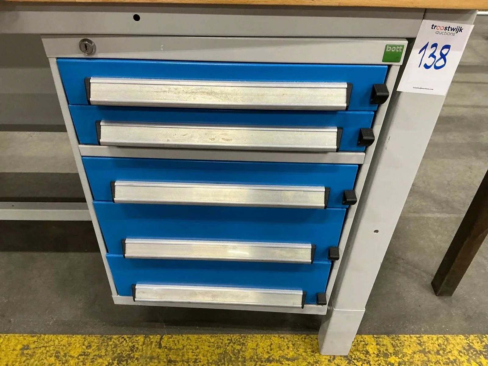 Stalen onderstel voorzien van ladenkast; houtenblad; opbouw met 4x stopcontact 230 Volt; met bankschroef Merk: Bott Breedte: 830mm Lengte: 2000mm Hoogte: 930mm