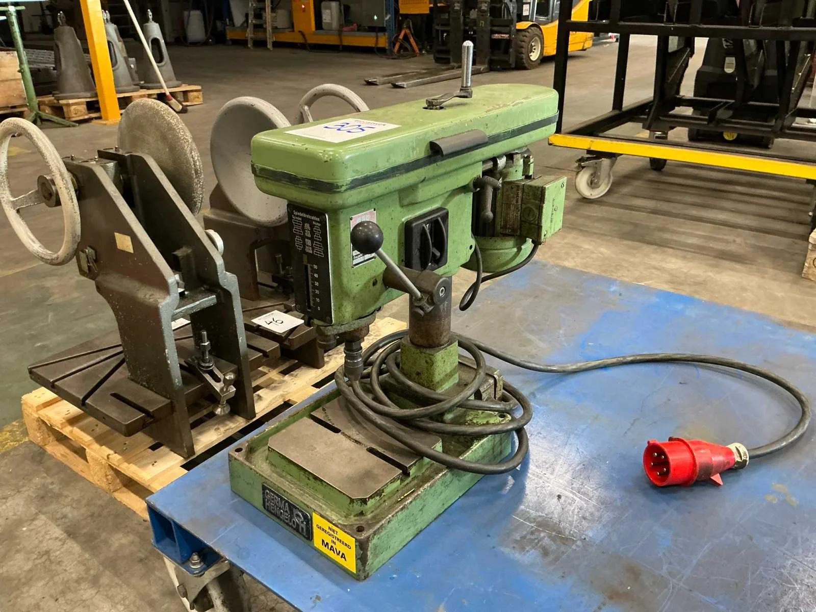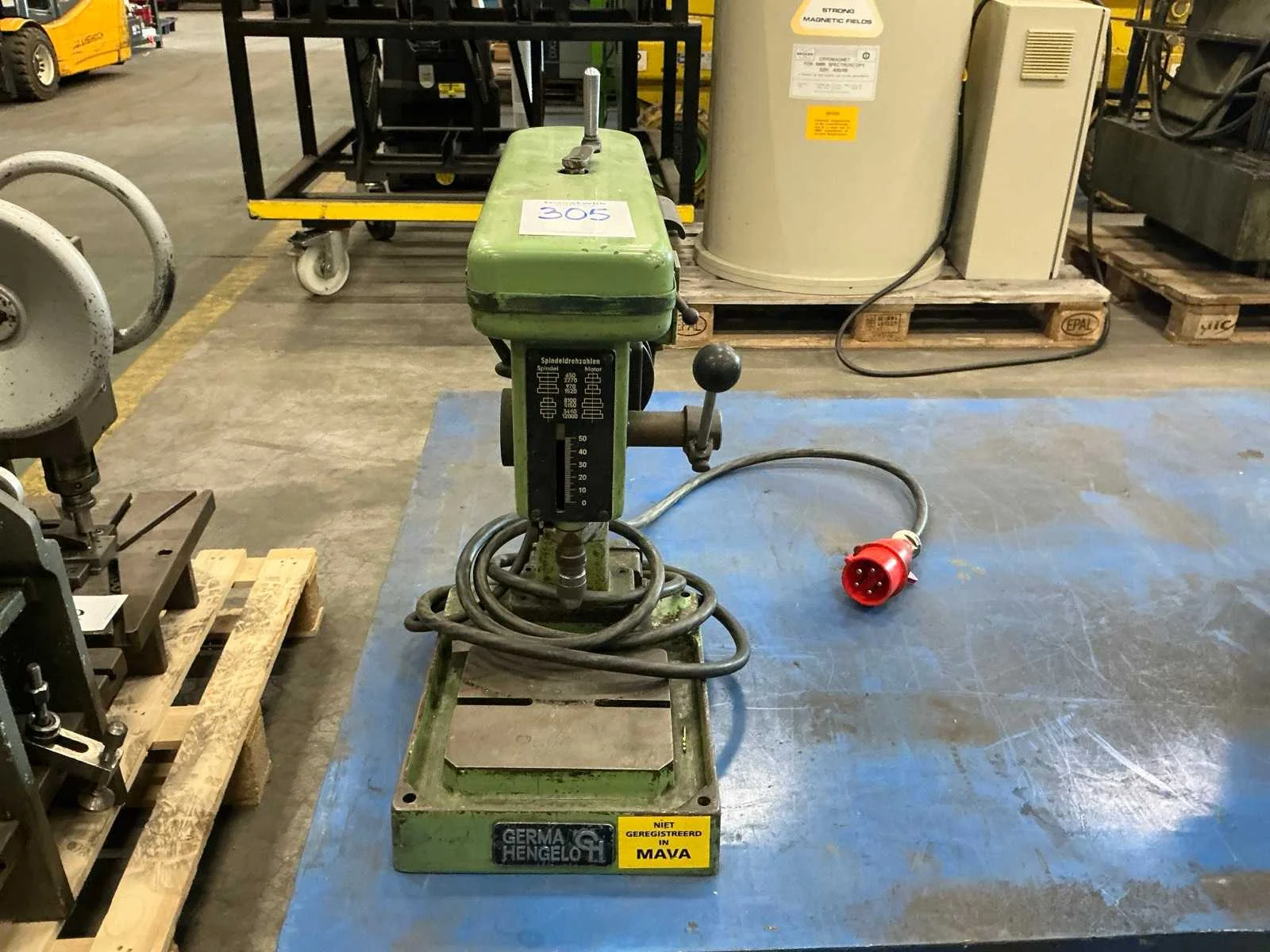Merk: Germa Type: B4 Aantal snelheden: 8 Spindelsnelheid van n =: 650rpm Spindelsnelheid tot n =: 12000rpm Boordiepte: 50mm Uitlading: 130mm Tafel afmeting l: 160mm Tafel afmeting b: 180mm Aansluiting: 400V Afmeting l: 550mm Afmeting b: 250mm Afmeting h: 500mm