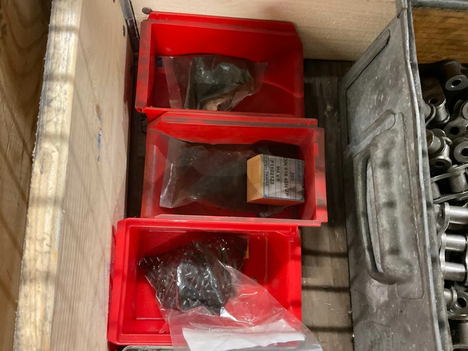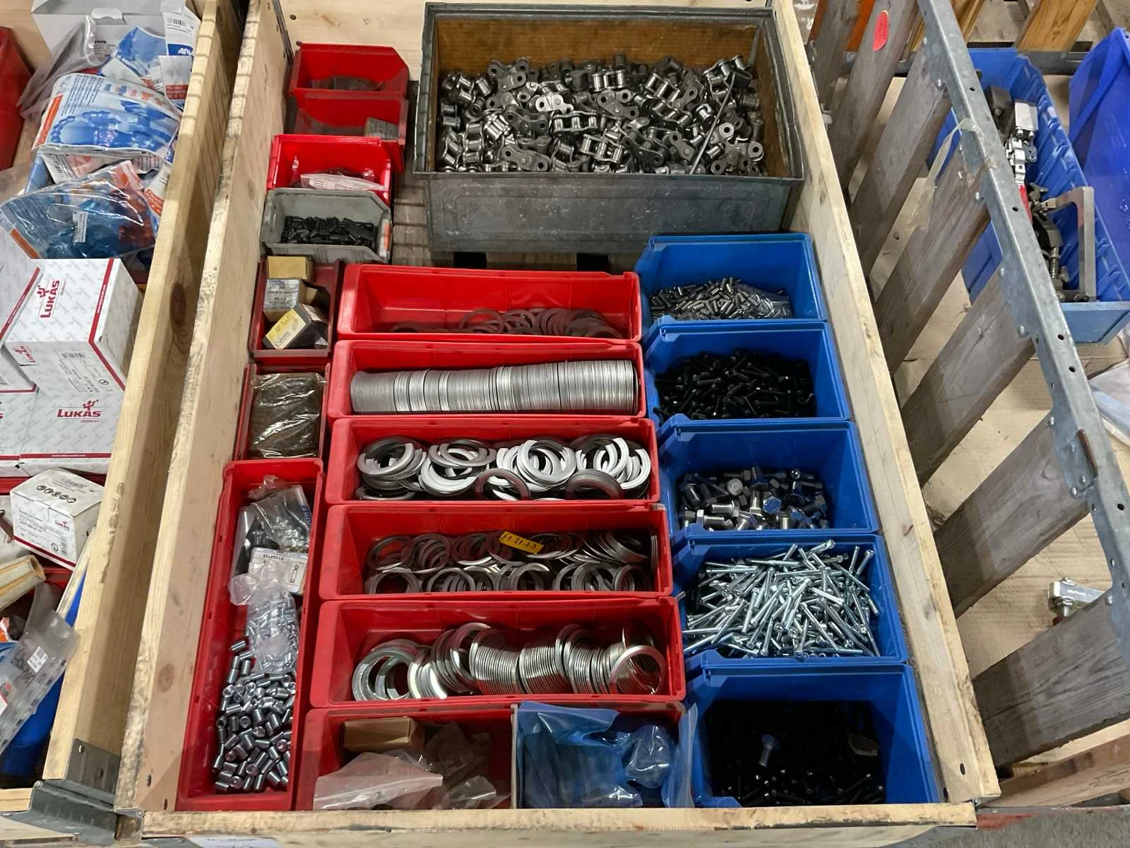 Diverse bouten e.d. in kunststof opbergbakken Pallet en palletrand niet inbegrepen