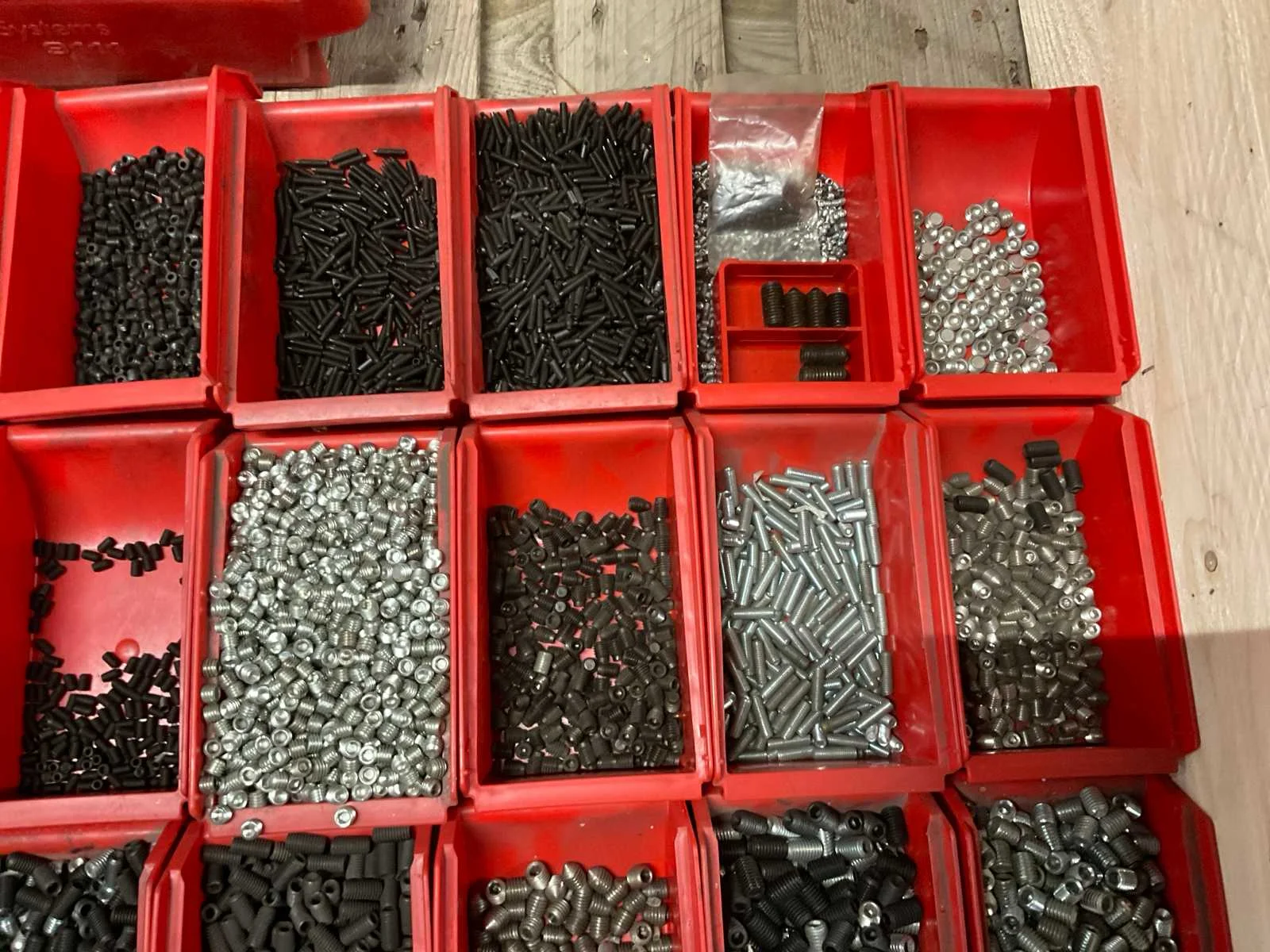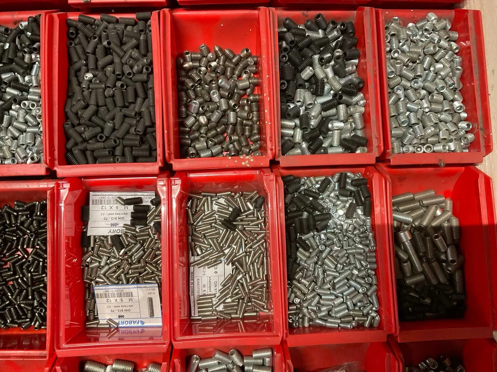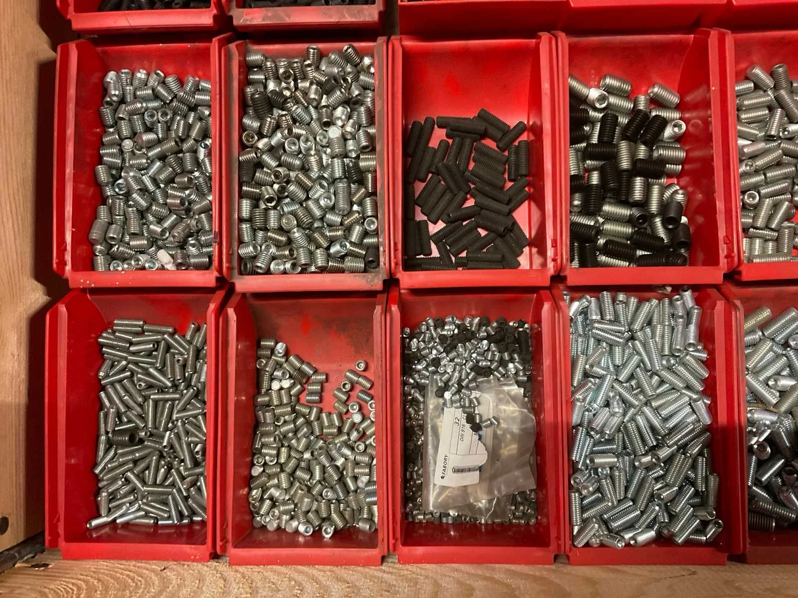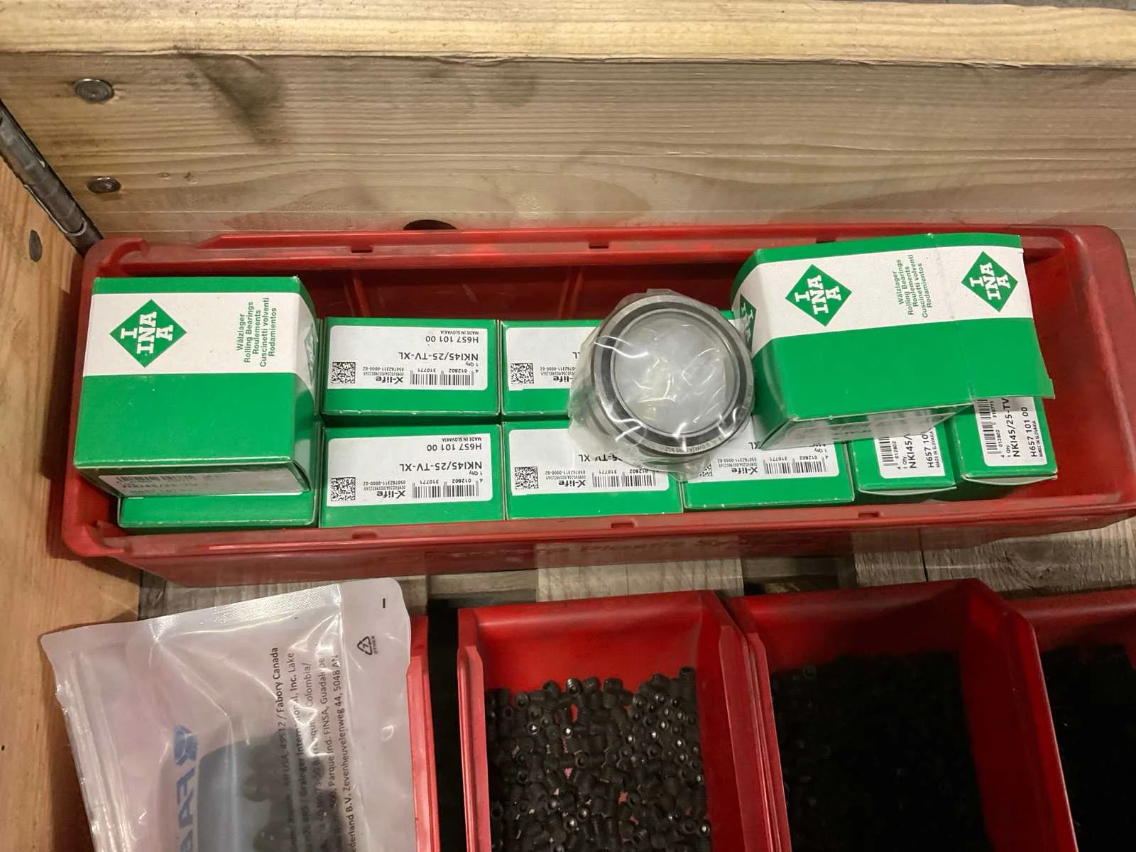 Diverse formaten schroefdraadbussen waaronder imbus, in kunststof opbergbakken, alsmede naadhulslagers Pallet en palletrand niet inbegrepen