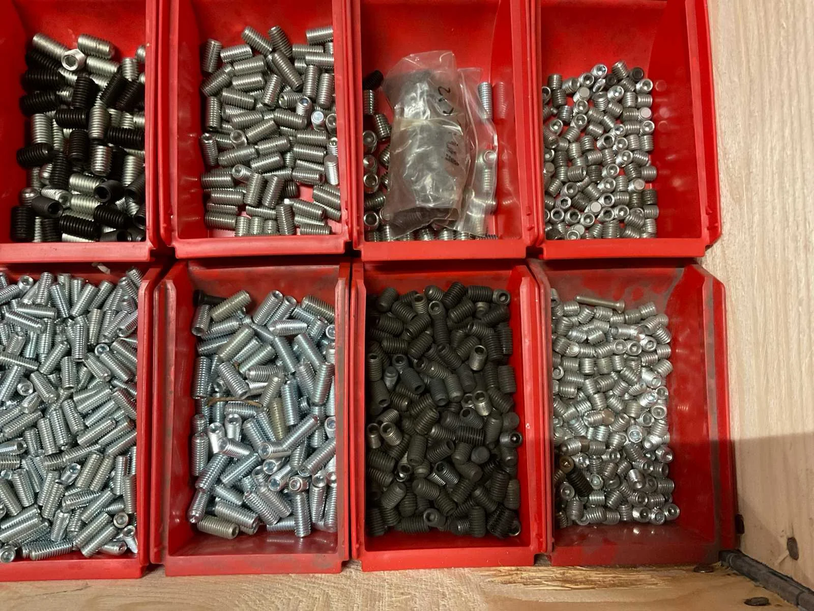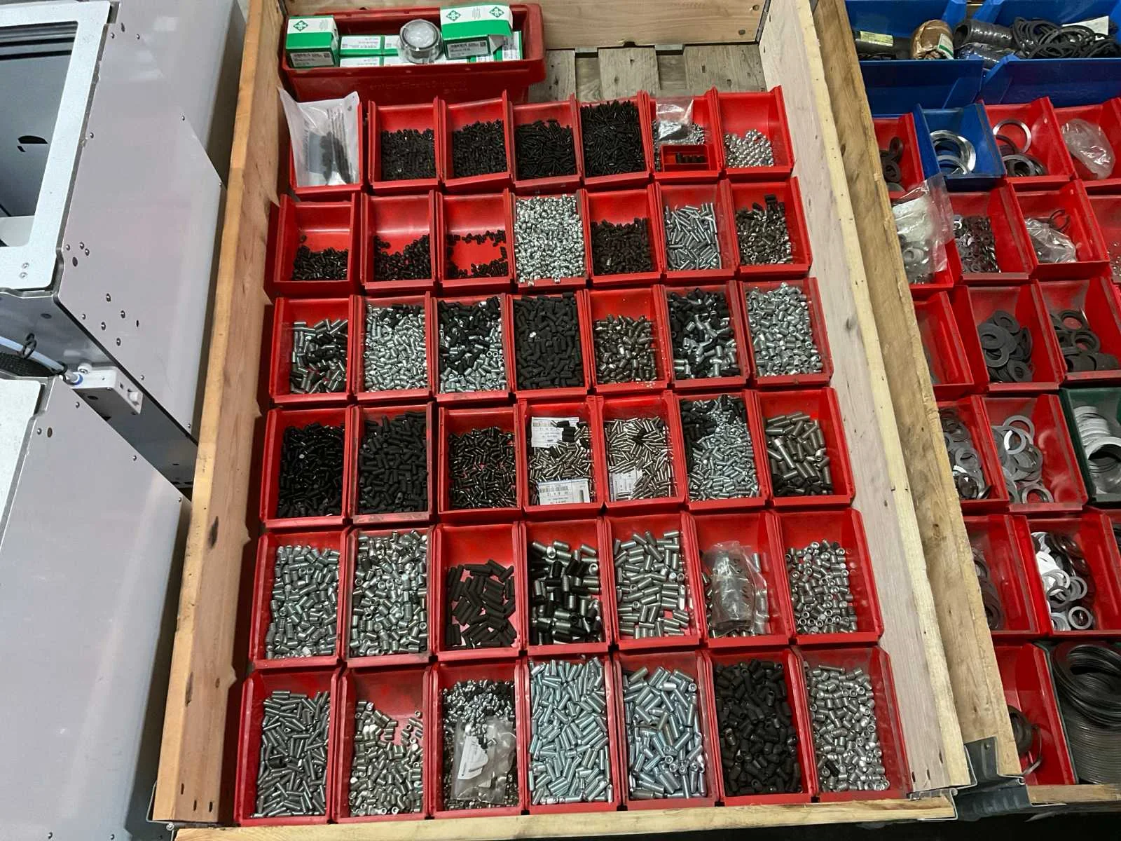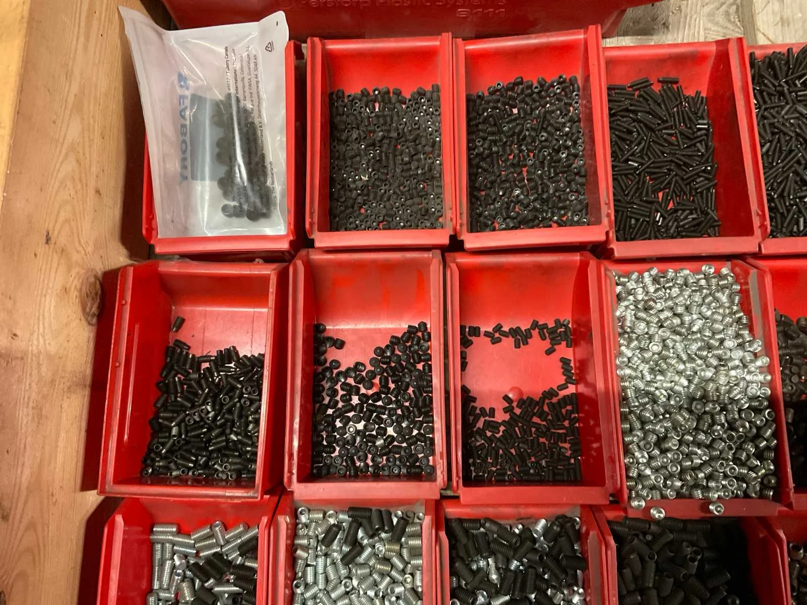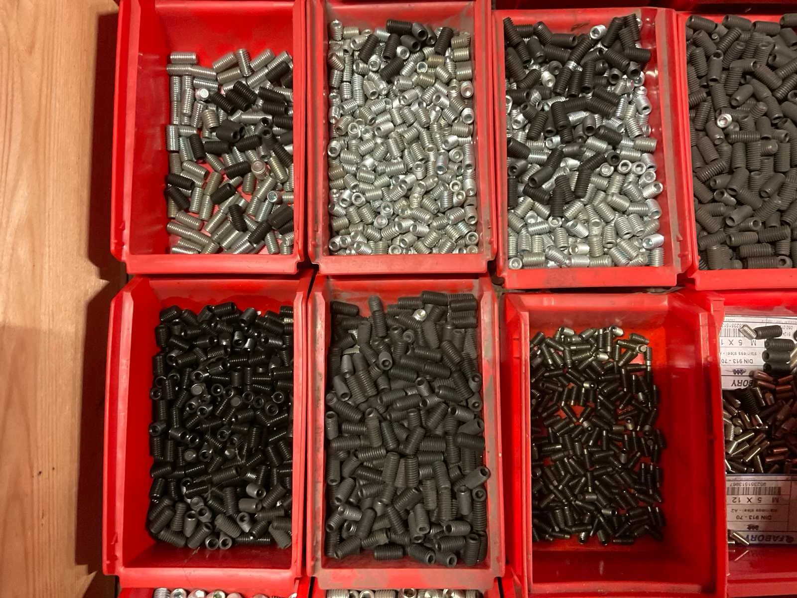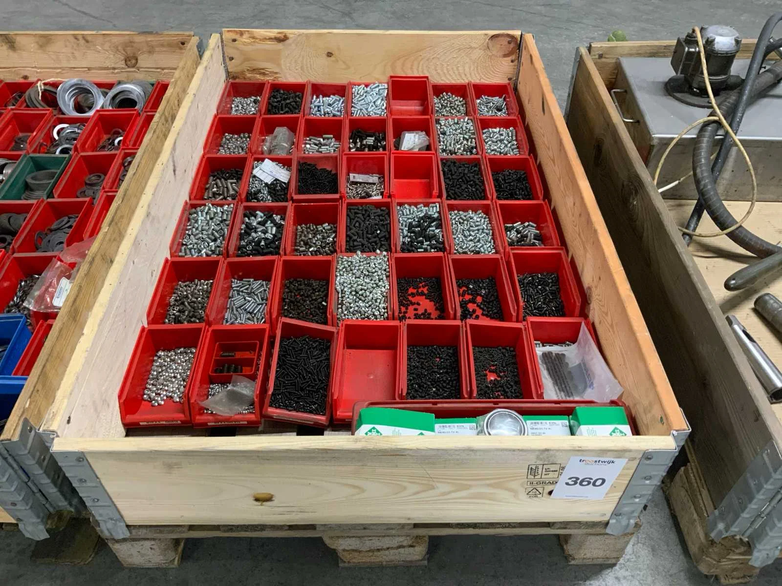 Diverse formaten schroefdraadbussen waaronder imbus, in kunststof opbergbakken, alsmede naadhulslagers Pallet en palletrand niet inbegrepen