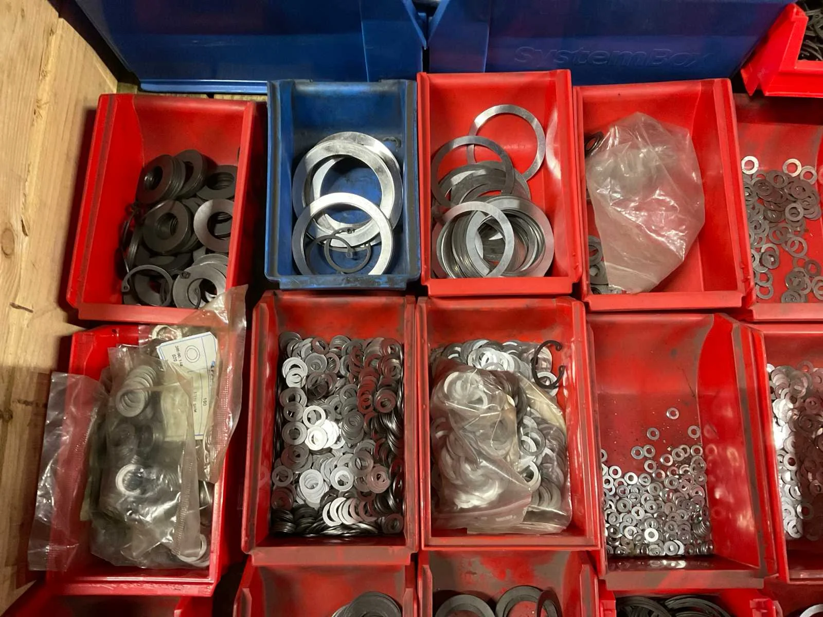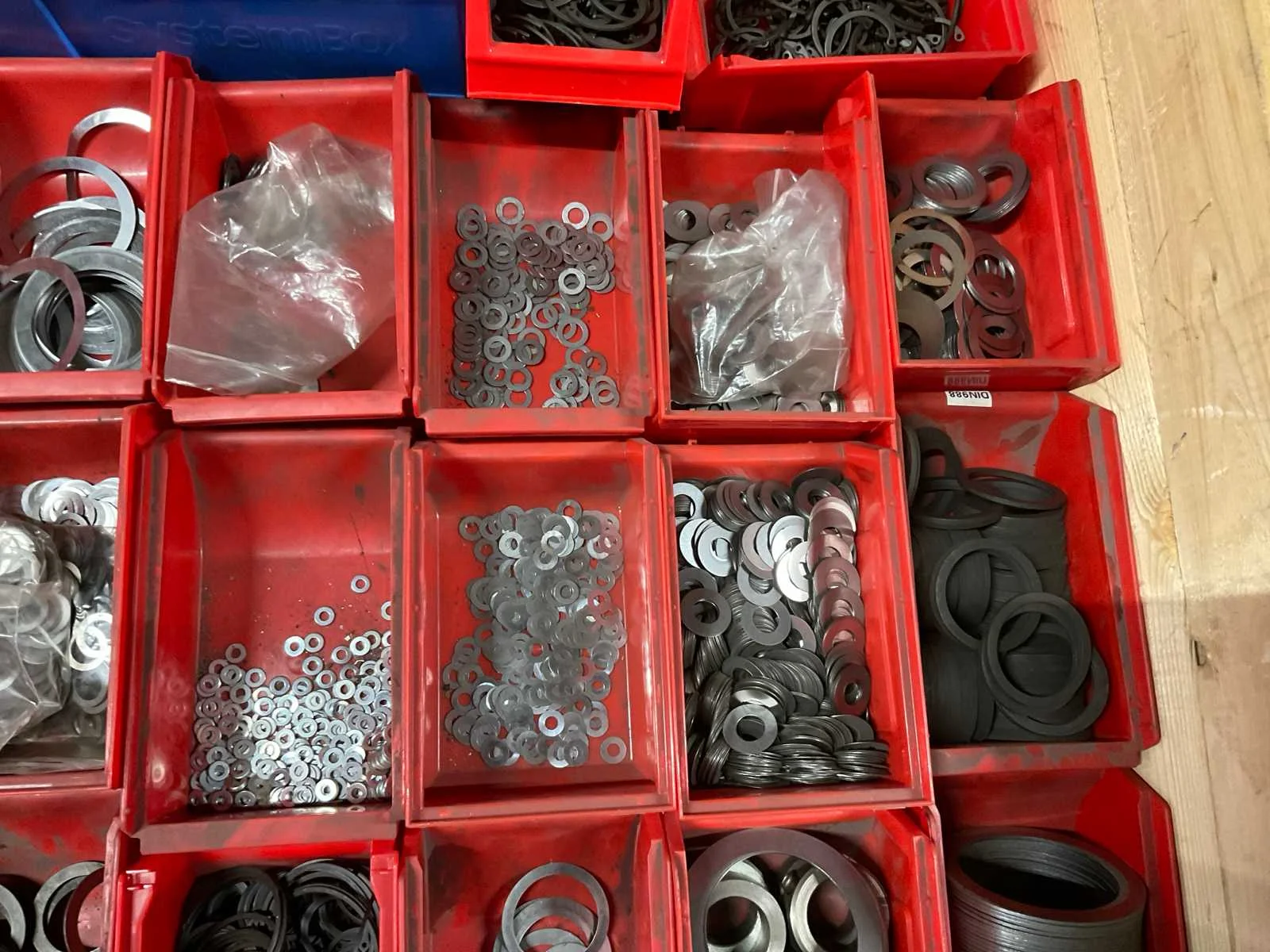 Partij in diverse afmetingen in kunststof opbergbakken Pallet en palletrand niet inbegrepen