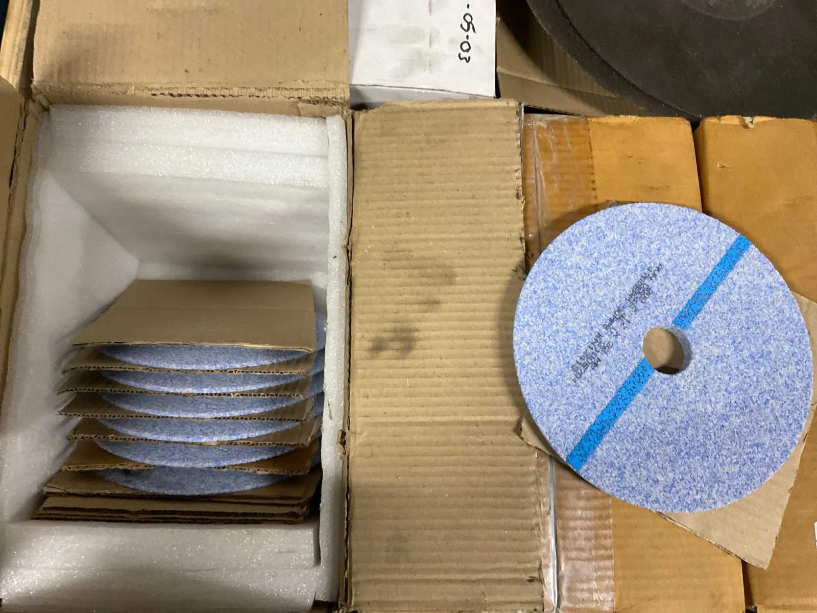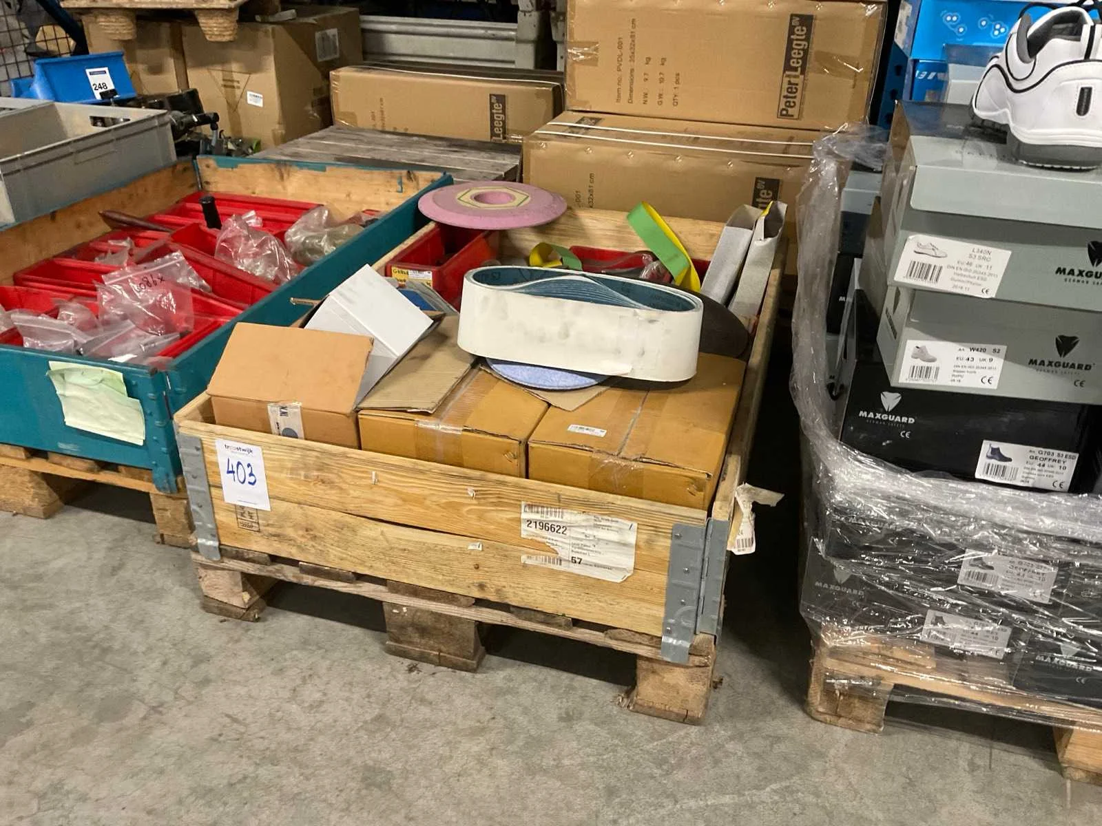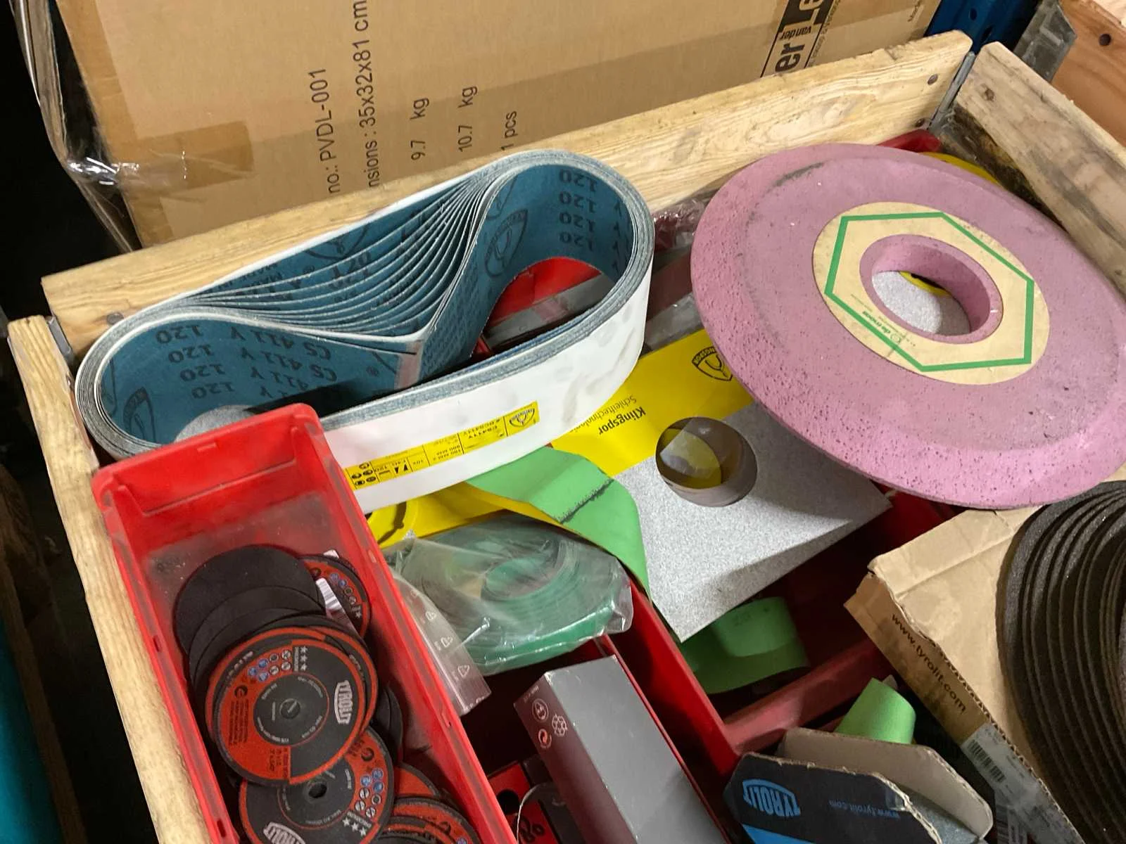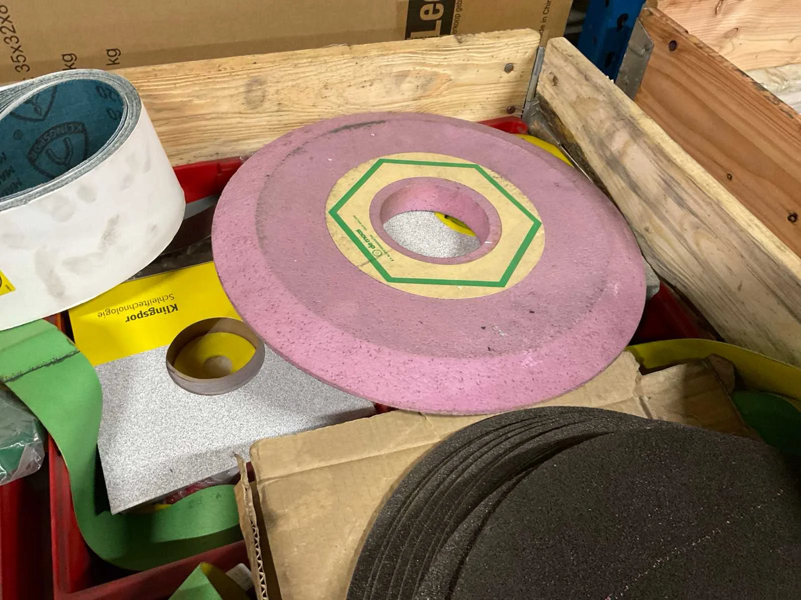 Bestaande uit diverse slijpschijven, slijpstenen, kettingen, schuurband, kunststof afdopmaterialen en kunststof ton ø ca. 50 cm hoogte ca. 70 cm Pallet en palletrand niet inbegrepen