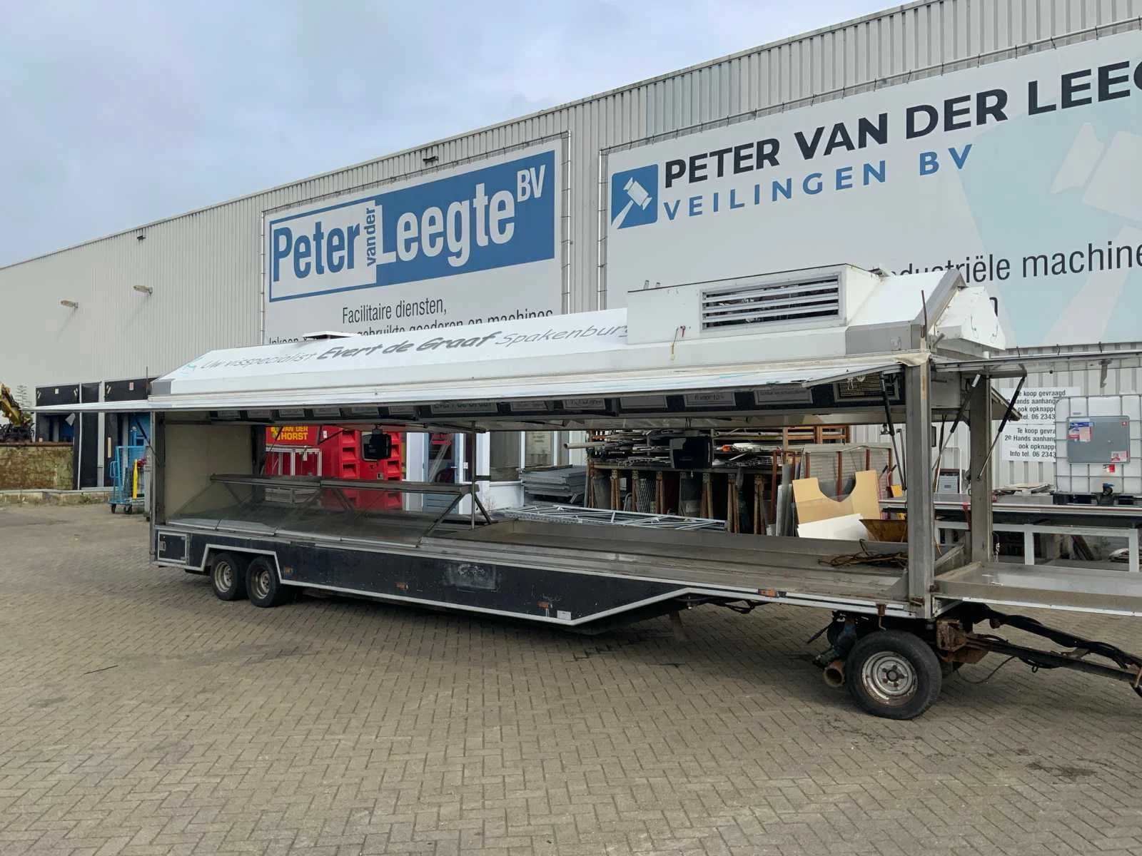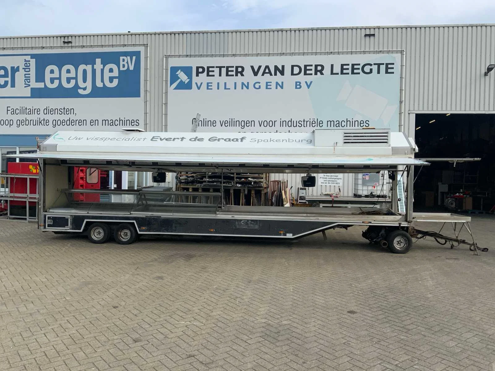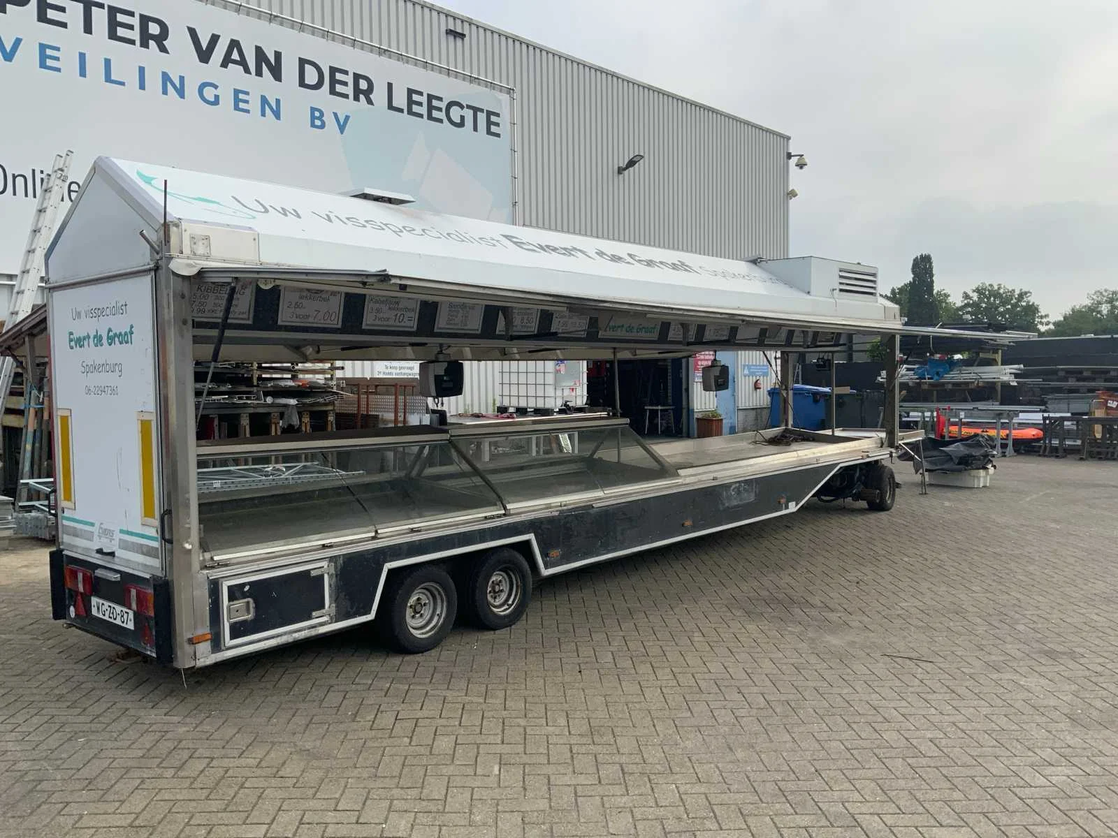 Inclusief toonbank met koeling, verlichting, 2 Avery Berkel digitale hangweegschalen, type: IM500, weegvermogen: min. 100 g / max. 15 kg, aansluiting 230 volt, voorzien van hydraulische radiografische mover met afstandbediening en tochtstroken Merk: Evers Type: EKB 353 Bouwjaar: 2002 Chassisnummer: W09A903351EE18444 Aantal assen: 3 Ledig gewicht: 4600kg Laadvermogen: 800kg Datum eerste toelating: 2003-01-27 Datum eerste toelating (NL): 2003-01-27 Kenteken: WG-ZD-87 Hoogte: 302cm Lengte: 900cm Breedte: 157cm