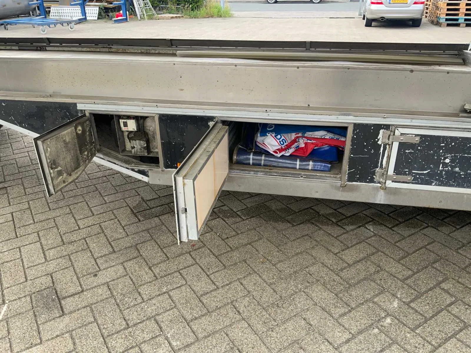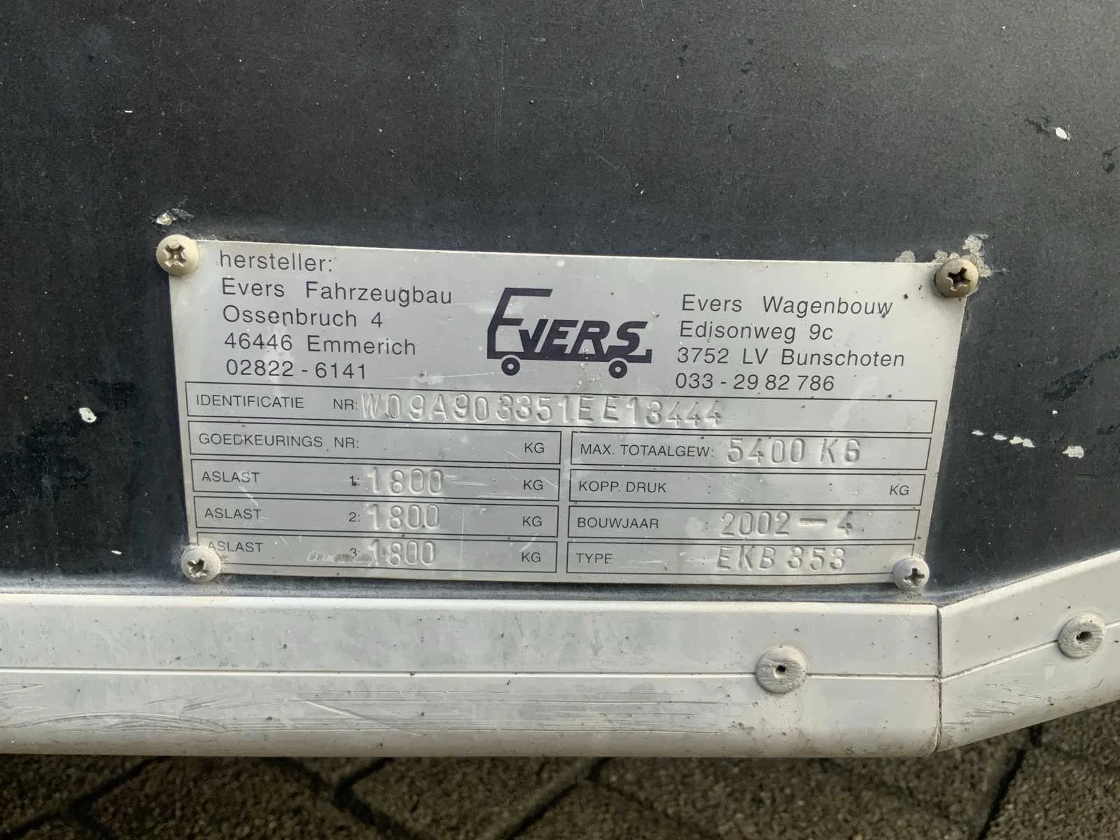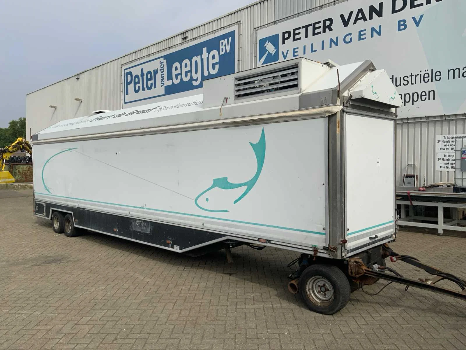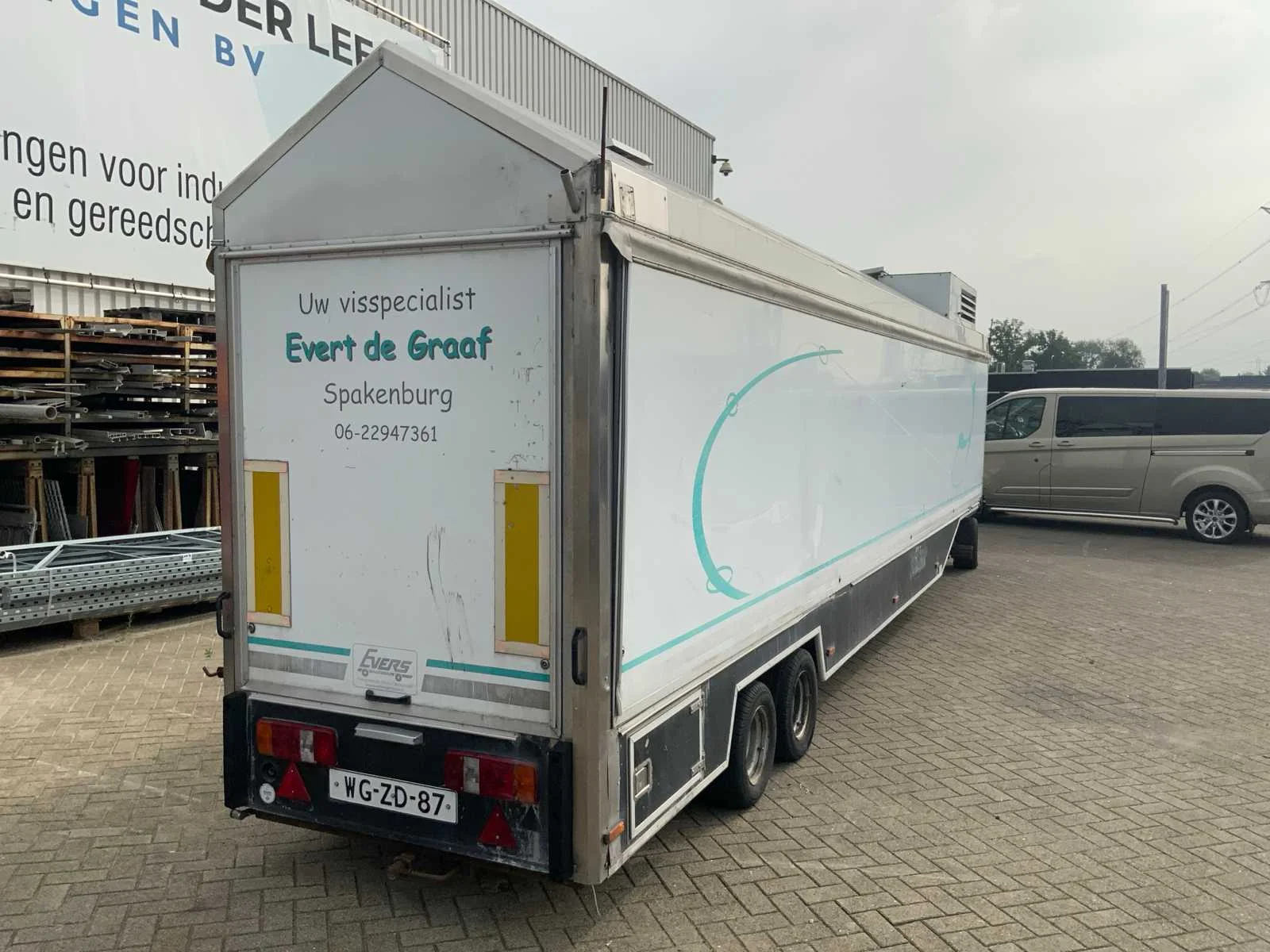 Inclusief toonbank met koeling, verlichting, 2 Avery Berkel digitale hangweegschalen, type: IM500, weegvermogen: min. 100 g / max. 15 kg, aansluiting 230 volt, voorzien van hydraulische radiografische mover met afstandbediening en tochtstroken Merk: Evers Type: EKB 353 Bouwjaar: 2002 Chassisnummer: W09A903351EE18444 Aantal assen: 3 Ledig gewicht: 4600kg Laadvermogen: 800kg Datum eerste toelating: 2003-01-27 Datum eerste toelating (NL): 2003-01-27 Kenteken: WG-ZD-87 Hoogte: 302cm Lengte: 900cm Breedte: 157cm