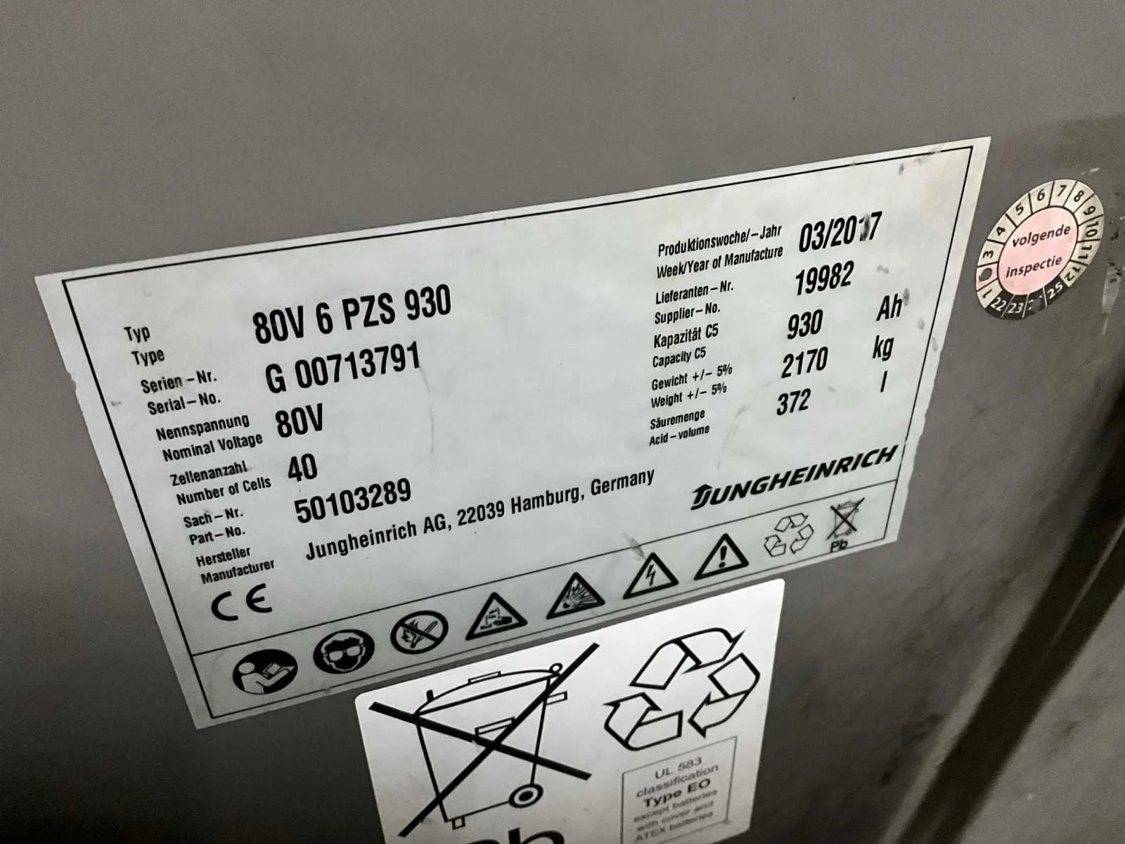 80 Volt; met verrijdbaar frame Testcapaciteit 87% Merk: Jungheinrich Type: 80V 6 PZS 930 Bouwjaar: 2017 Serienummer: G 00713791 Eigen gewicht: 2170kg Totale afmeting L: 995mm Totale afmeting Breedte: 1025mm Totale afmeting Hoogte: 770mm