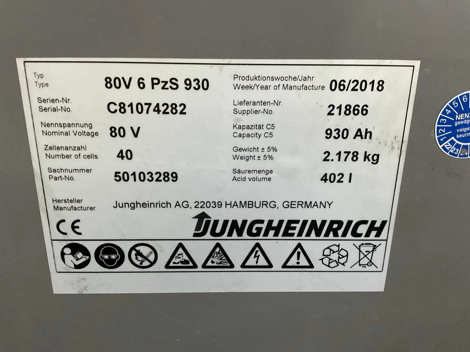 Automatisch vulsysteem Testcapaciteit 96% Merk: Jungheinrich Type: 80v 930Ah Bouwjaar: 2018 Serienummer: C81074282 Eigen gewicht: 2178kg Totale afmeting L: 998mm Totale afmeting Breedte: 1030mm Totale afmeting Hoogte: 786mm
