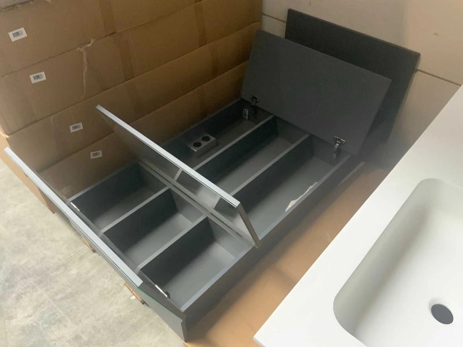 Bestaande uit Badmeubel en spiegelkast Merk: Reva Model: Matt Antracite Spiegelkast: true Lades: 4 Softclose: true
