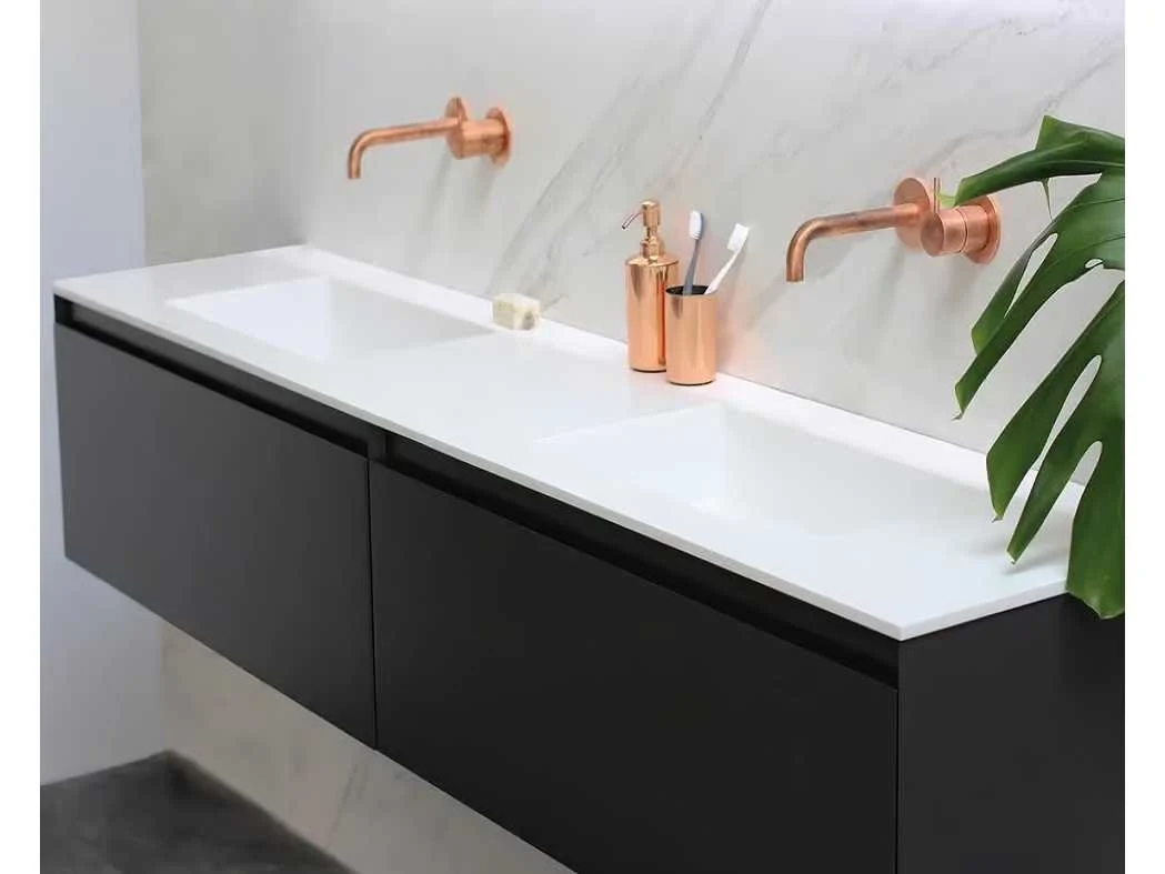 Betreft maatwerk blad. Foto betreft voorbeeld, gebruik de kijkdag voor een goed beeld van dit kavel. Merk: Blies Model: Invia 50 Model A dubbel Kleur: Calacatta mat wit Lengte: 254cm Breedte: 45cm Hoogte: 1cm