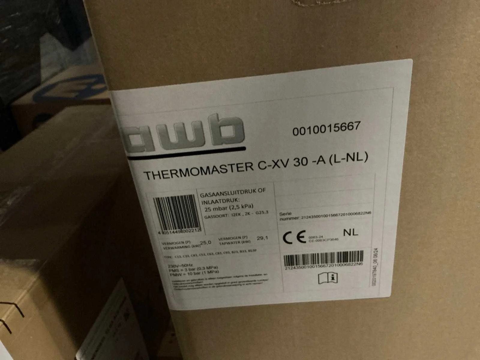 Awb ThermoMaster CXV gaswand combiketel, CW label 4, warmtewisselaar aluminium, gesloten uitvoering, open uitvoering mogelijk, nom. vermogen 80-60 grC 25.1kW, nom. vermogen 50-30 grC 26.7kW, nom. belasting bovenwaarde 28.6kW, nom. belasting onderwaarde 25.7kW, verwarmingsvermogen instelbaar, Merk: AWB Type: Thermomaster C-XV 30-A HR: true Aansluiting: 230V