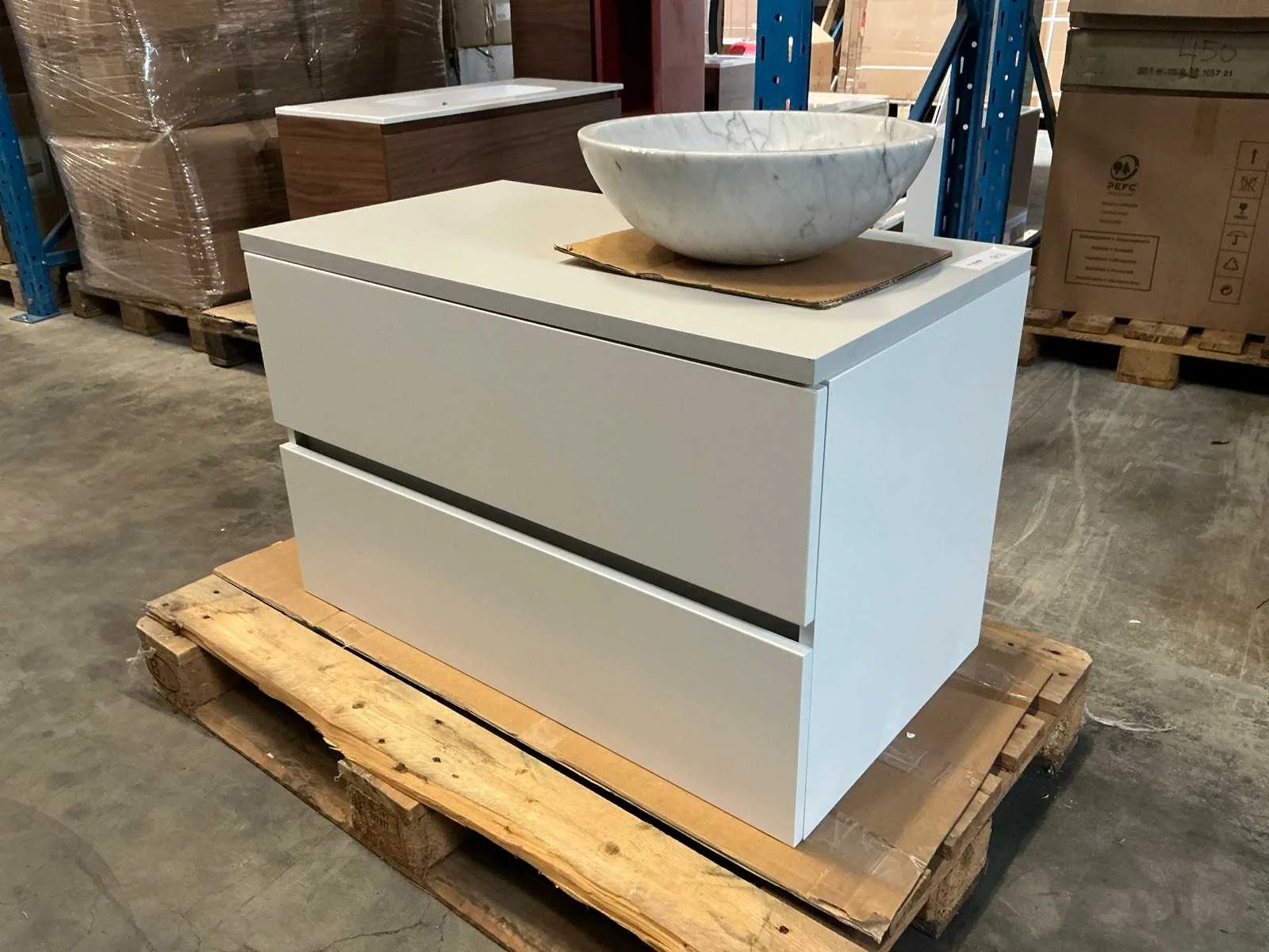 Merk: Riho Model: Avella Hoogte: 56cm Lengte: 90cm Breedte: 50cm Materiaal: Hout Kleur: Mat wit Waskom: Ja, 40x40cm Lades: 2 Softclose: true