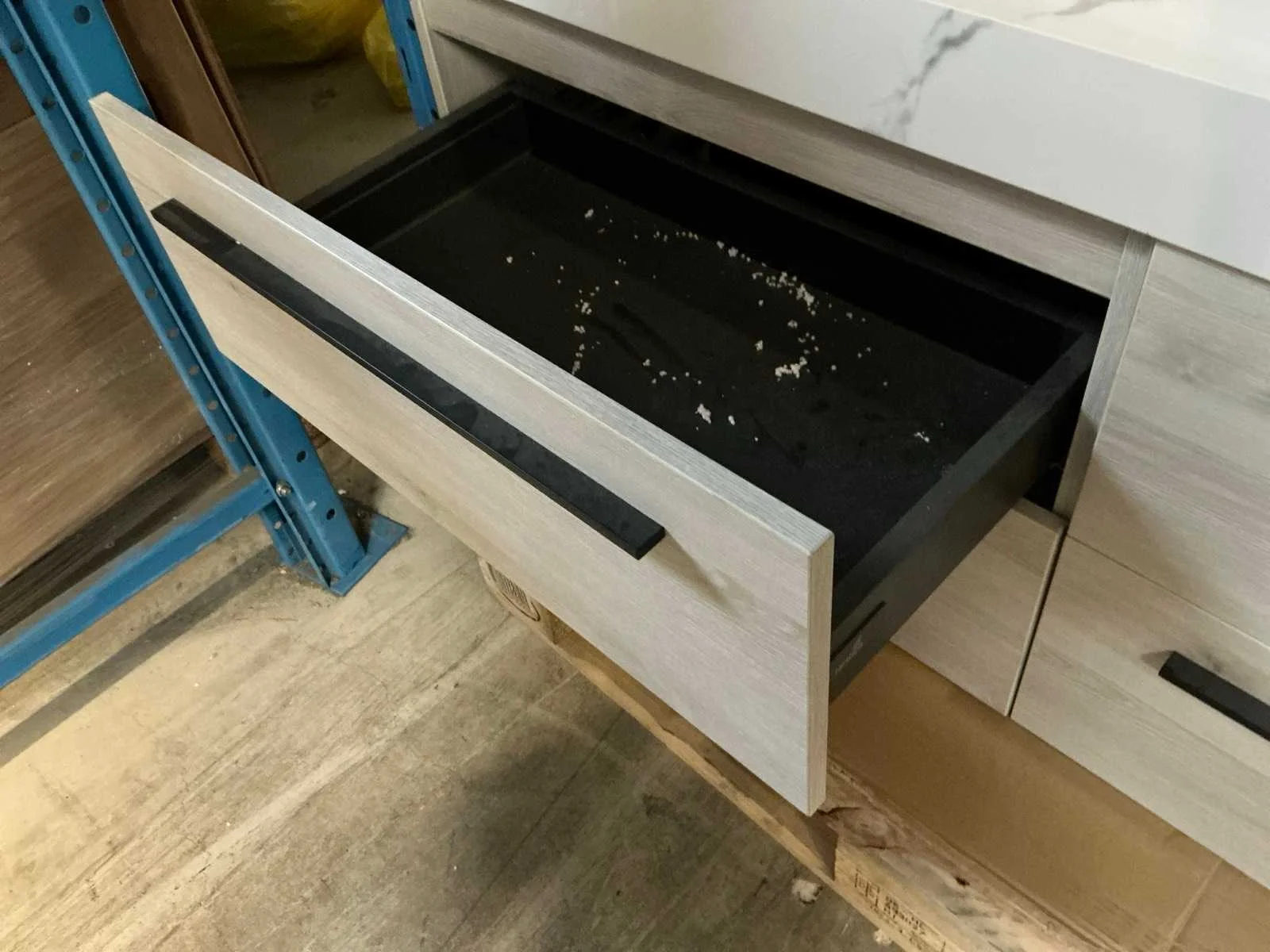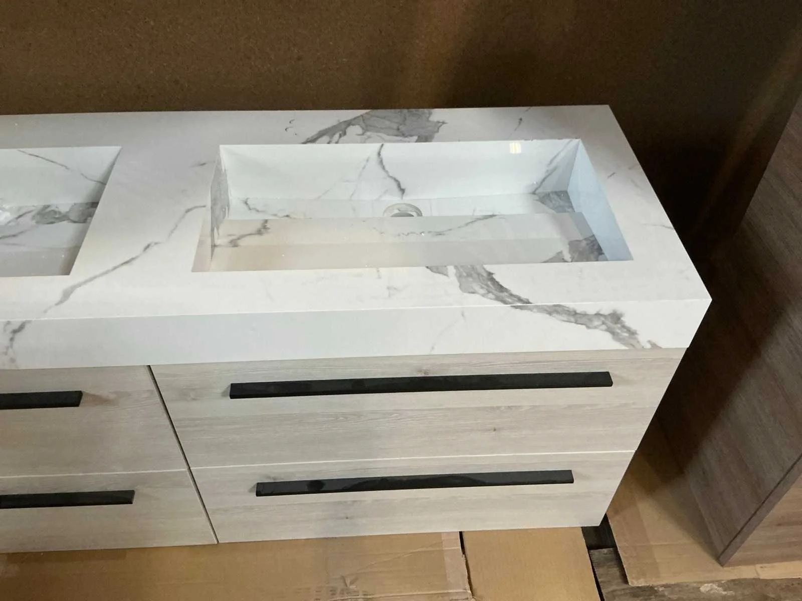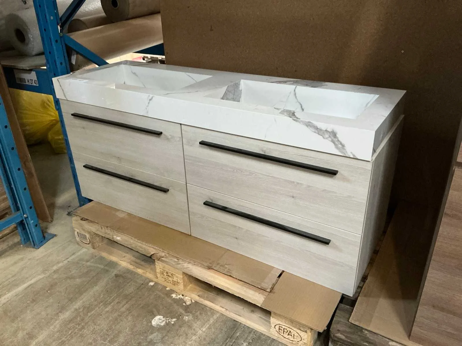 Merk: Riho Hoogte: 60cm Lengte: 140cm Breedte: 45cm Materiaal: Hout / keramiek Kleur: Licht oak Wastafel: 2 spoelbakken, geen kraangat Onderkast: Ja Lades: 4 Softclose: true