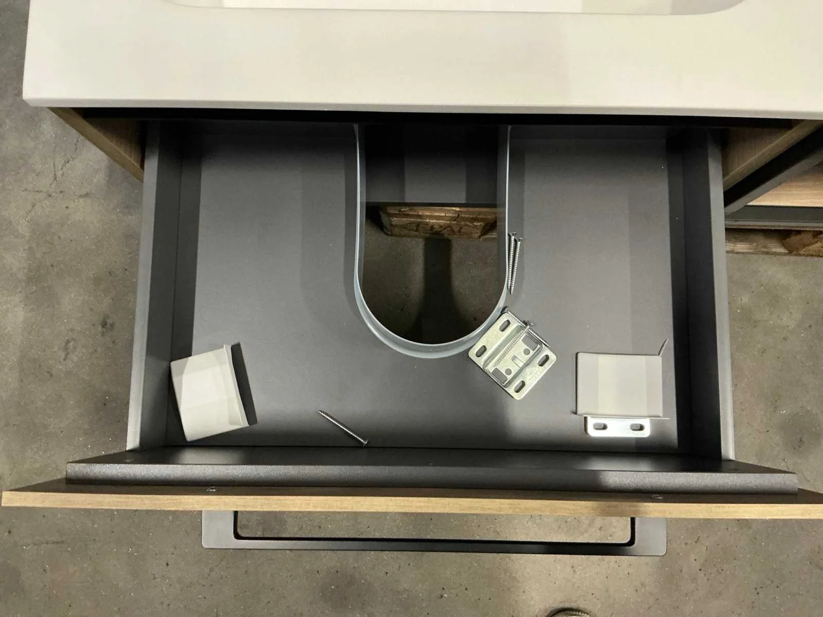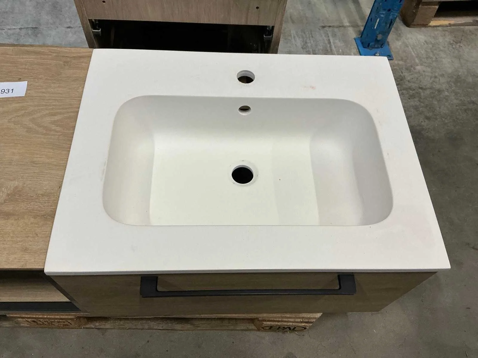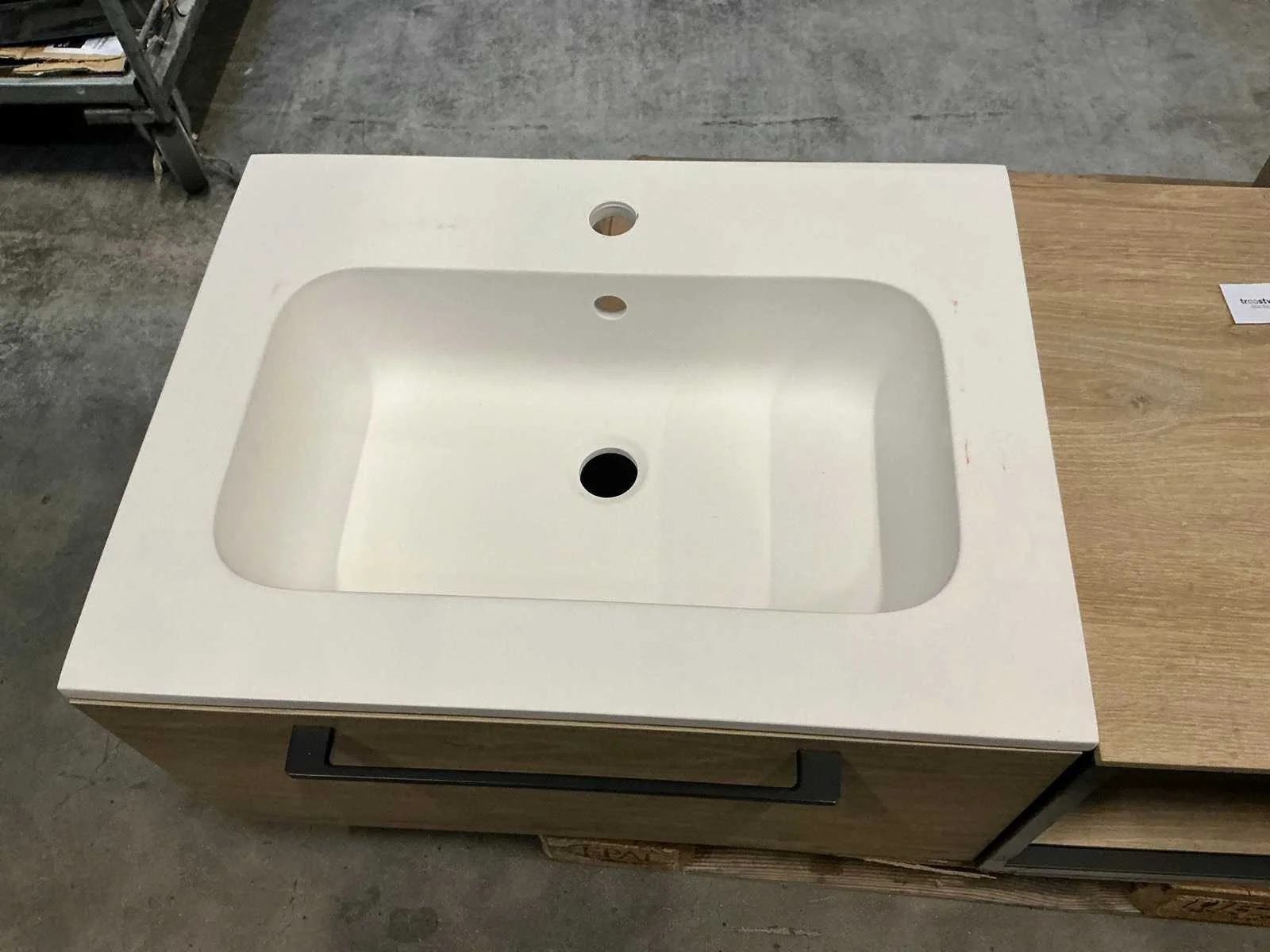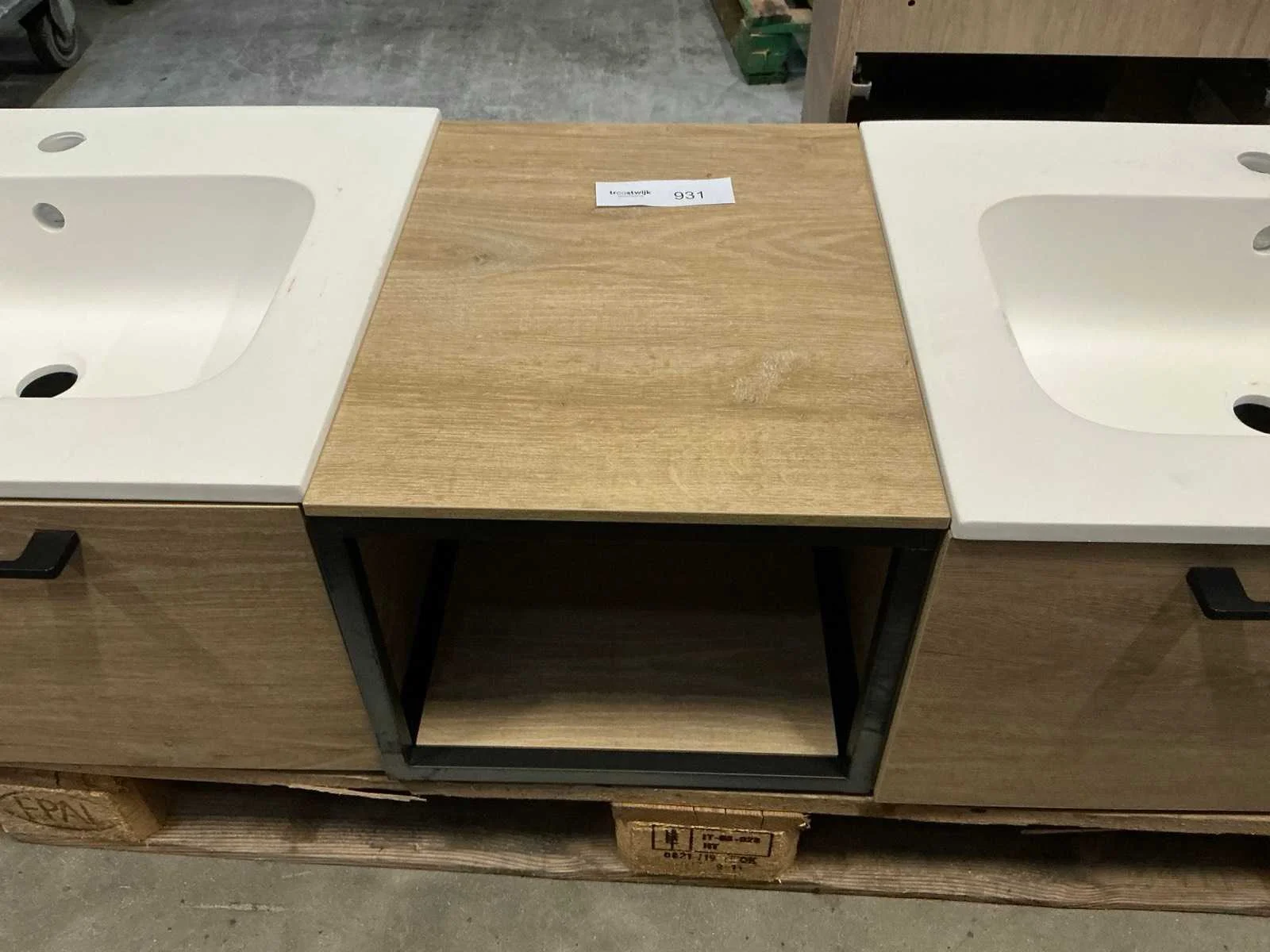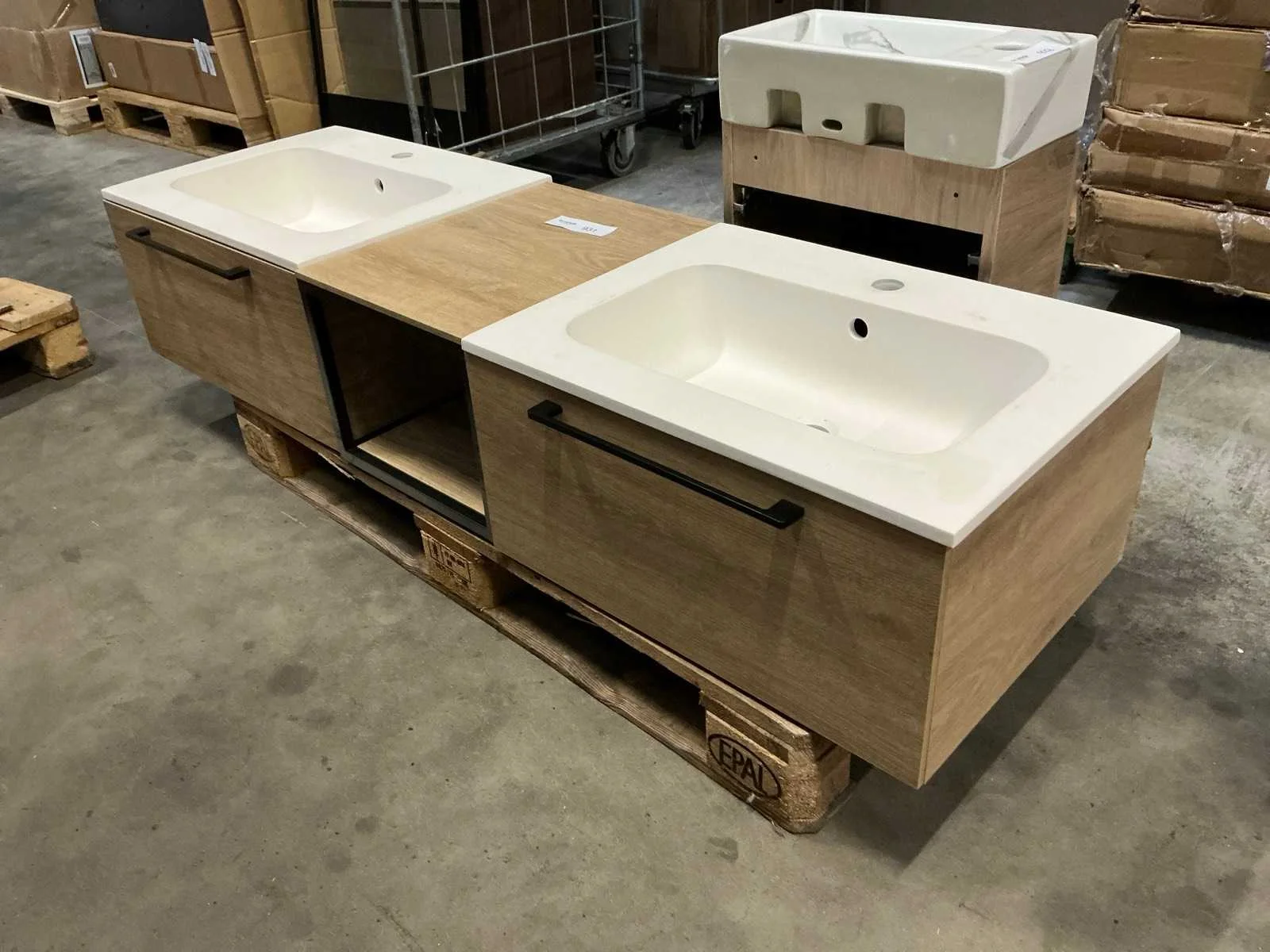 Merk: INK Hoogte: 30cm Lengte: 156cm Breedte: 46cm Materiaal: Hout Kleur: Oak meubel met witte spoelbakken Wastafel: 2x met kraangat en waste Lades: 2 Softclose: true