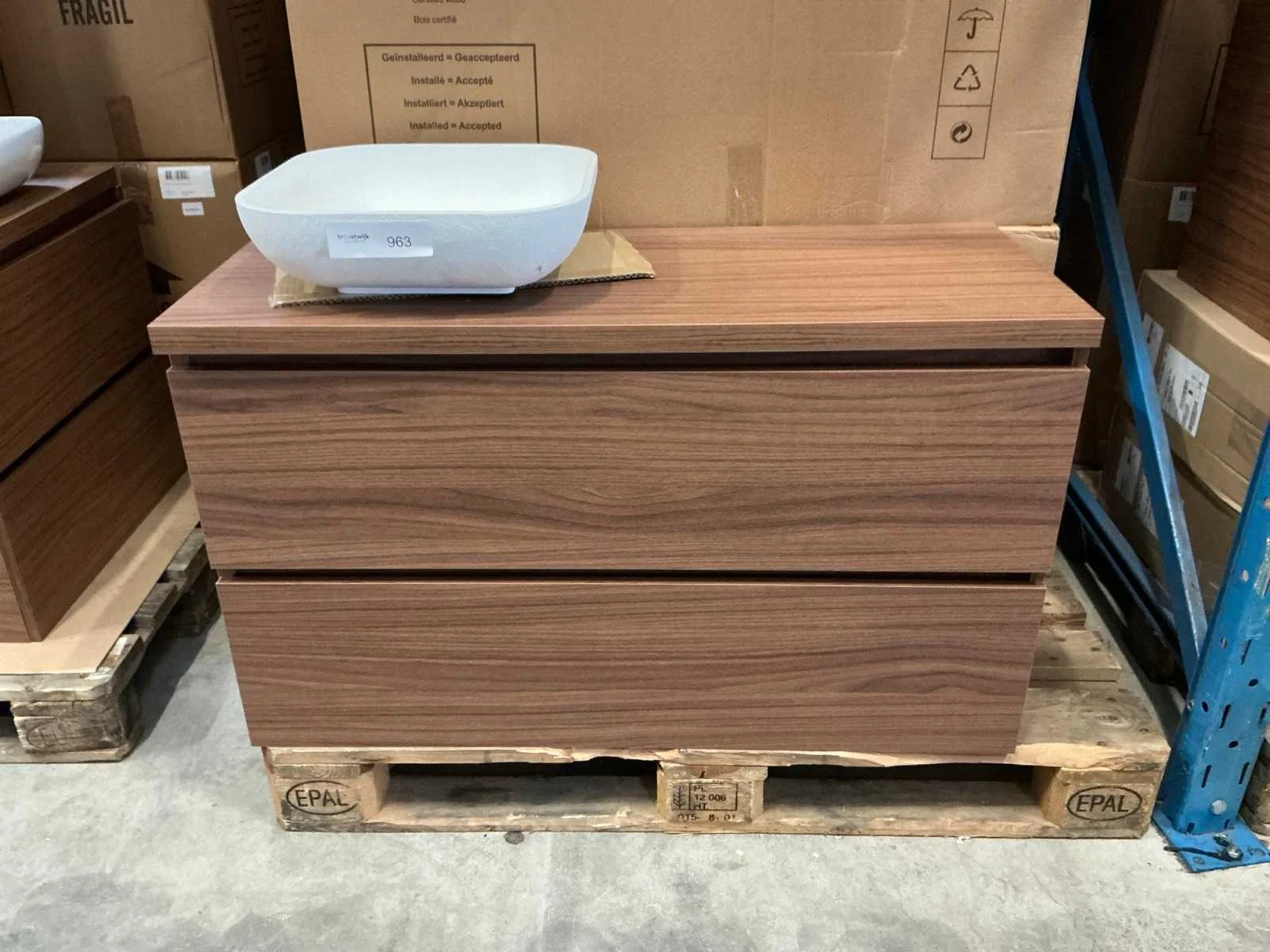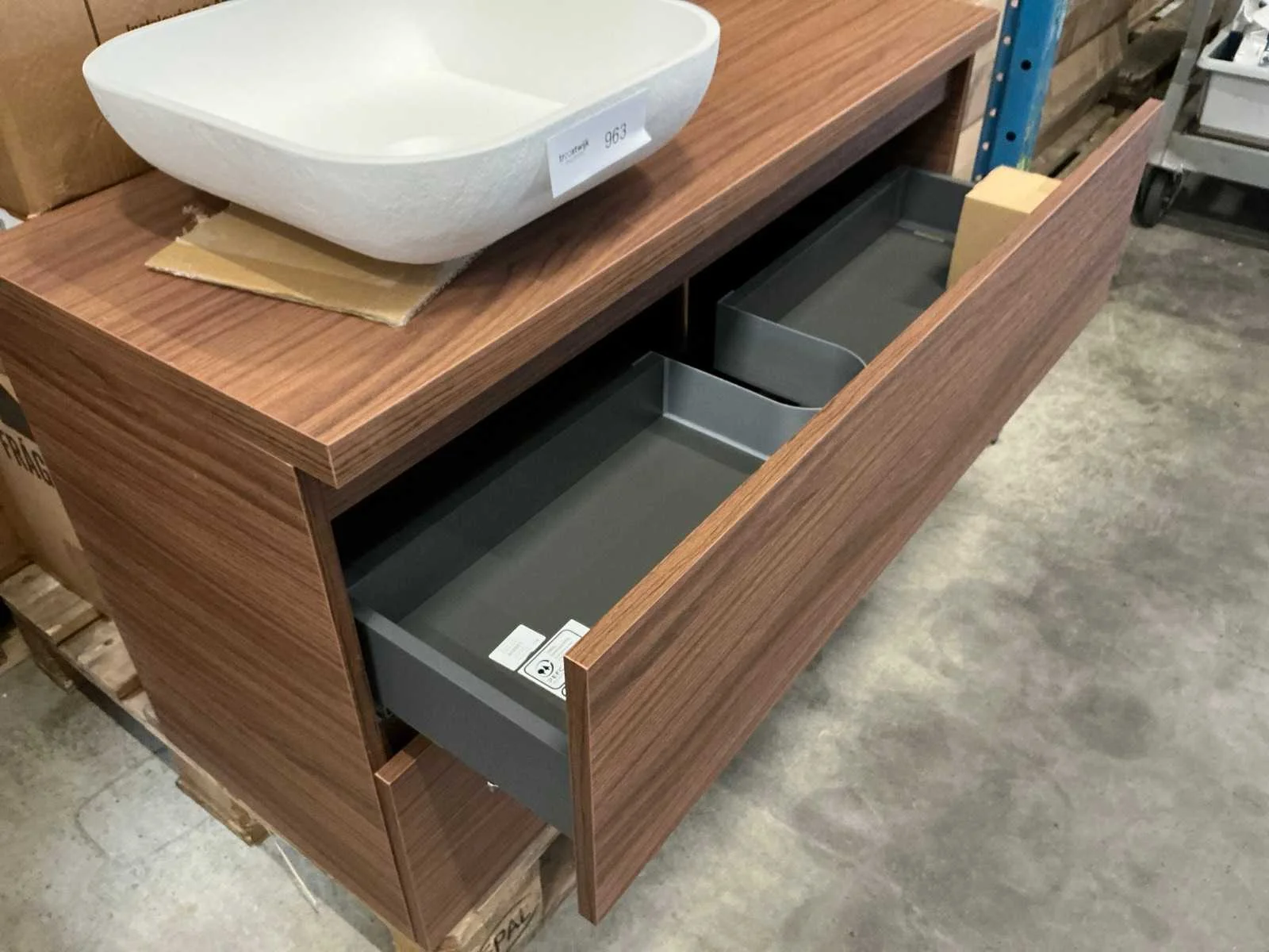 Merk: Riho Model: Spring Hoogte: 64cm Lengte: 100cm Breedte: 46cm Materiaal: Hout en keramiek Kleur: Oak Waskom: Ja, 38x38cm Onderkast: Ja Lades: 2 Softclose: true