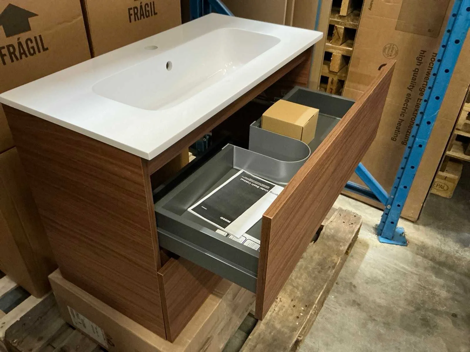 Merk: Riho Model: Spring Hoogte: 64cm Lengte: 80cm Breedte: 46cm Materiaal: Hout en keramiek Kleur: Oak Wastafel: Ja, met kraangat en waste Onderkast: Ja Lades: 2 Softclose: true